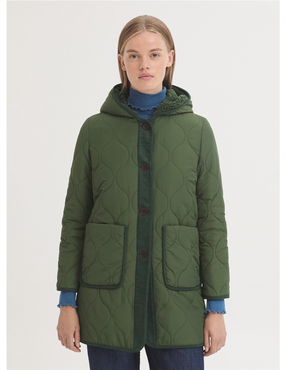 Trench acolchado en tejido mezcla de nailon repelente al agua. Tapeta y vivos en micropana. Capucha, botonadura frontal y bolsillos de parche. Forrado con borreguito.