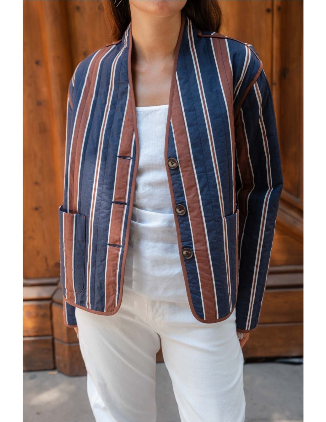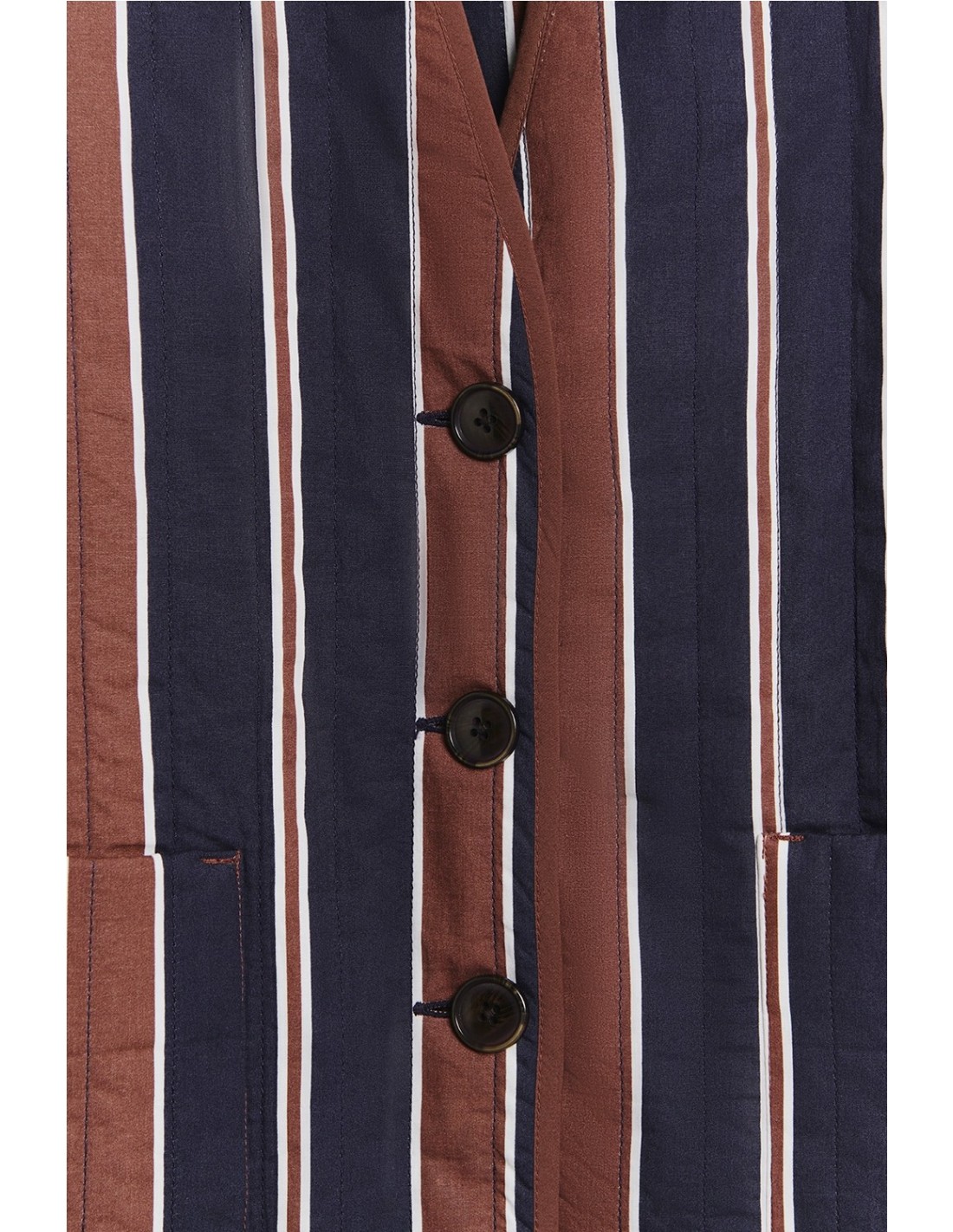 Chaqueta acolchada ligera de 100% algodón BCI de la marca Ese O Ese. Con estampado rayas en color azul marino y marrón. Cuello doblado. Bolsillos plastrón. Cierre botones. Largo prenda para talla S: 59 cm.