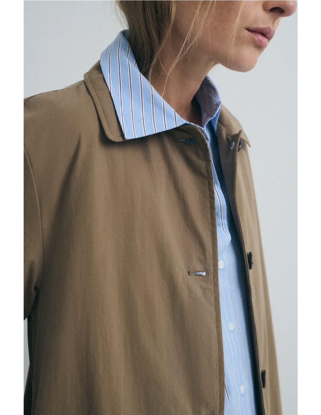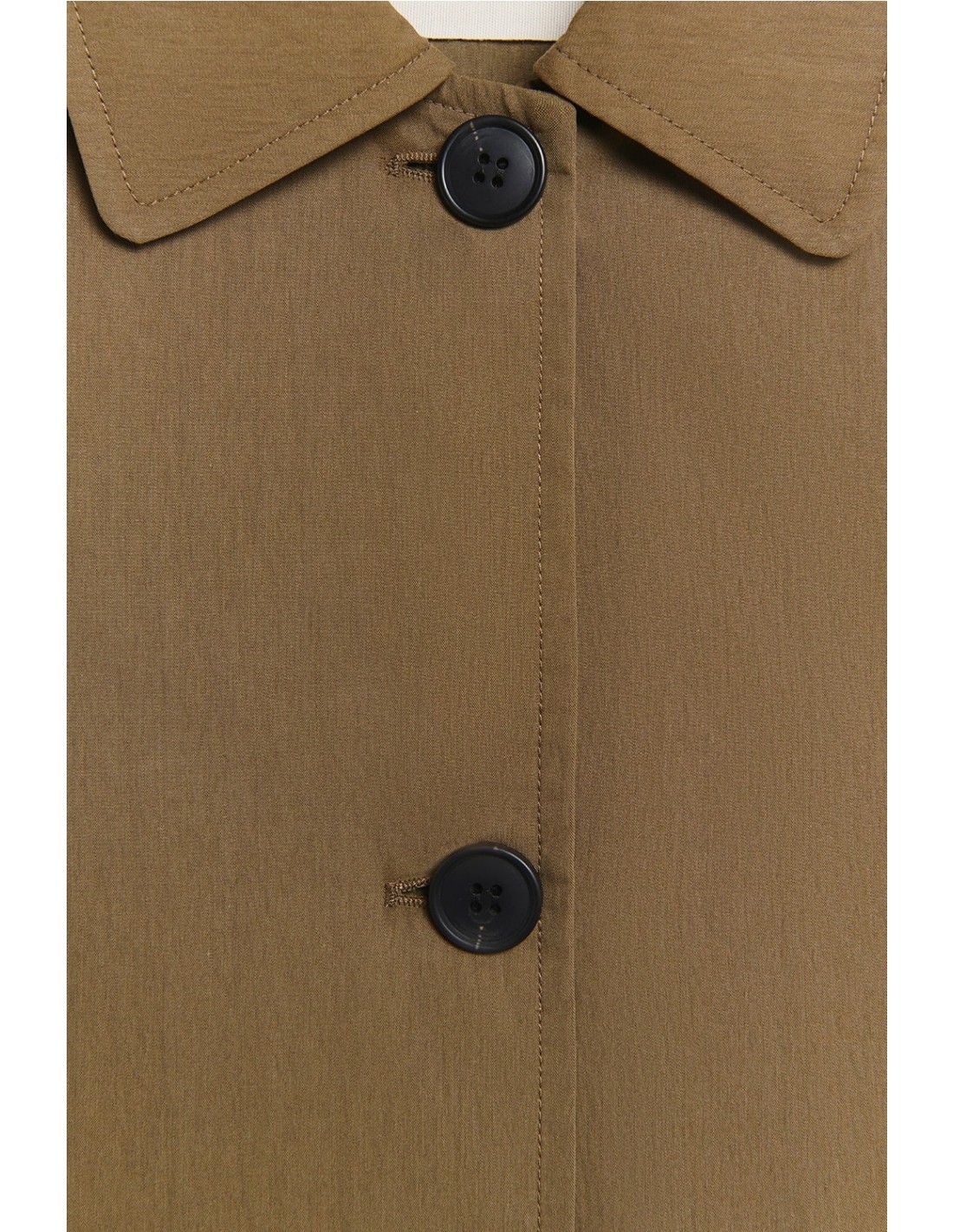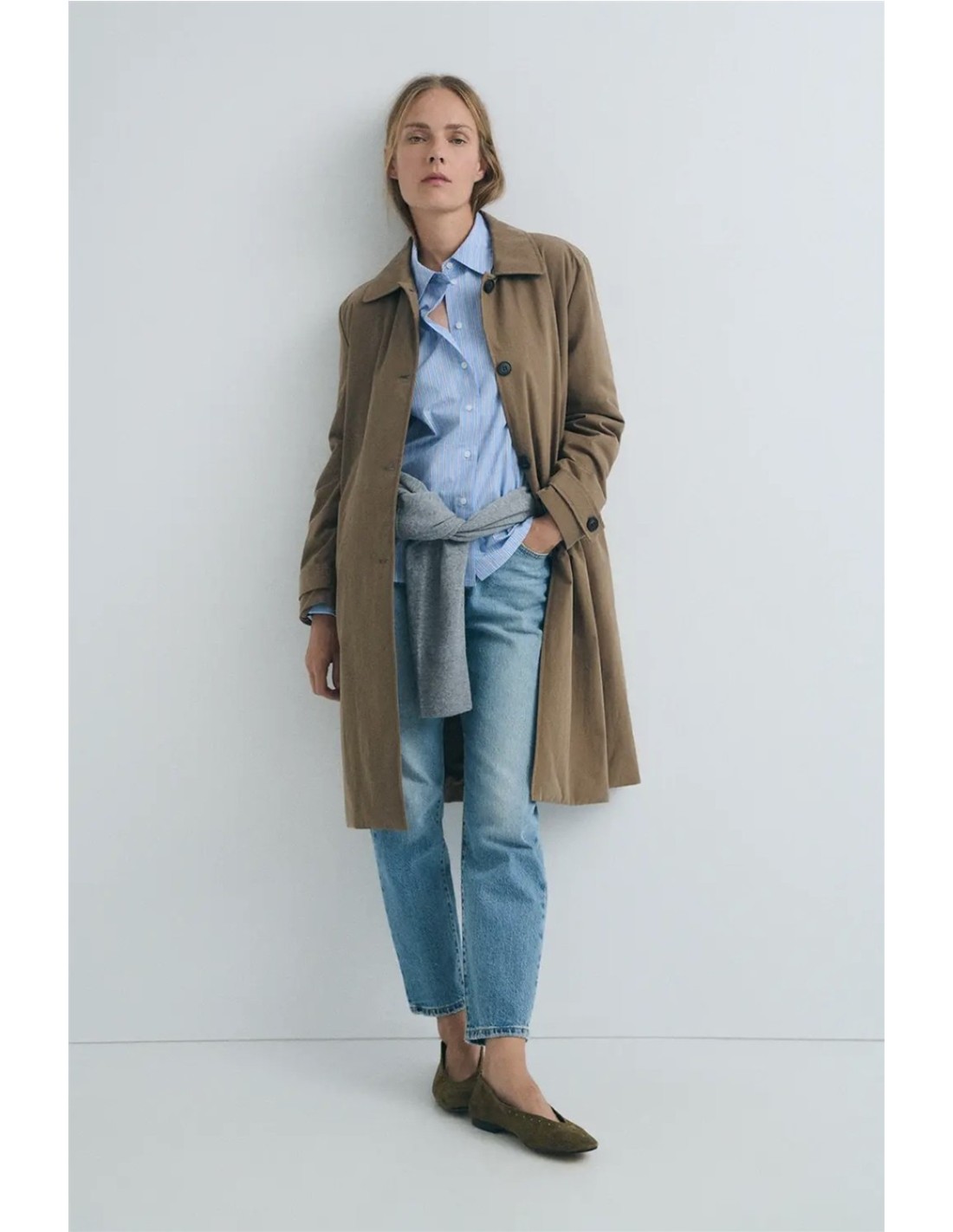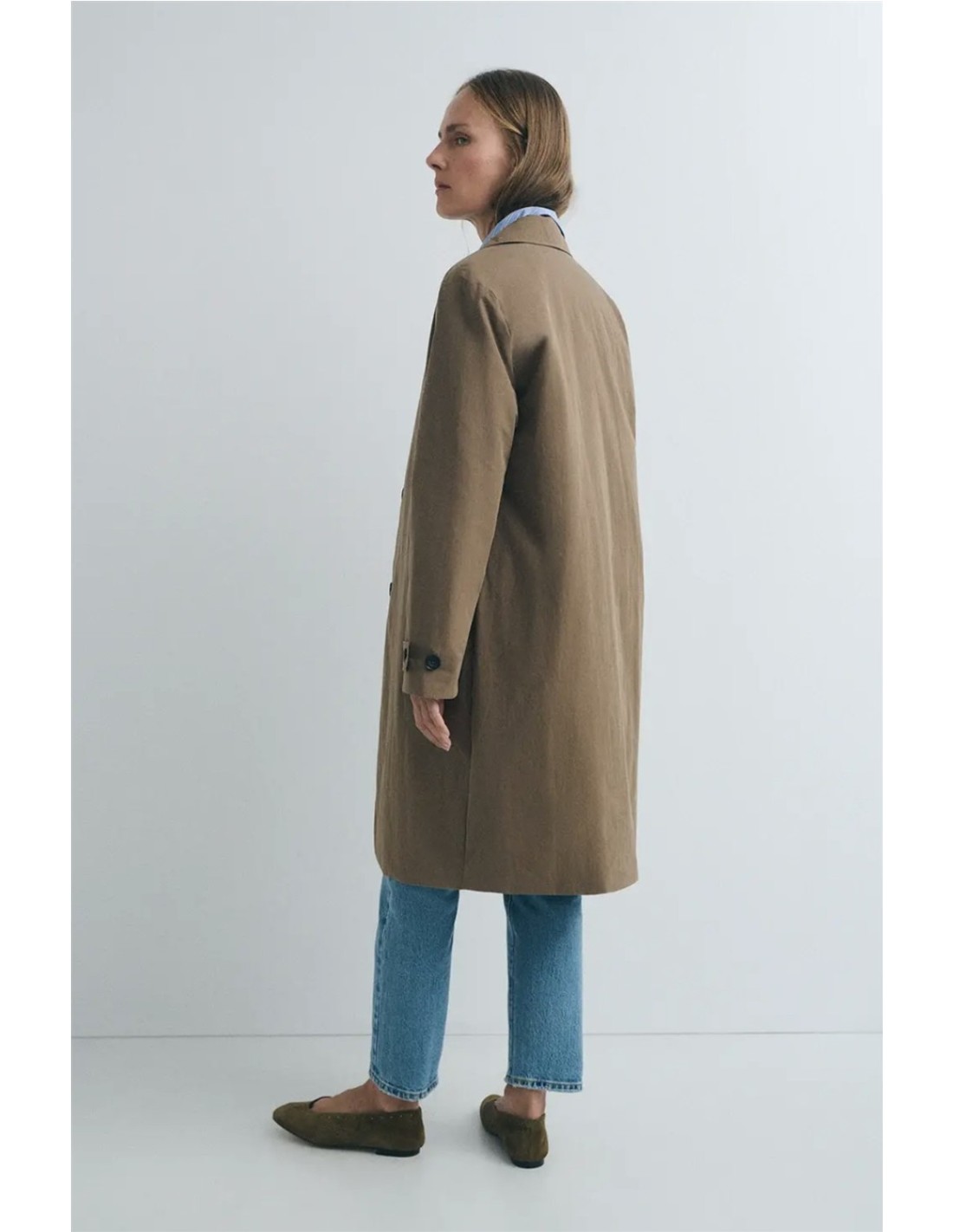 Trench acolchada de abotonadura simple de la marca Ese O Ese. Hecha de algodón y nylon reciclado. Relleno de poliéster reciclado. Laminado DWR grado 4, resistente a la lluvia y la nieve. Lavado tintorería recomendado.