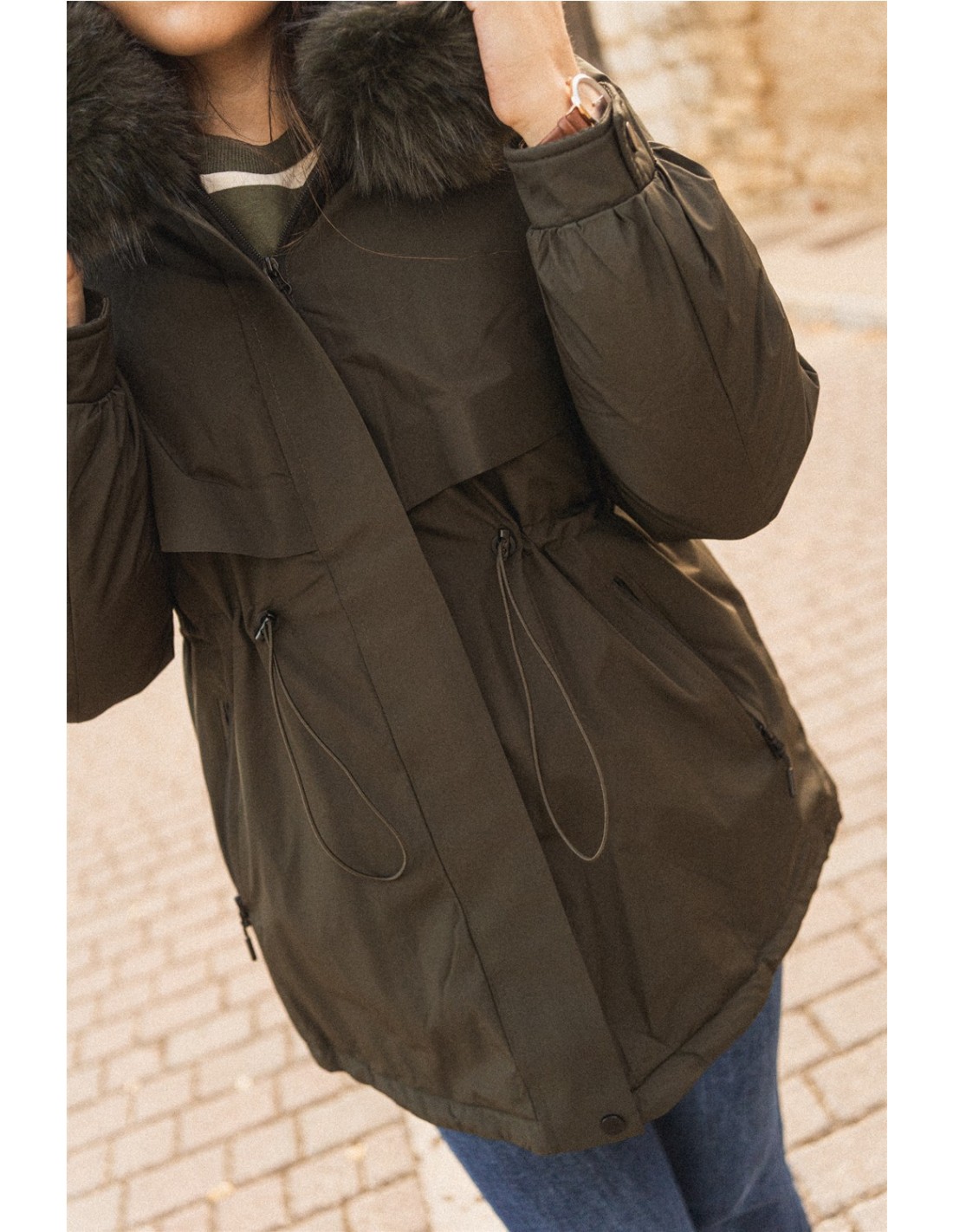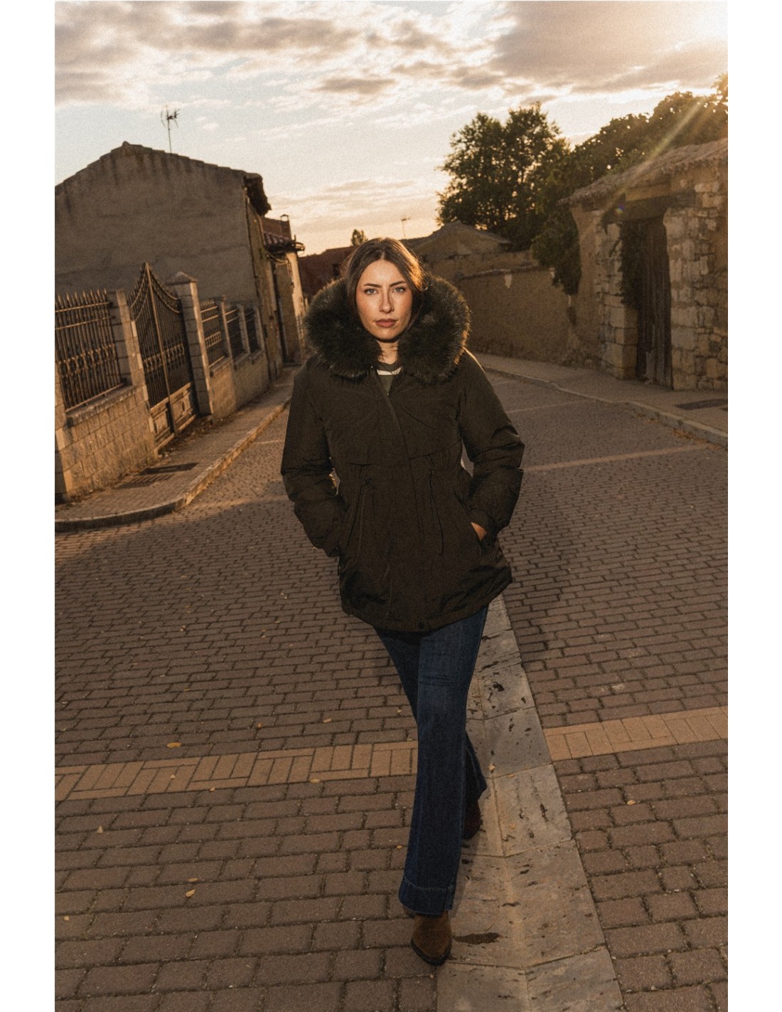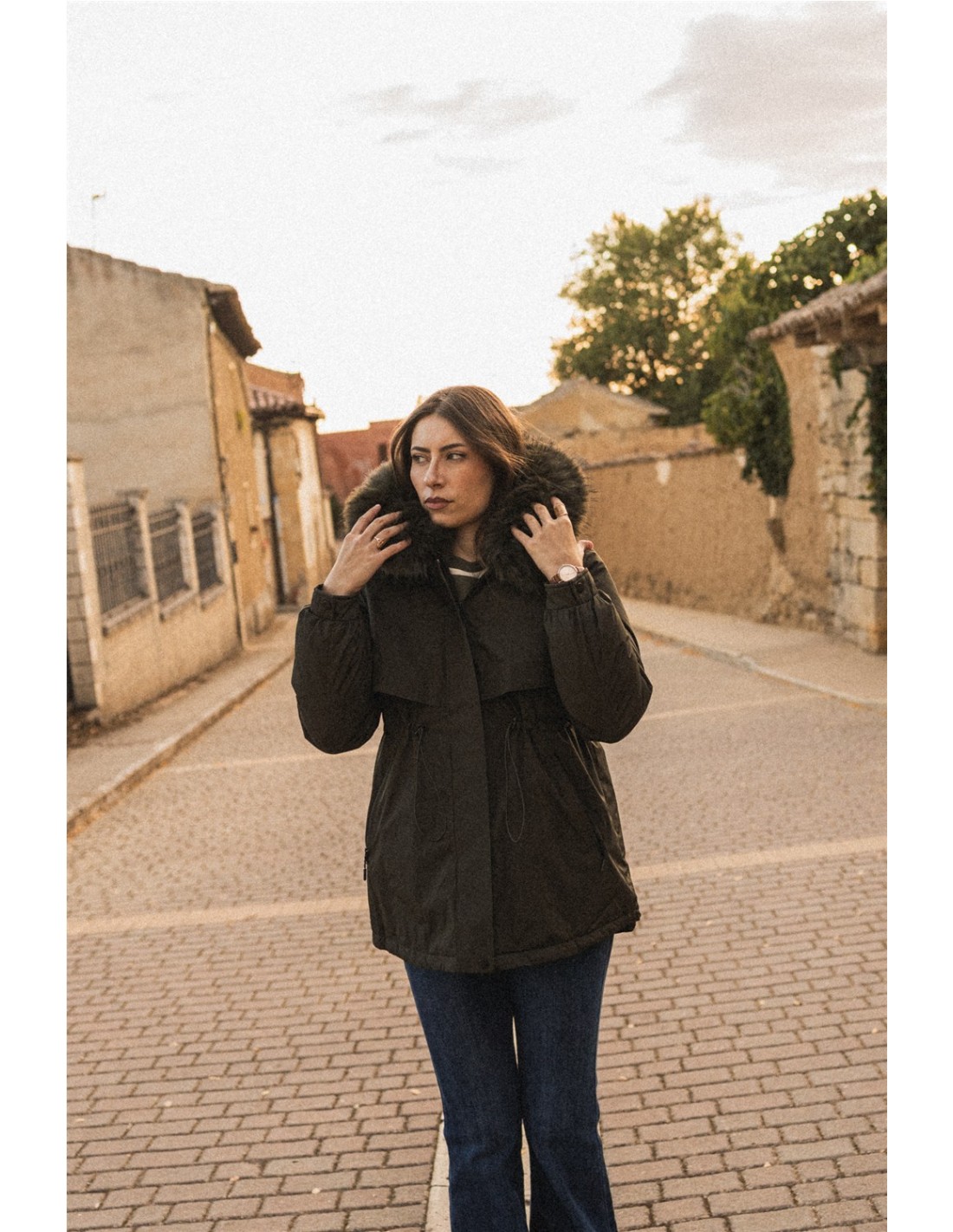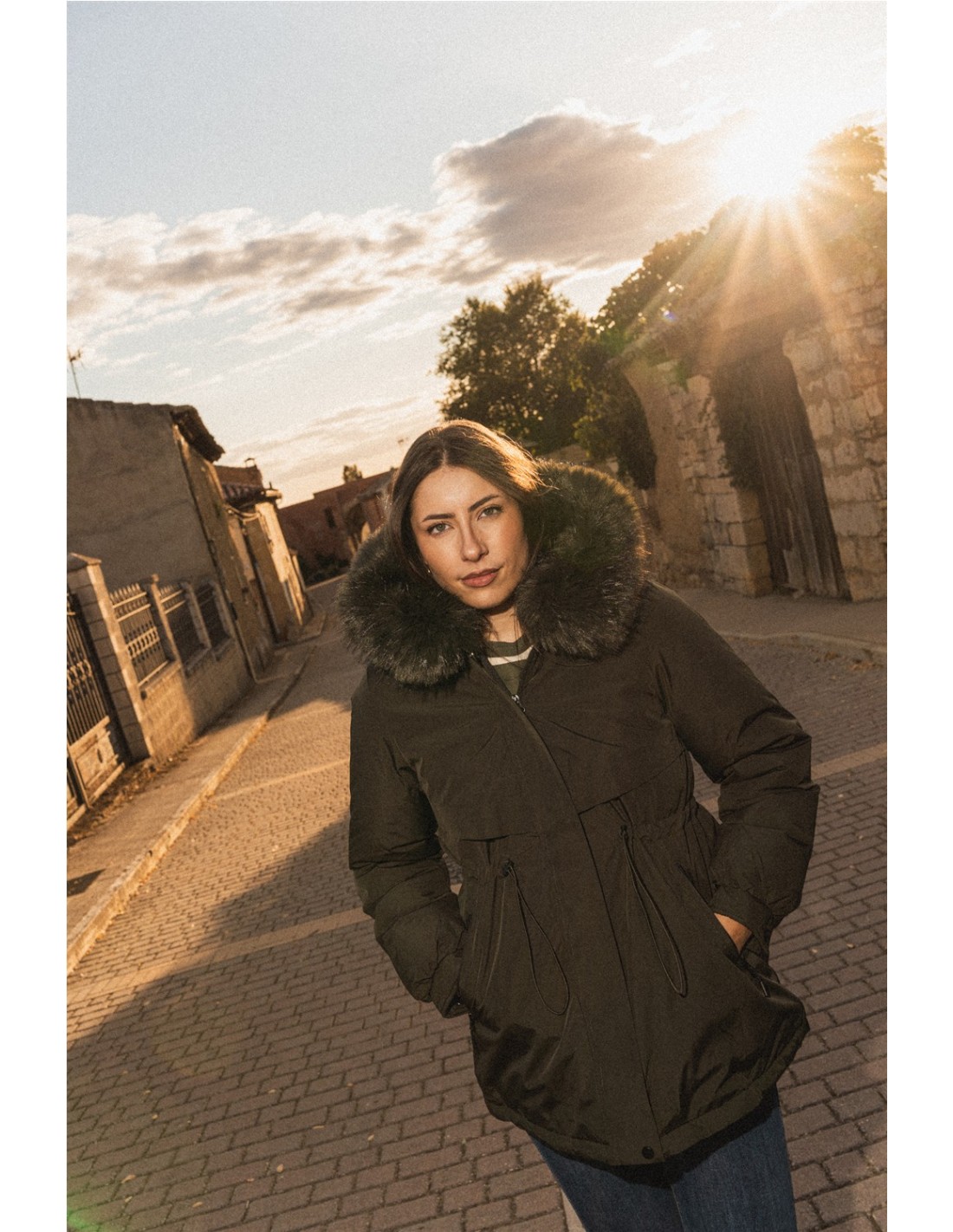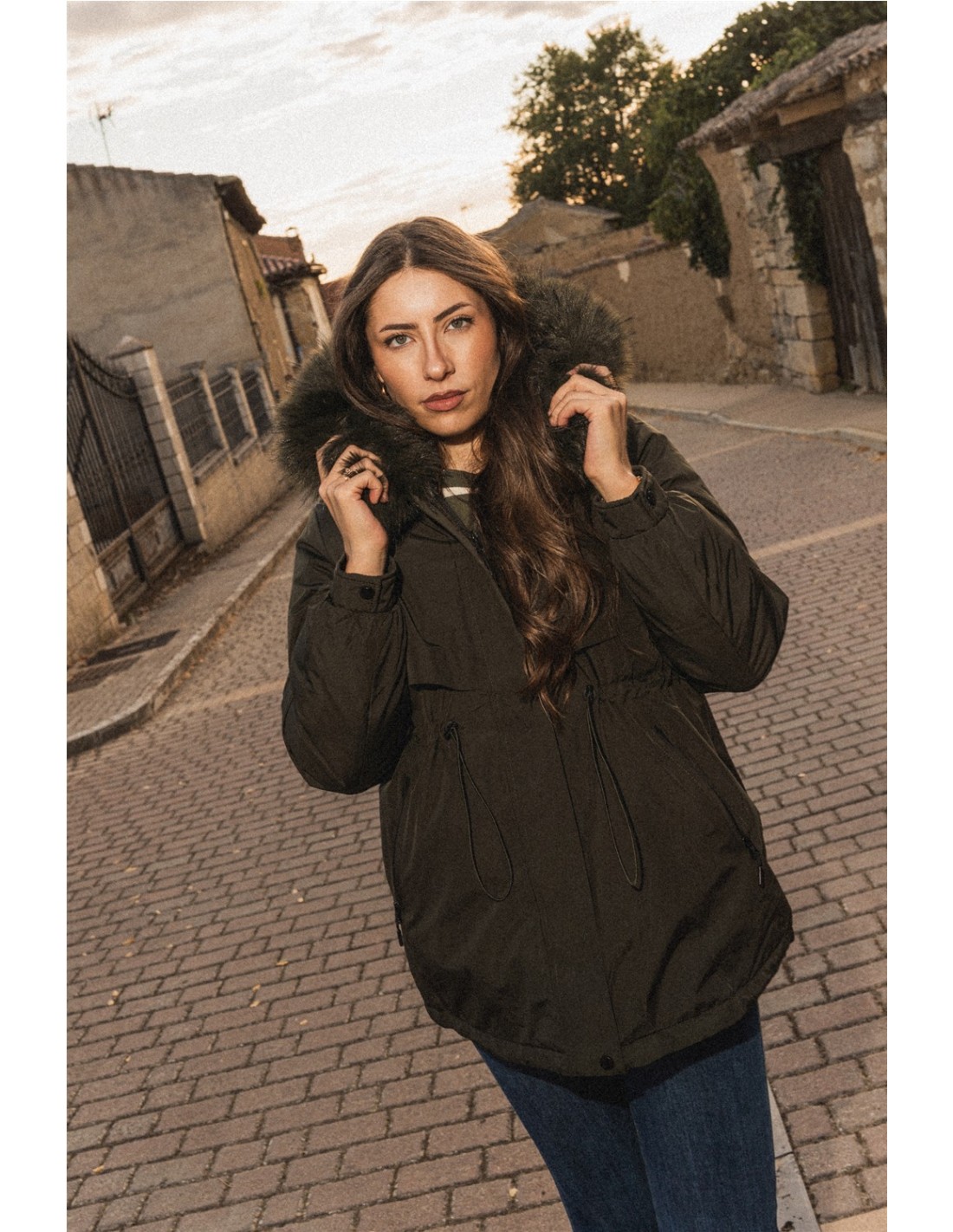 Abrigo repelente al agua con cintura ajustable, canesú superior, capucha con pelo desmontable y cierre mediante cremalleras. Todo el forrado de pelo en el interior. Disponible en tres colores