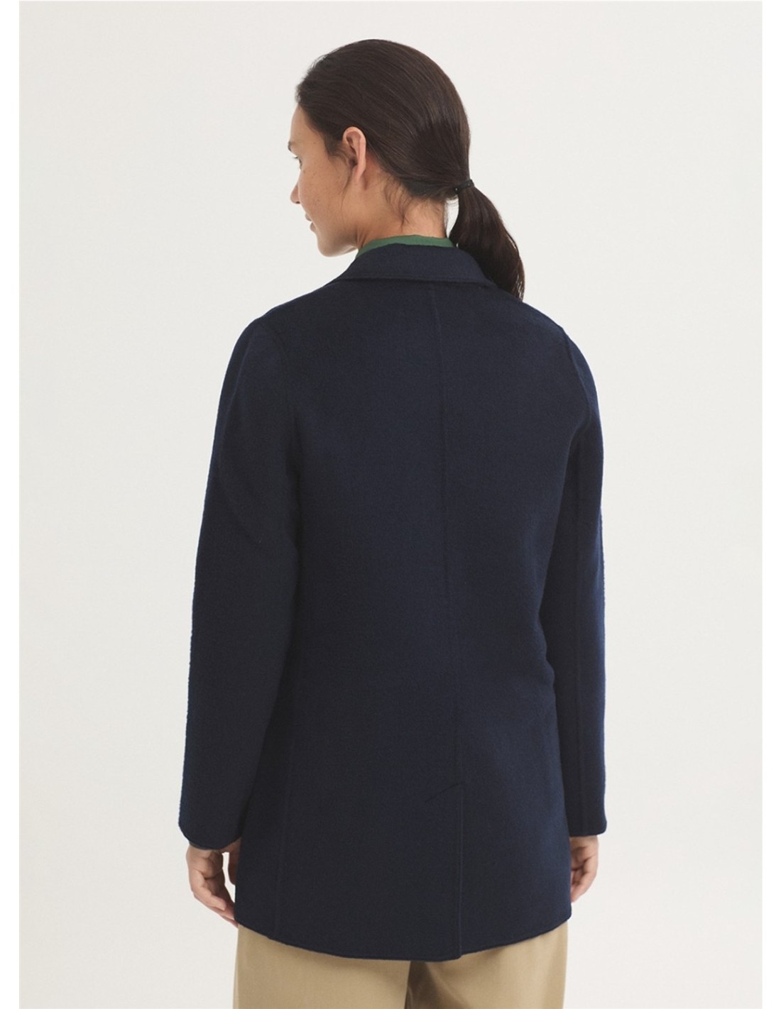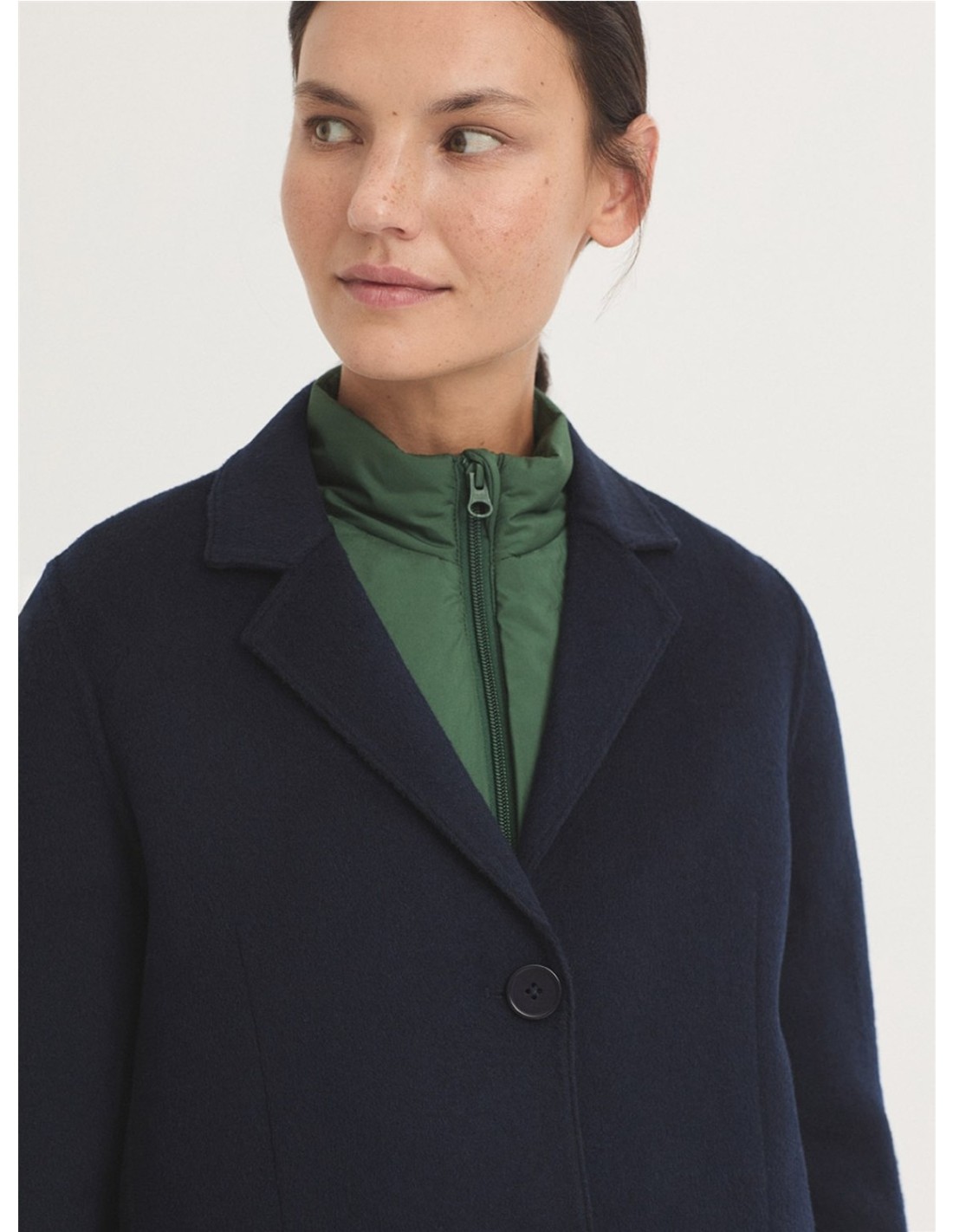 Chaquetón en tejido doble faz de mezcla de lana con chaleco desmontable repelente al agua de la marca Nice Things. El chaquetón tiene cuello con solapa, botonadura frontal y bolsillos de vivo en color azul marino. El chaleco acolchado incluye cuello alto, cremallera frontal y bolsillos en costura todo ello en color verde.