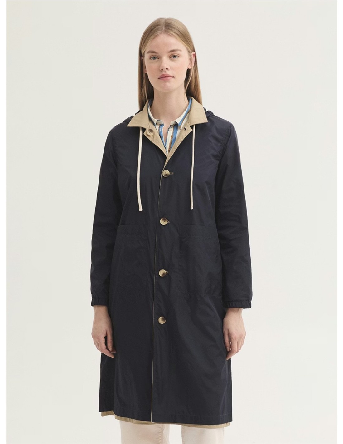 Trench reversible con efecto doble prenda. Exterior en tejido de algodón y nailon repelente al agua con cuello camisero, botonadura frontal y bolsillos de vivo. Interior en tejido 100% nailon repelente al agua, con bolsillos de parche, capucha y puños con goma interior.