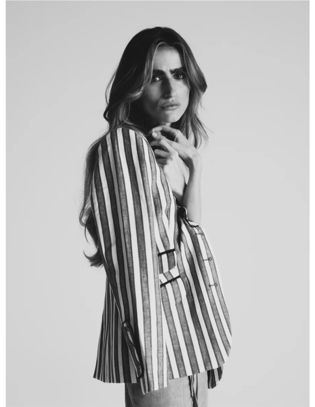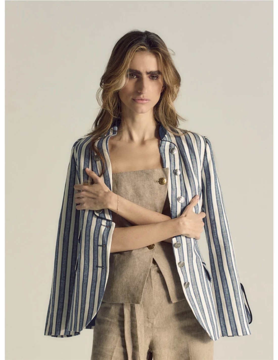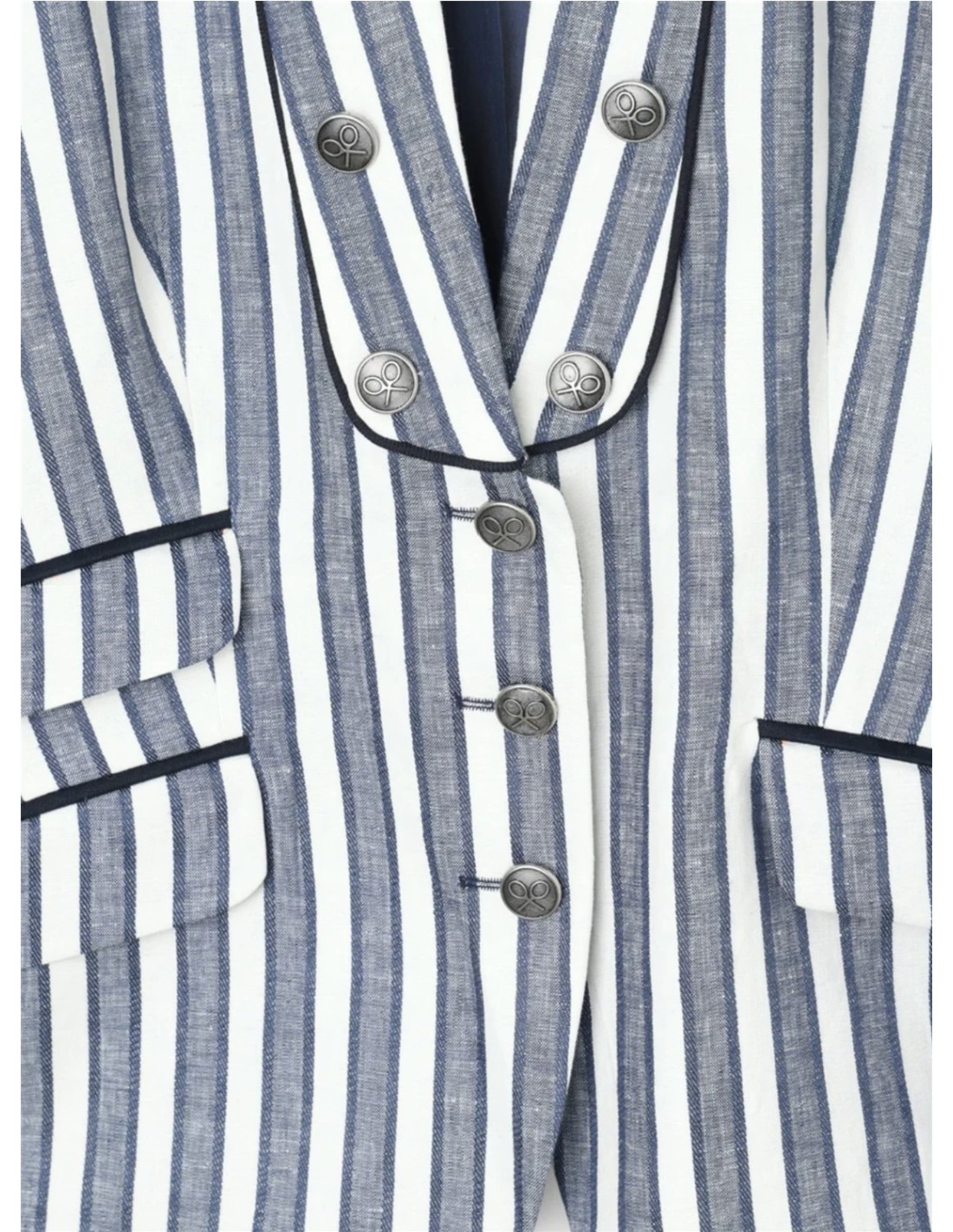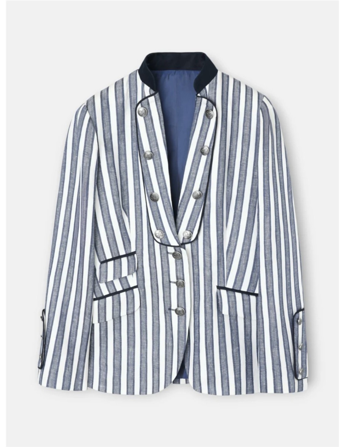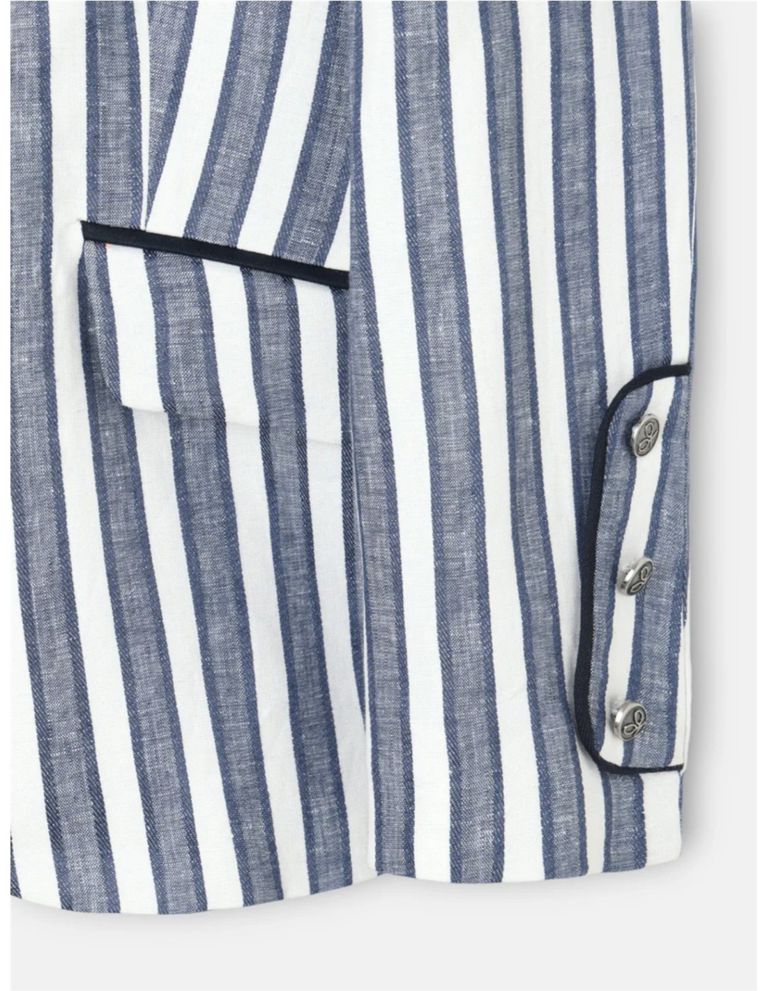Americana estilo marinero confeccionada en mezcla de lino y algodón, estampada con rayas azules. Presenta cuello a contraste en azul marino y solapas con adorno de botonadura personalizada en dorado. Cuenta con bolsillos de doble vivo con solapa, uno al costado derecho y doble en el izquierdo. Empuñadura adornada con botonadura viveada a juego con la solapa y botones personalizados. Fabricada en España.