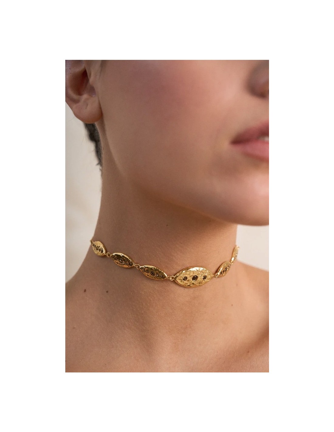 Su diseño ajustado al cuello resalta la línea del escote y aporta una presencia poderosa y sofisticada. La gargantilla evoca el carácter de las reinas mesopotámicas: atemporal, radiante y simbólica.