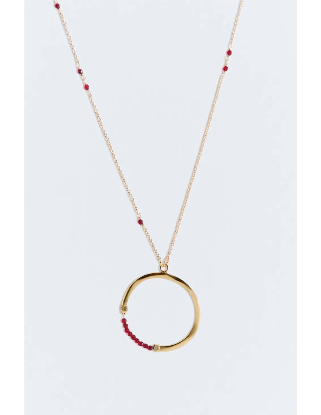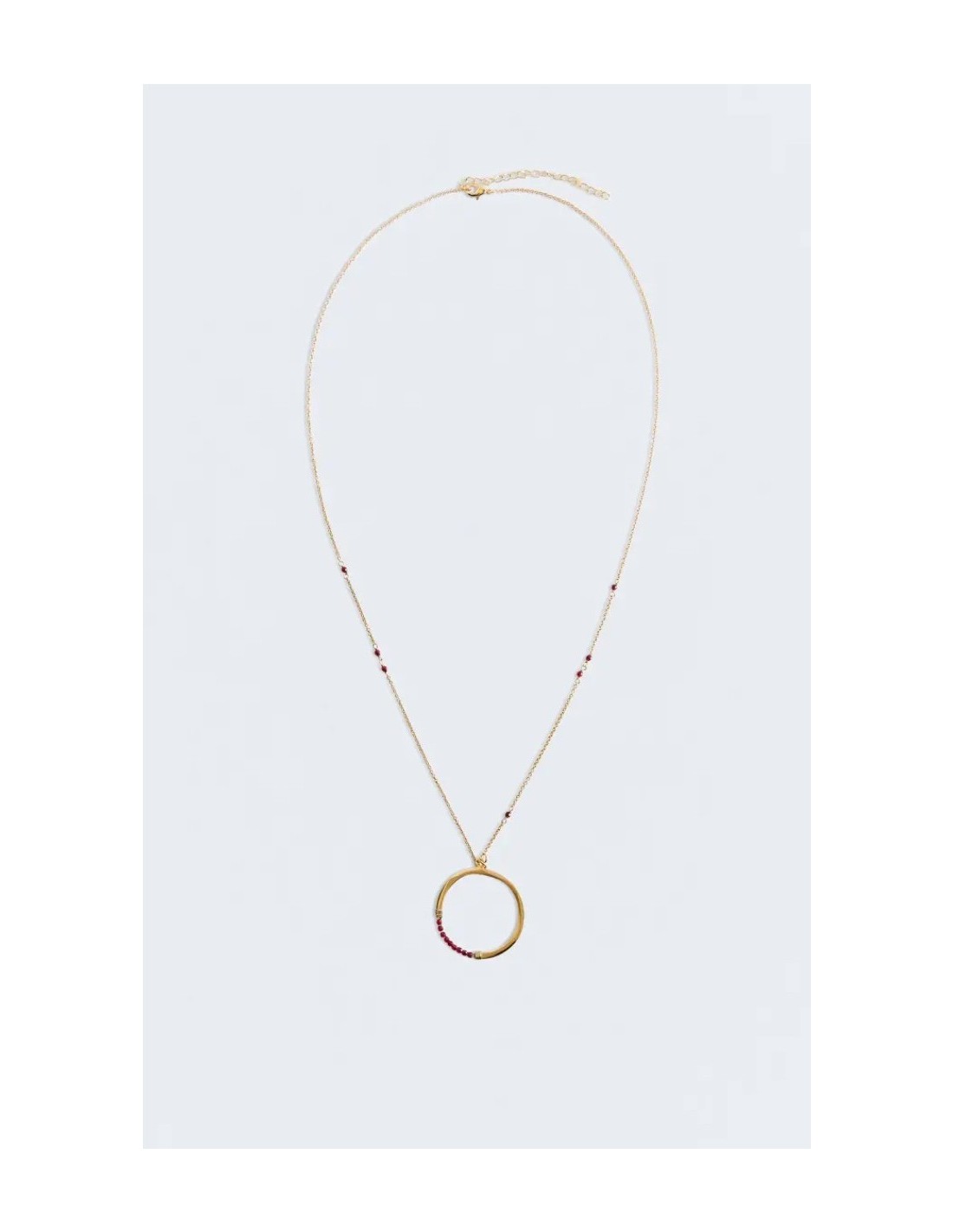 Collar de cadena bañada en oro de 0,5 micras. El baño de oro se aplica sobre una base de latón mediante un proceso electrolítico, lo que aporta mayor resistencia y durabilidad al acabado. Con beads de cristal en color rojo y charm circular de 3 cm con los mismos cristales. Cierre con mosquetón. Medidas: 62 cm + 6 cm de cadena ajustable.