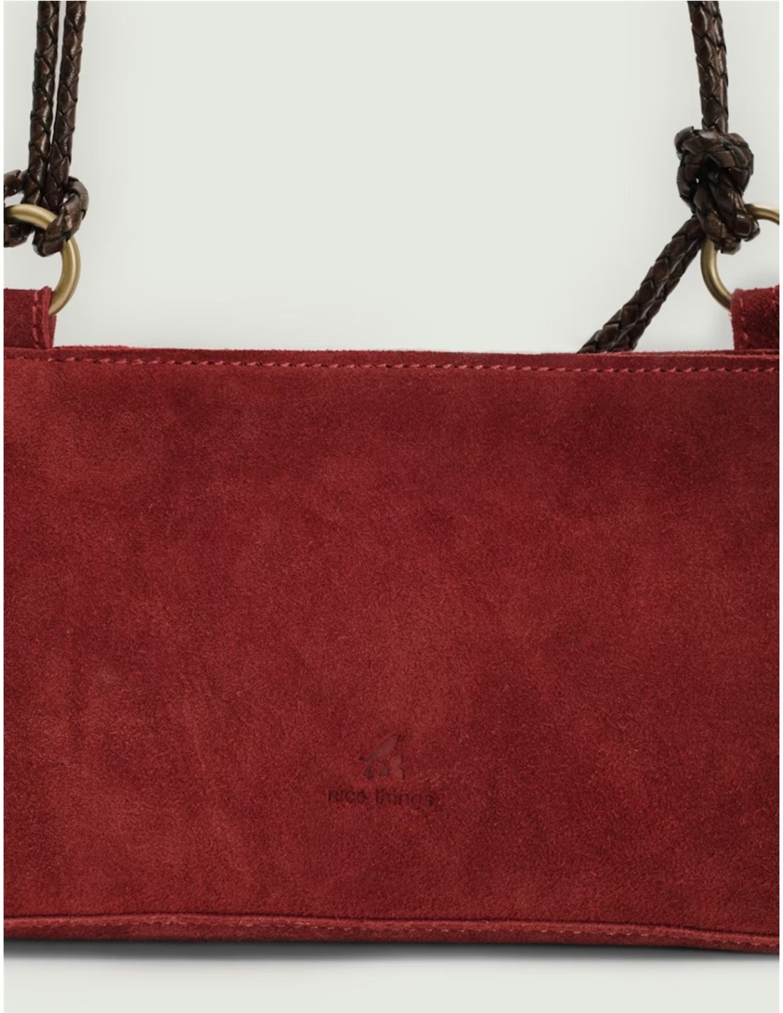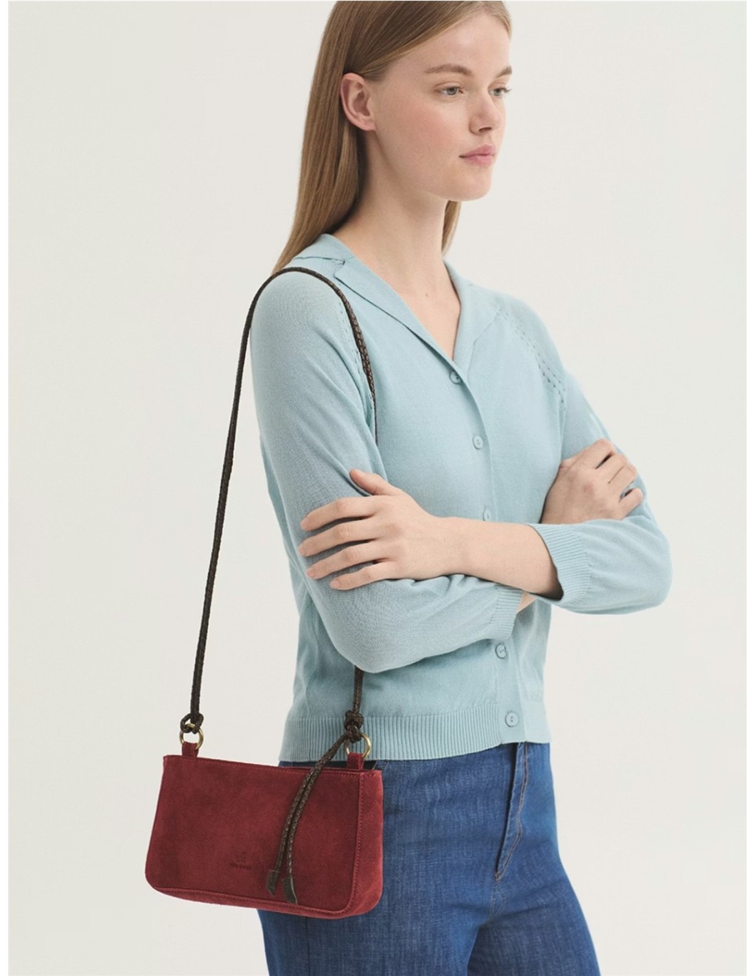 Bandolera en piel con asa tubular trenzada, regulable. Cuenta con cierre de cremallera, bolsillo interior y logo grabado. Medidas: 14 cm de alto × 23 cm de ancho × 4,5 cm de profundidad.