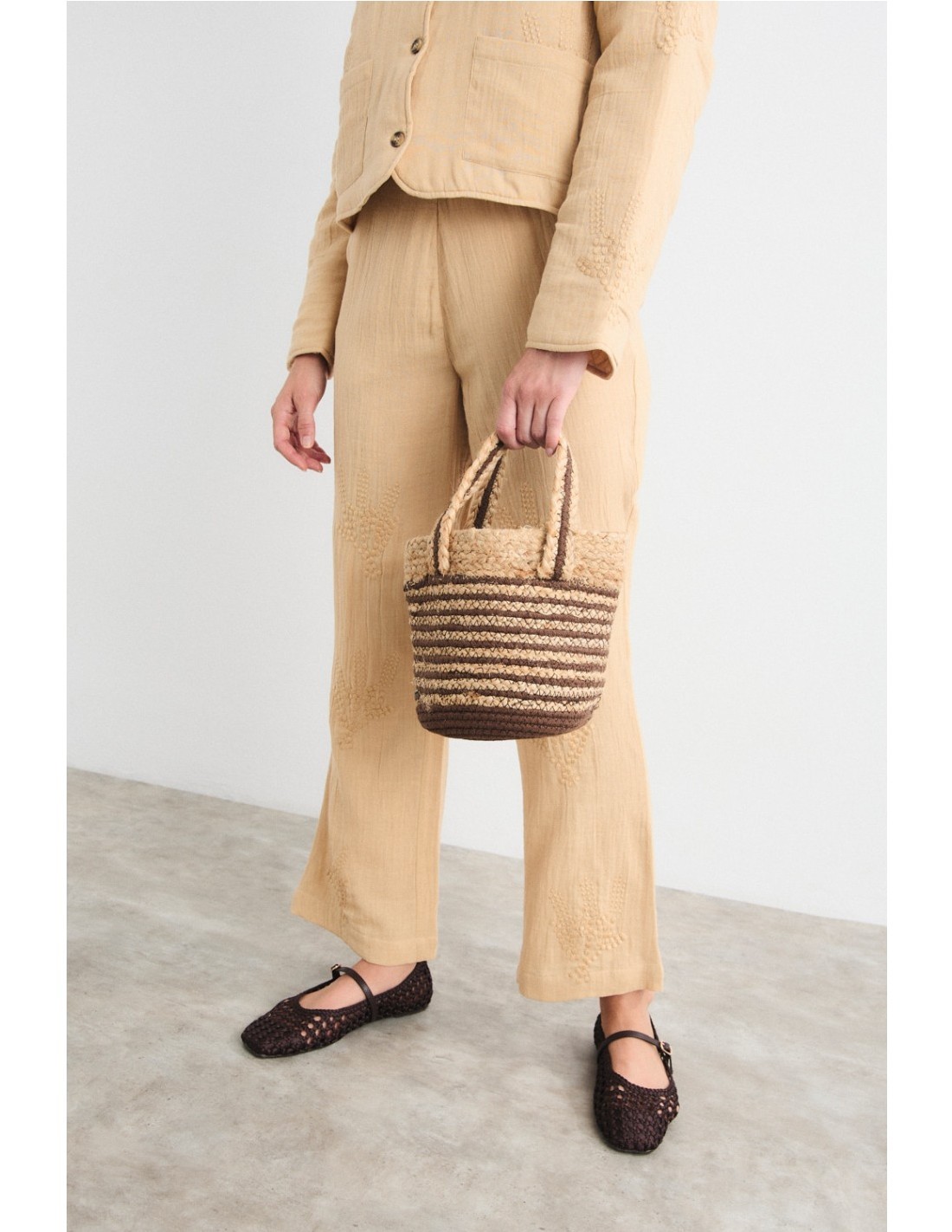 Bolso de forma ovalada confeccionado en rafia natural con franjas trenzadas horizontales en tonos marrón. Cuenta con doble asa superior en rafia a juego con ribete marrón, se puede llevar en la mano.