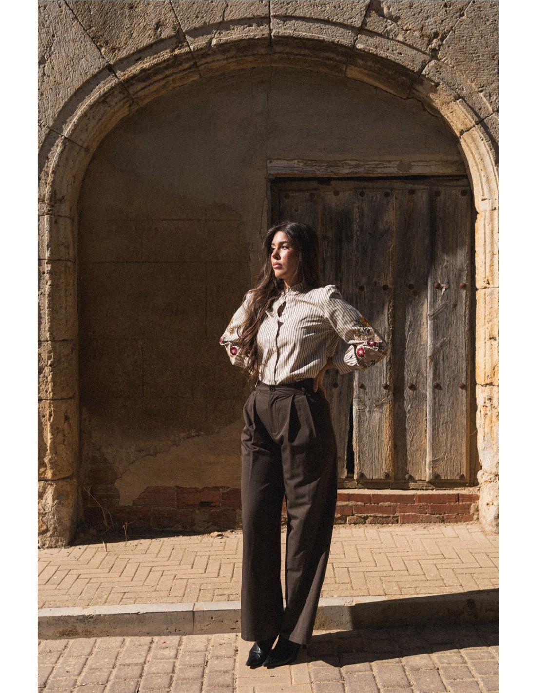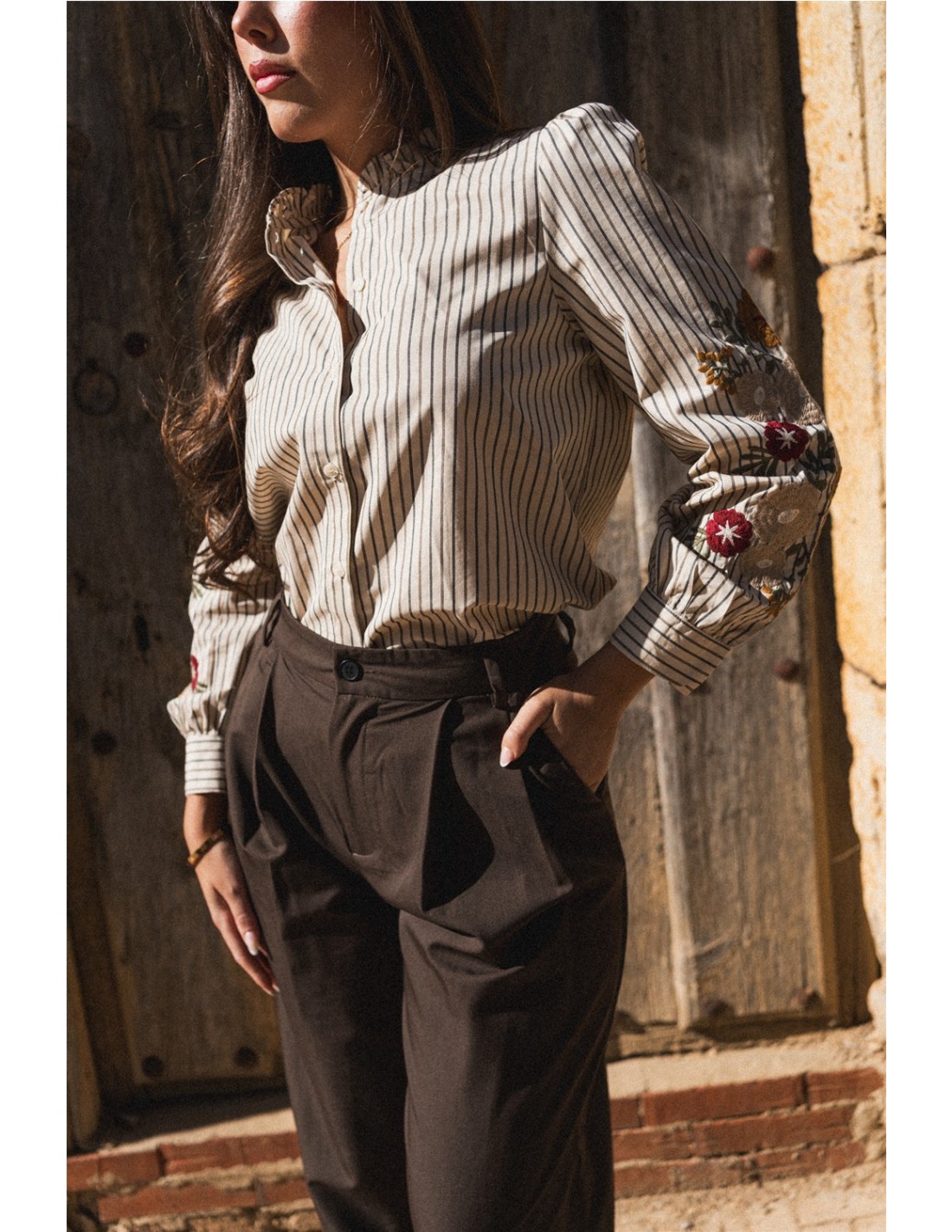 Camisa a rayas fabricada 100% en algodón. Destacan los bordados de las mangas con motivos florales, el cuello mao con detalle de volante y las mangas ligeramente abullonadas con terminación en puño camisero.