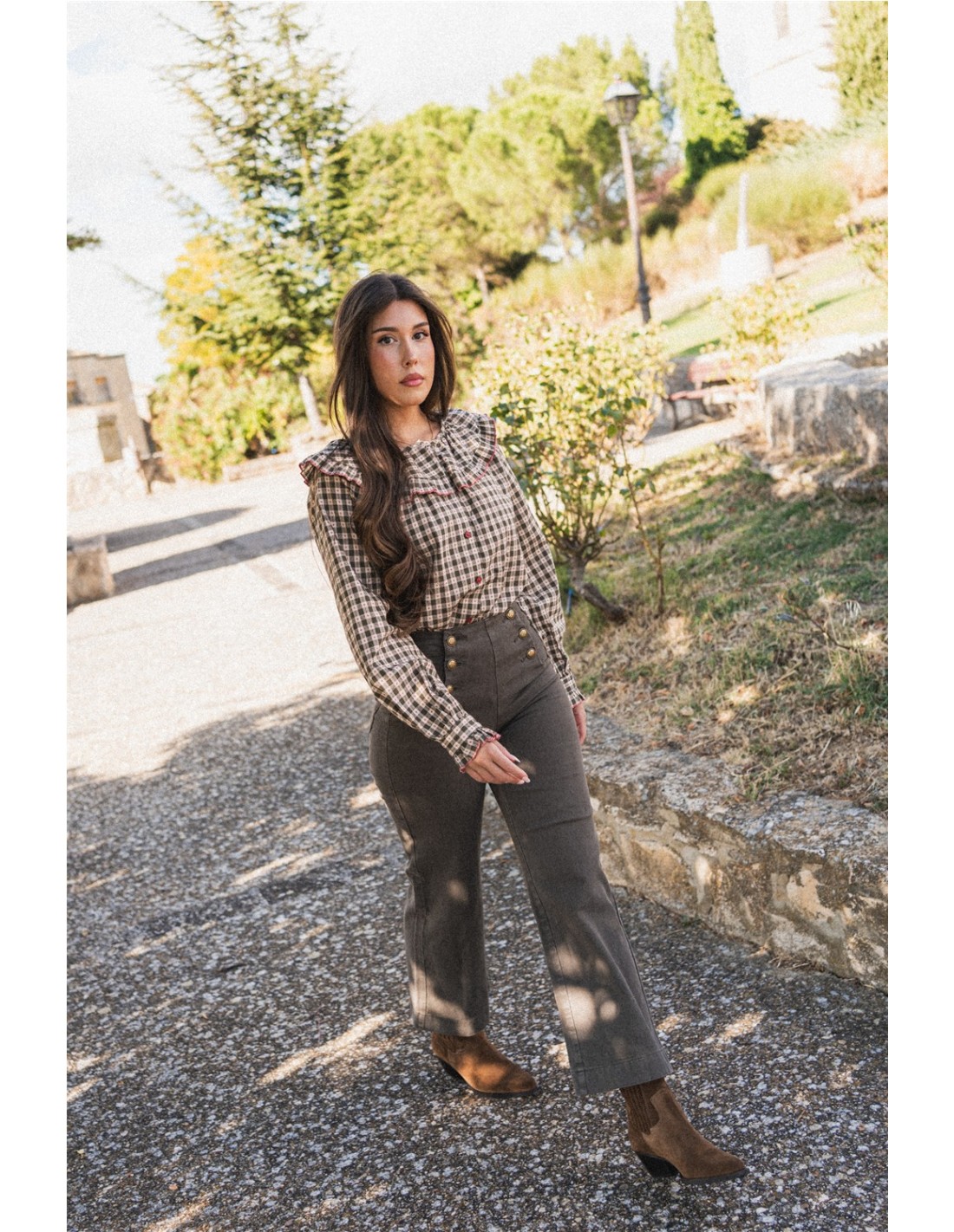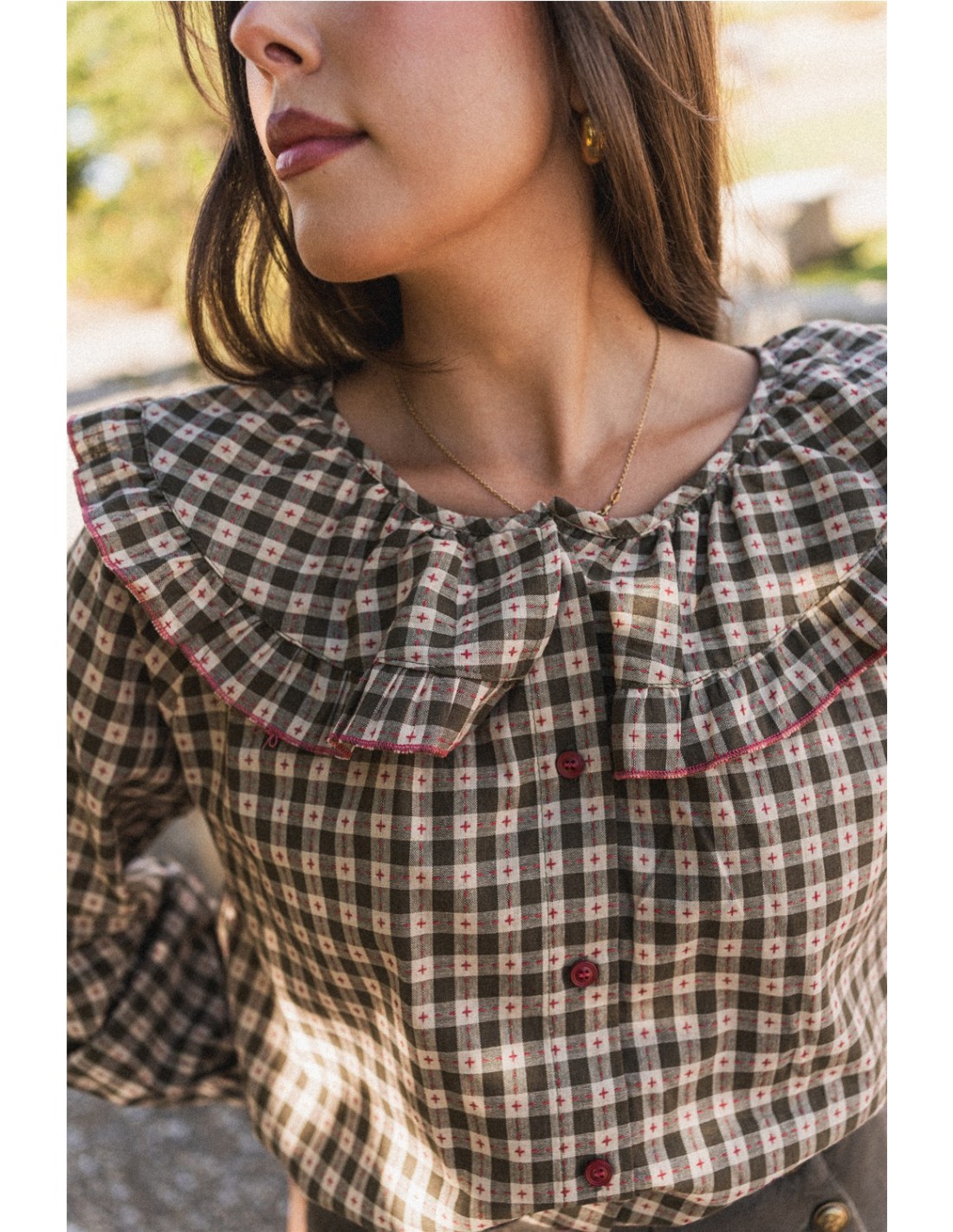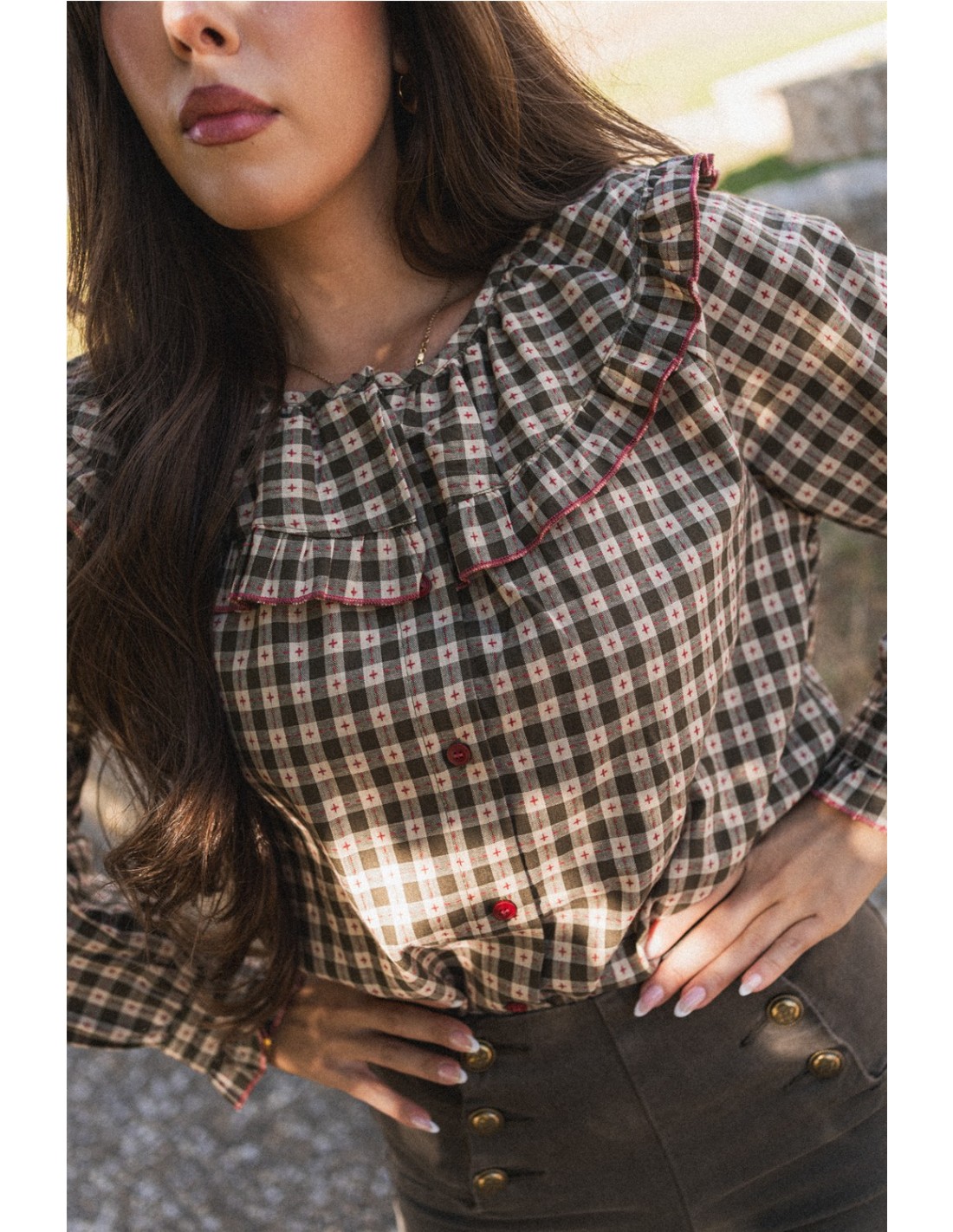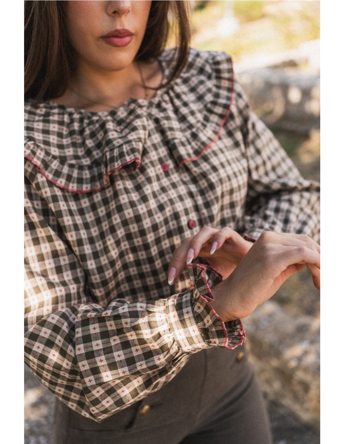 Camisa con pequeños cuadrados en colores verde y beige y detalles en rosa como los botones. Tiene cuello babero, mangas abullonadas y puños rematados con plisado. sin duda una prenda que no pasará desapercibida.