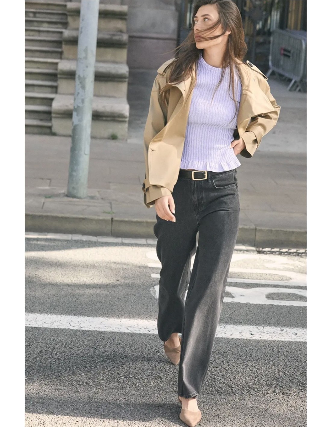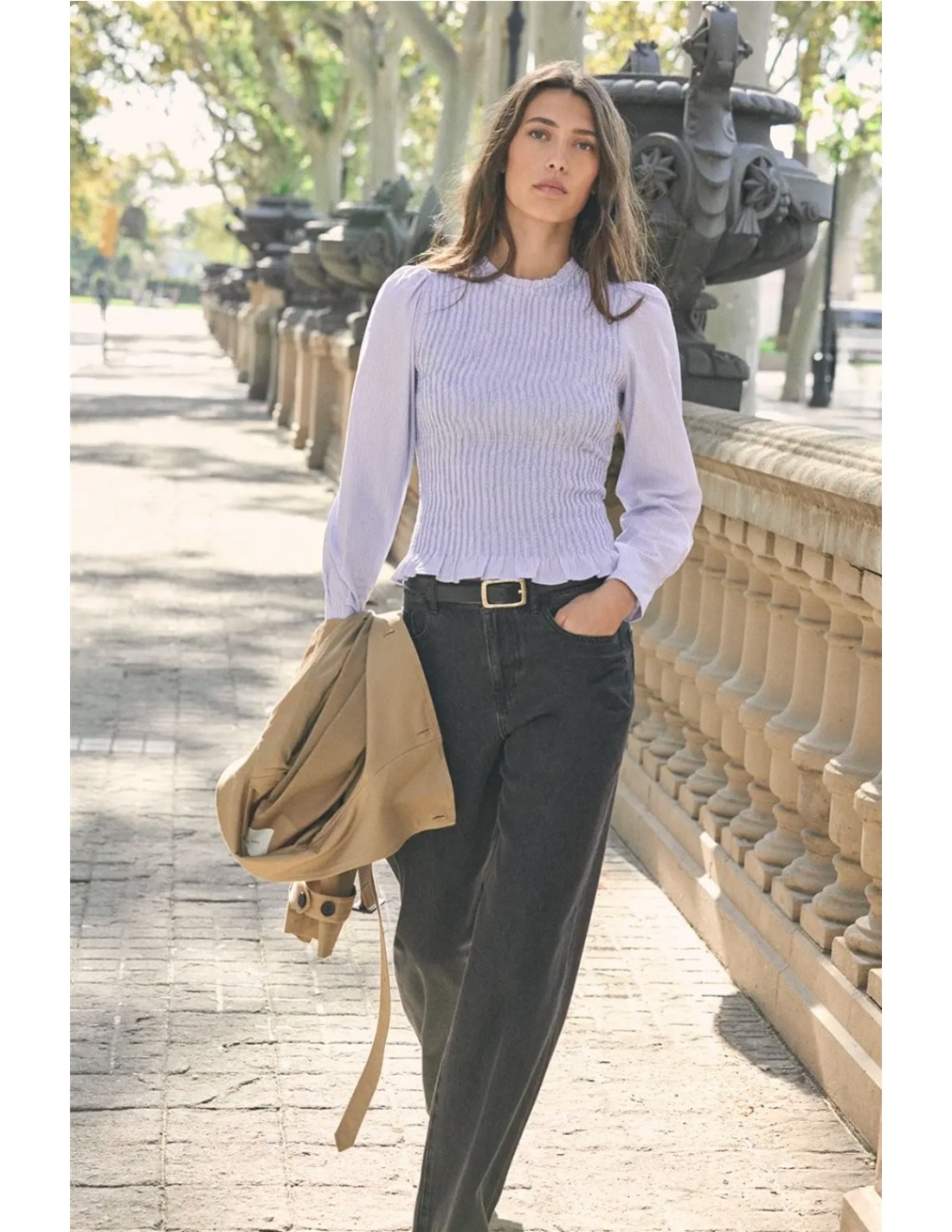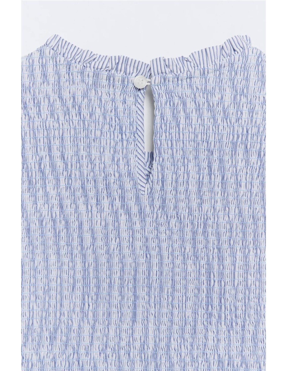 Camisa de rayas hecha en algodón BCI azul claro de la marca Ese O Ese. Diseño nido de abeja en el cuerpo con goma canilla que aporta un relieve y textura distinto. Cuello con volante y manga larga con puños fruncidos. Corte entallado con botón trasero al cuello.