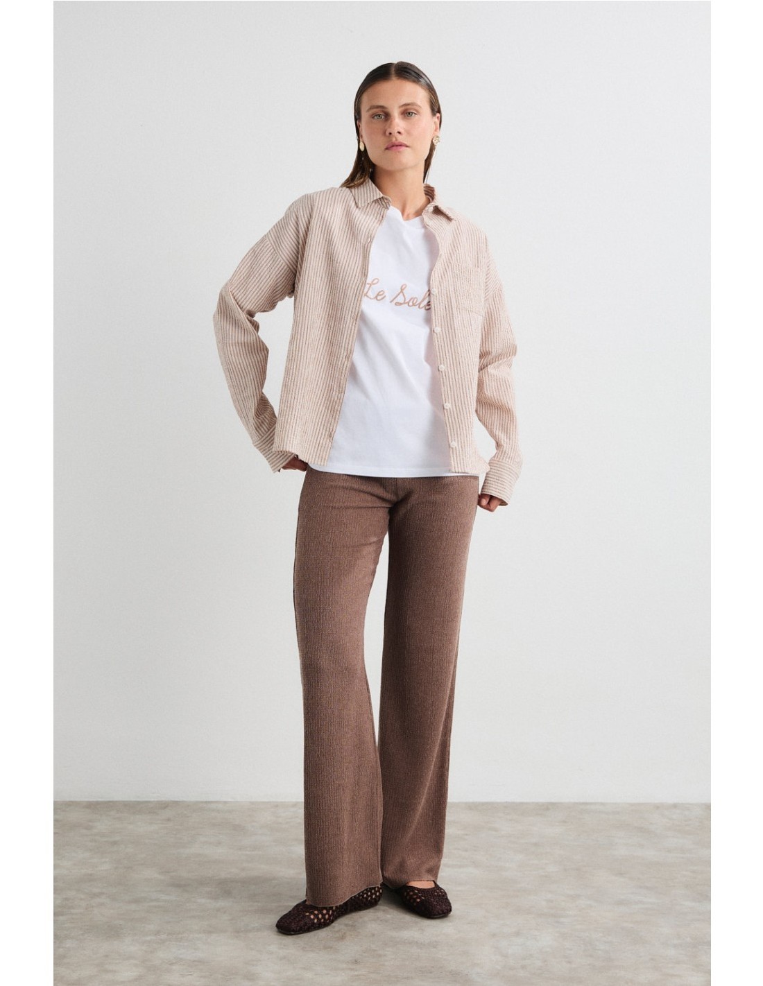 Camisa oversize de rayas con cuello camisero, bajos redondeados, puños con botón y bolsillo frontal de la marca Mus & Bombón. El canesú en la espalda con pliegue central aporta movimiento y estructura.
