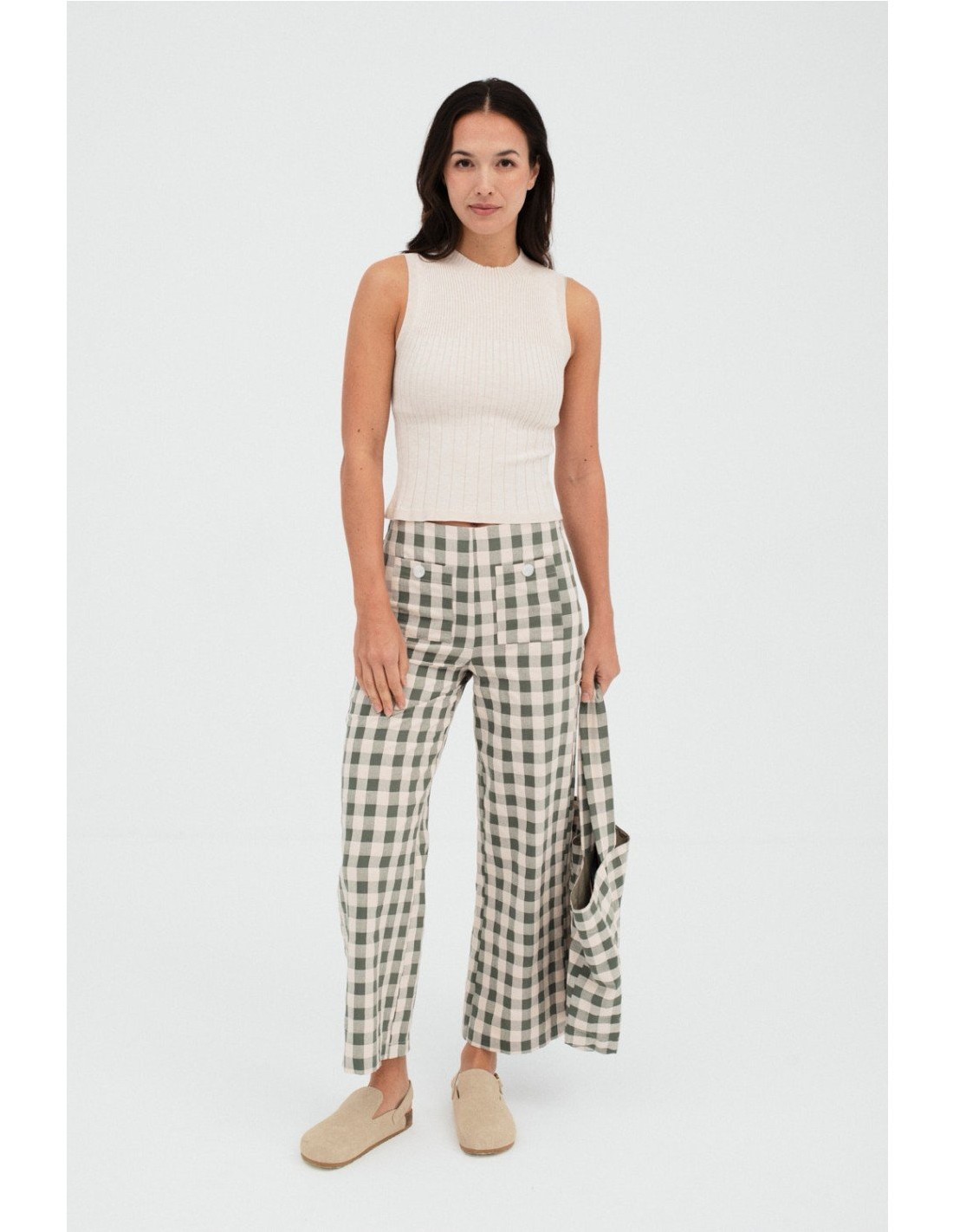 Top de punto sin mangas de la marca Mus&Bombón, con un diseño que combina tres tipos diferentes de canalé en el cuerpo. Tiene un elegante cuello alto en canalé 2x2 y detalles de punto fantasía en las sisas y el bajo. Combina a la perfección con el cárdigan Sufouh y la falda Safa.