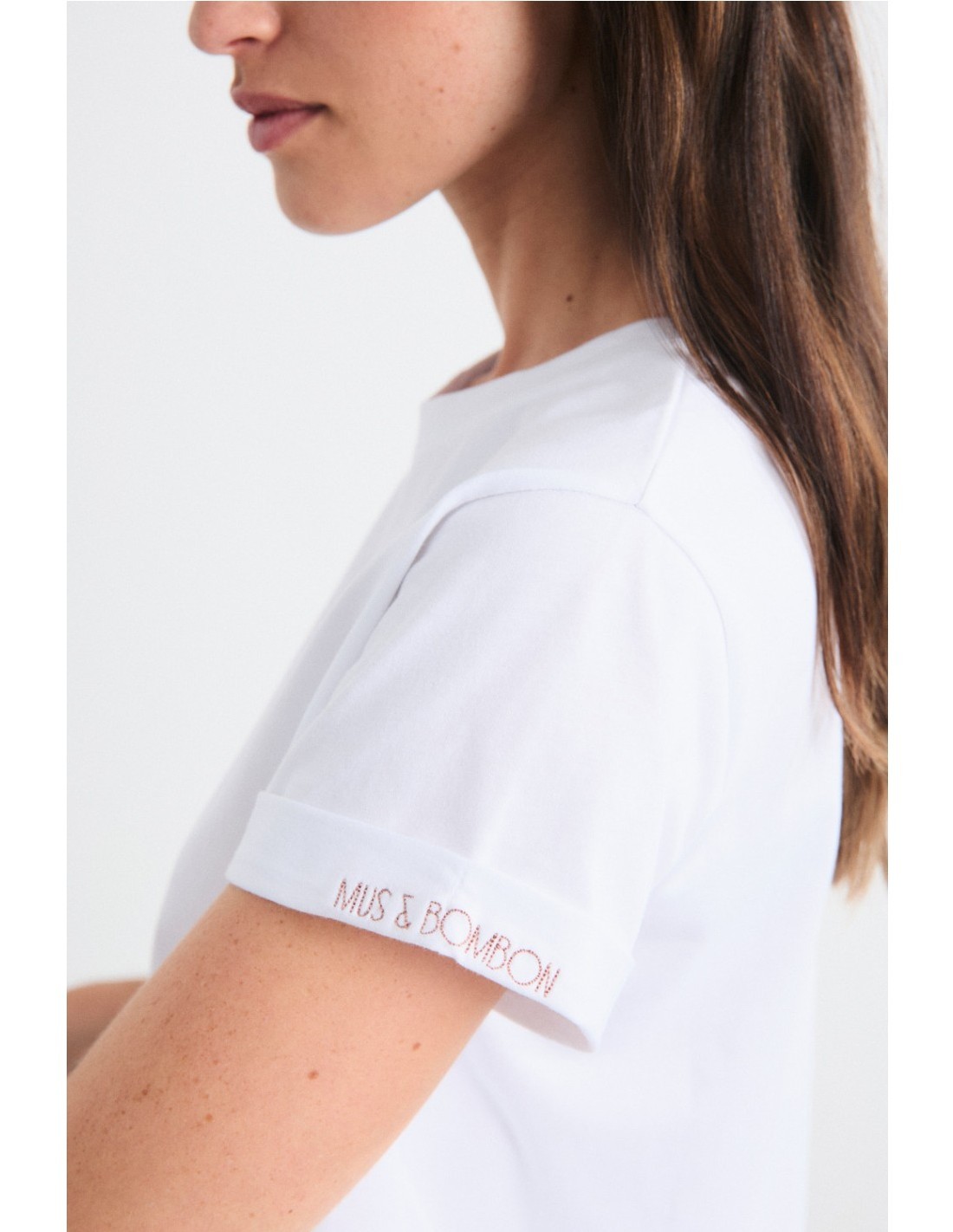 Musbom es una camiseta cuello caja con doble vuelta en manga y print bordado en la manga izquierda. El básico de armario de Mus&Bombon que no puede faltar.