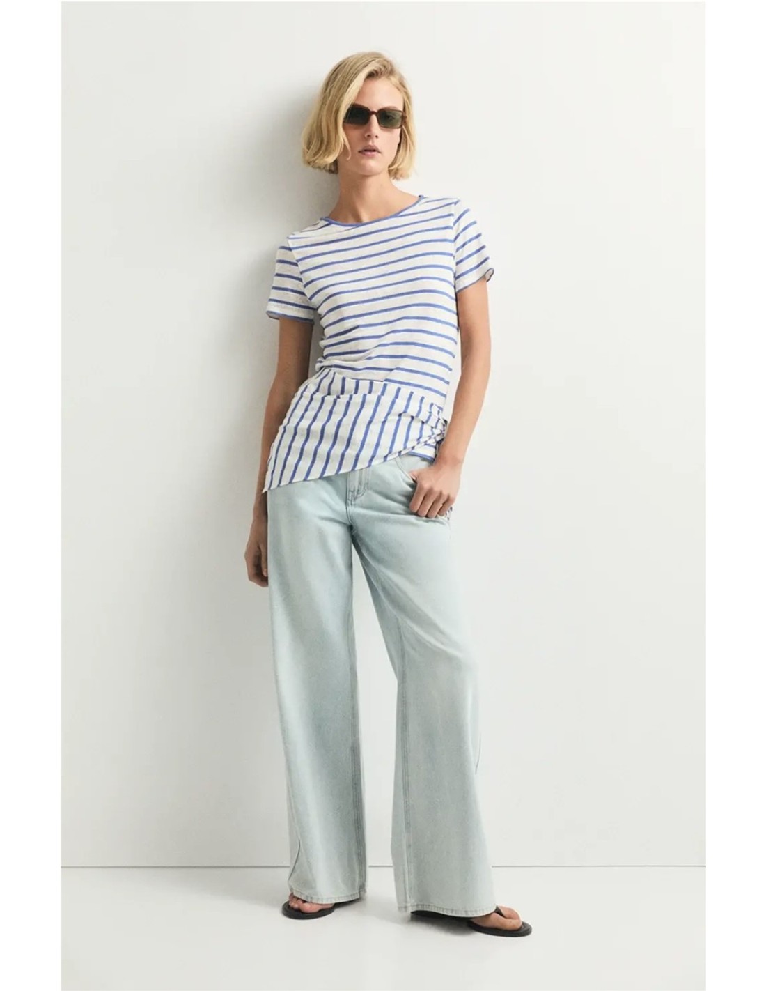 La camiseta Begur se puede combinar con tejanos, pantalones de lino o faldas fluidas, creando looks relajados y elegantes para el día a día.
