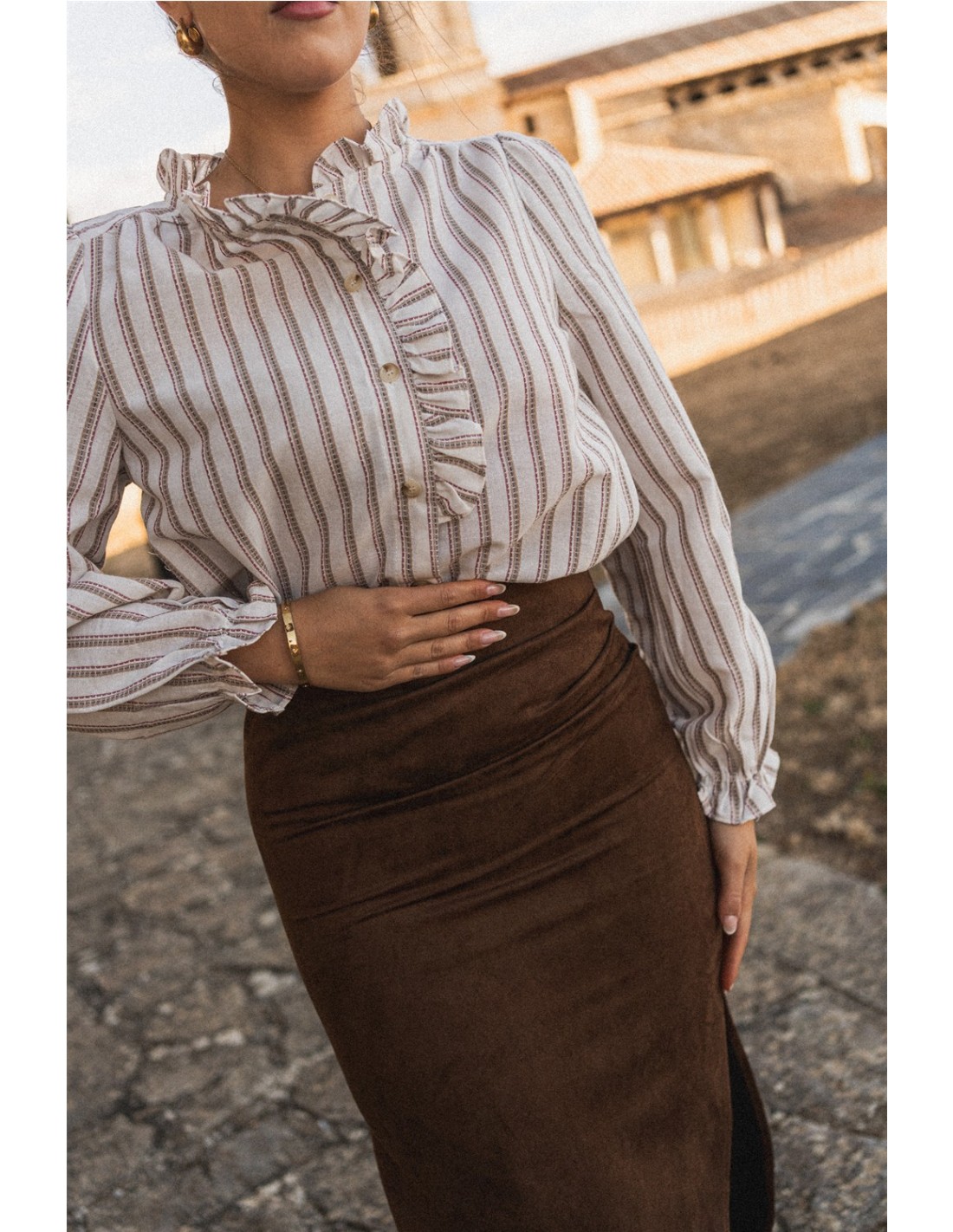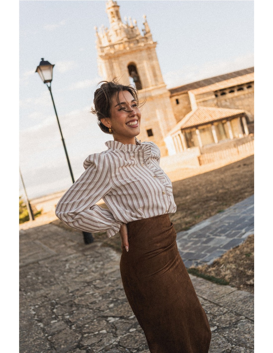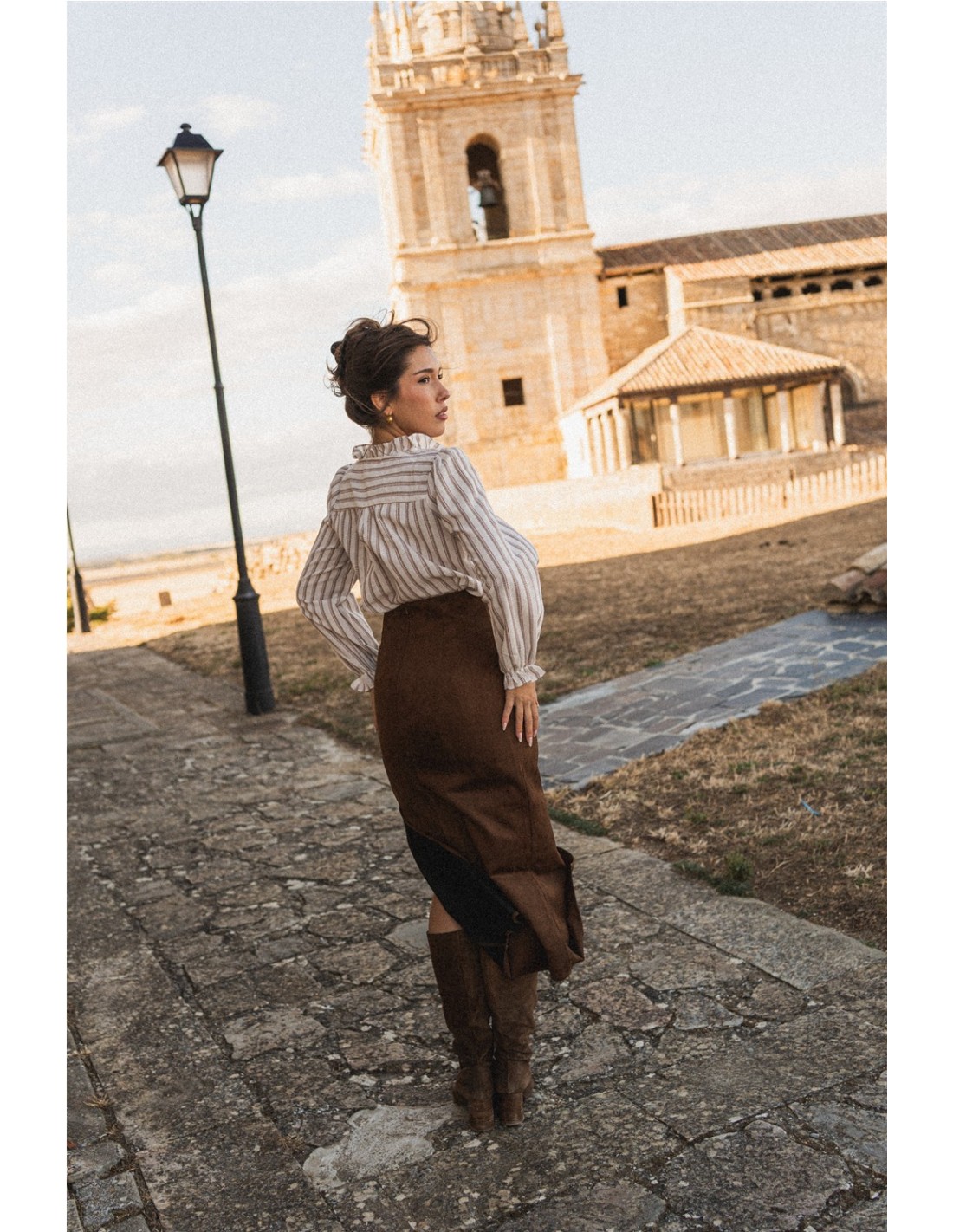 Falda larga entallada de ante disponible en color marrón y granate. Tiene una abertura lateral, cremallera trasera invisible y fruncido lateral superior.