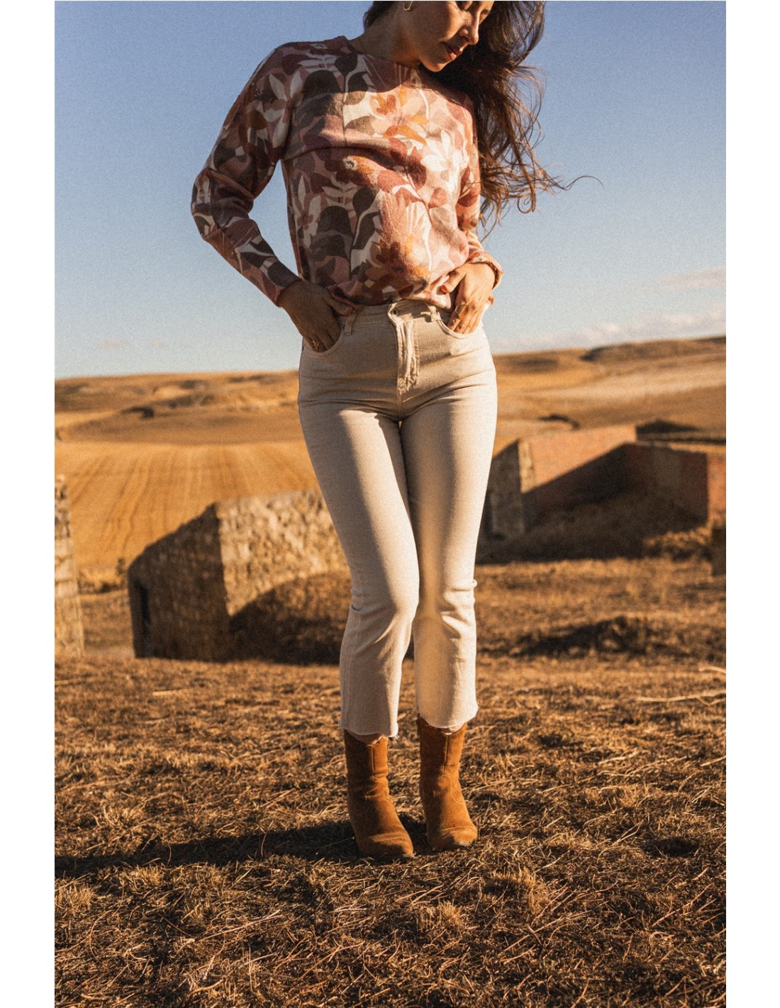 Pantalón vaquero en color beige de corte recto con el bajo desflecado y un largo tobillero.