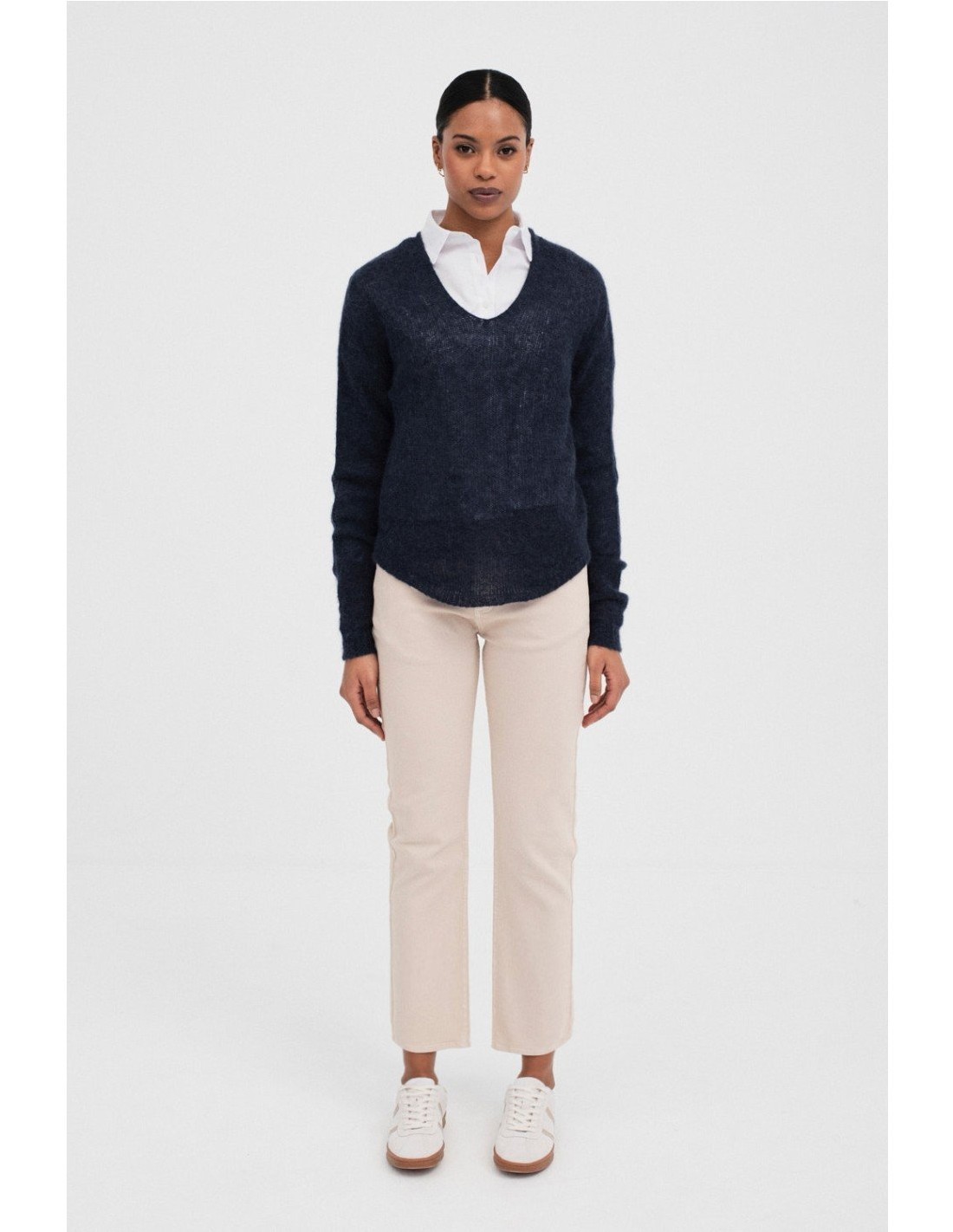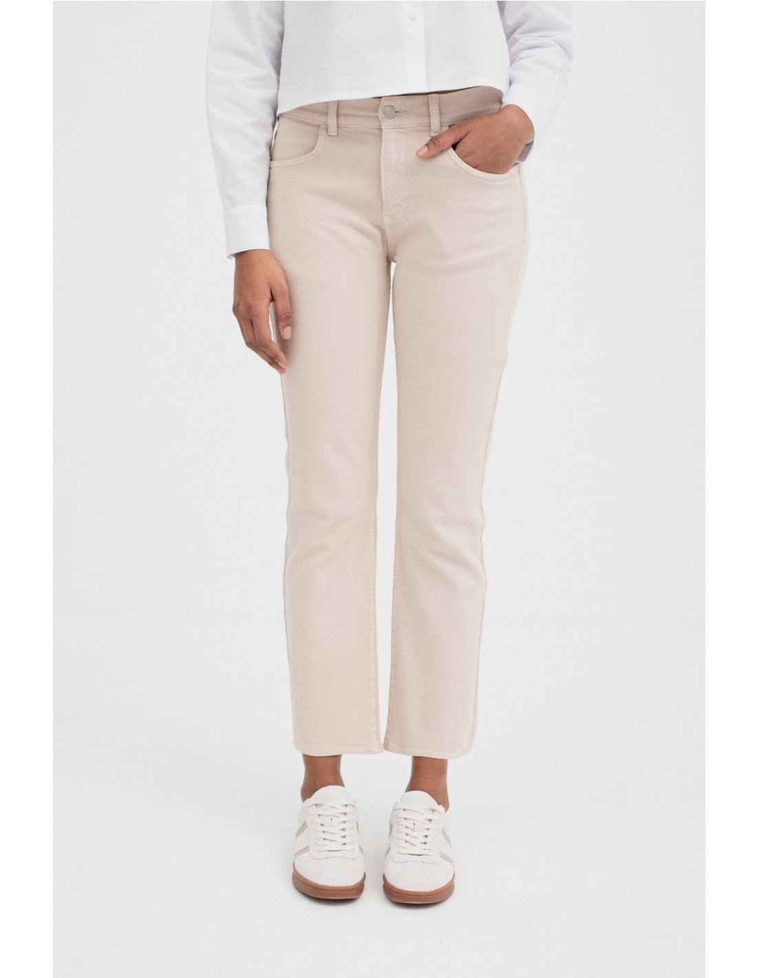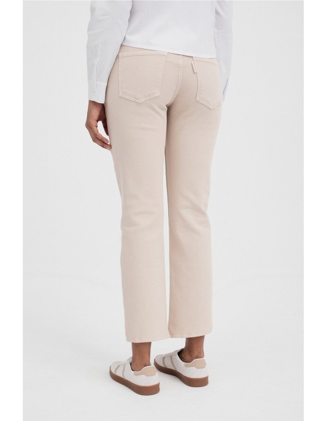 Brickell es un pantalón crop de twill, tiro medio y corte slim flare de la marca Mus & Bombón, que aporta un toque moderno y casual. Está disponible en color verde y beige.