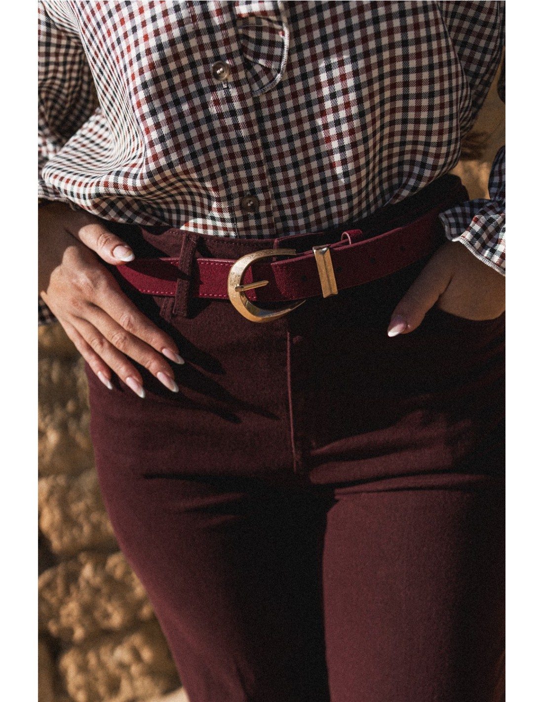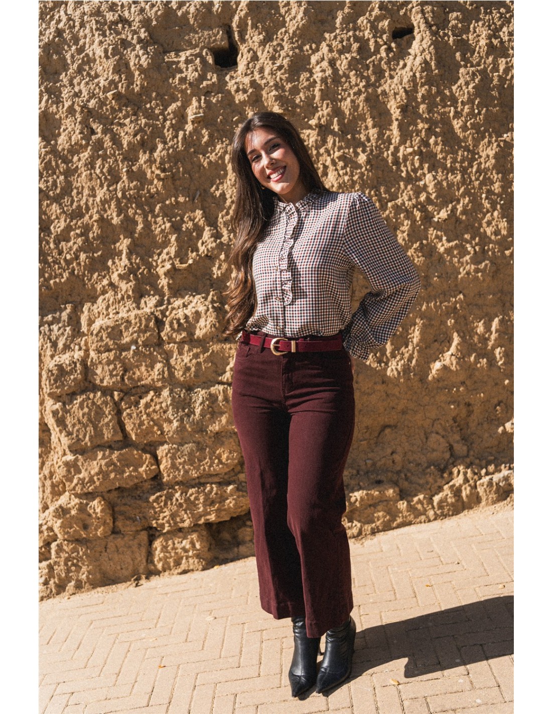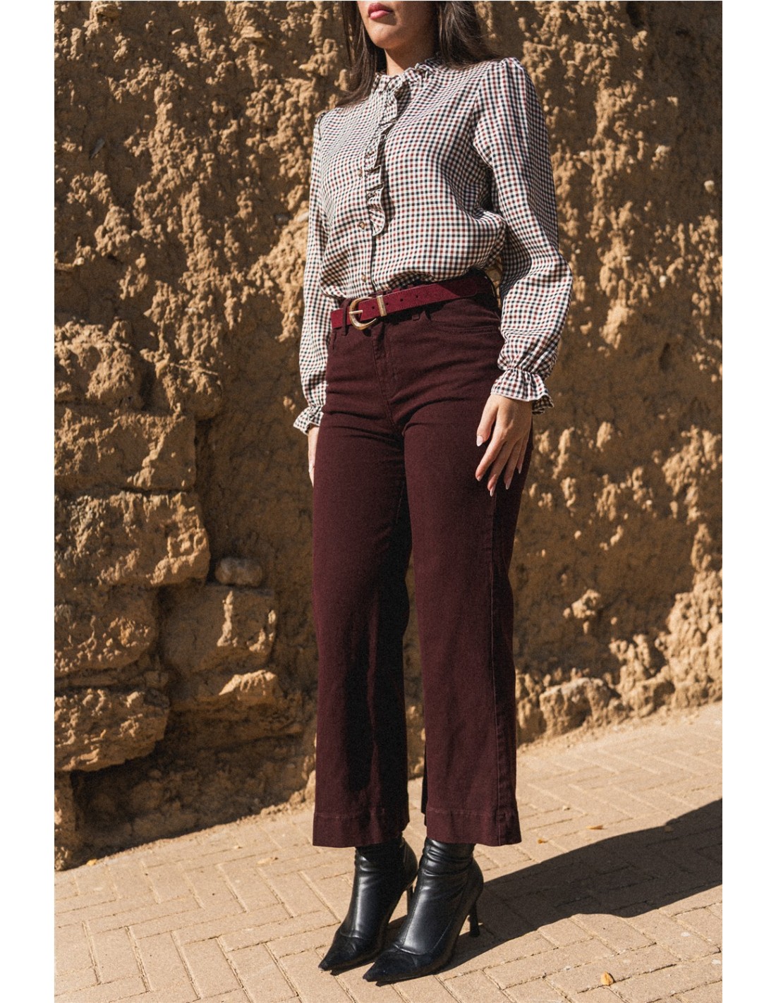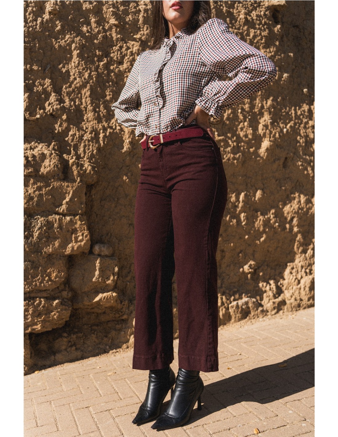 Descubre la elegancia y comodidad del vaquero Windy en su versión burdeos. Son pantalones de pierna ancha, lo que significa que tienen una cintura ajustada que se ensancha desde la cadera hasta la parte inferior de la pierna.