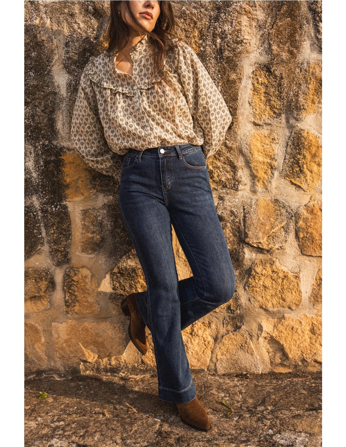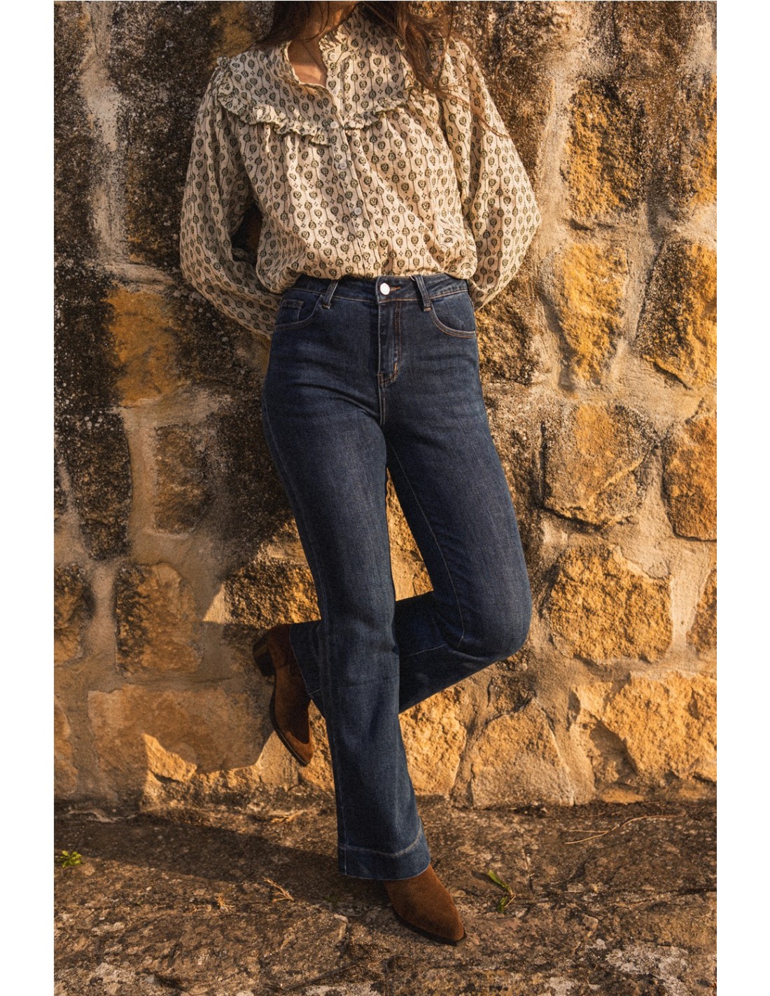 Vaquero campana en tono medio, cinco bolsillos bajo con ancho pespunte y tejido elástico.