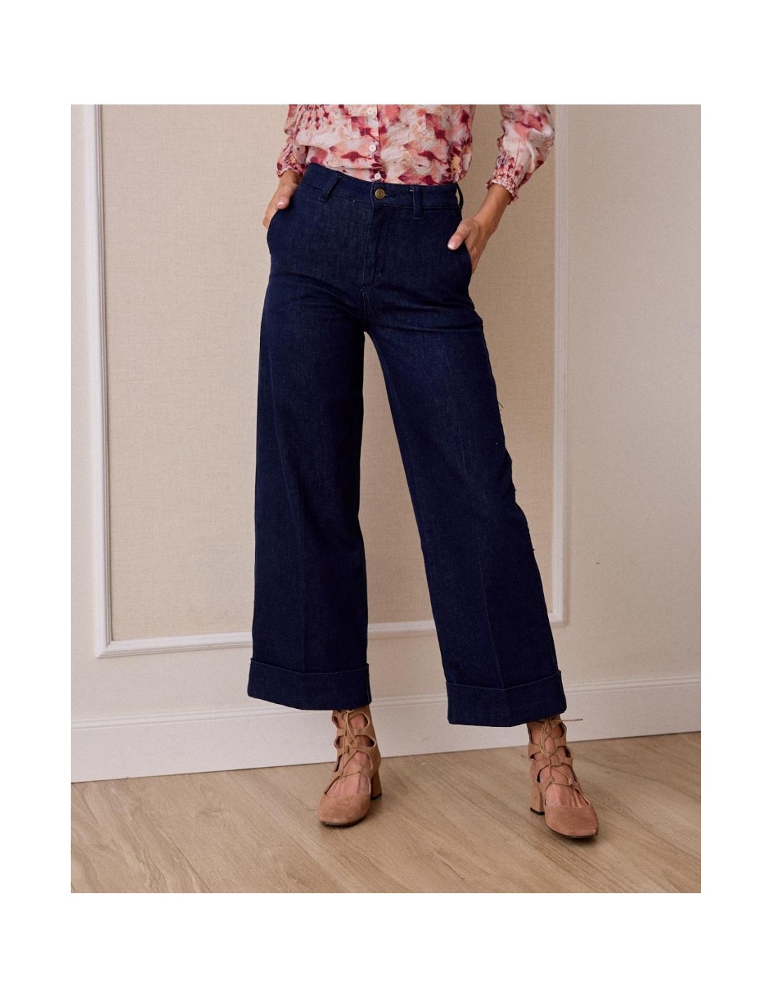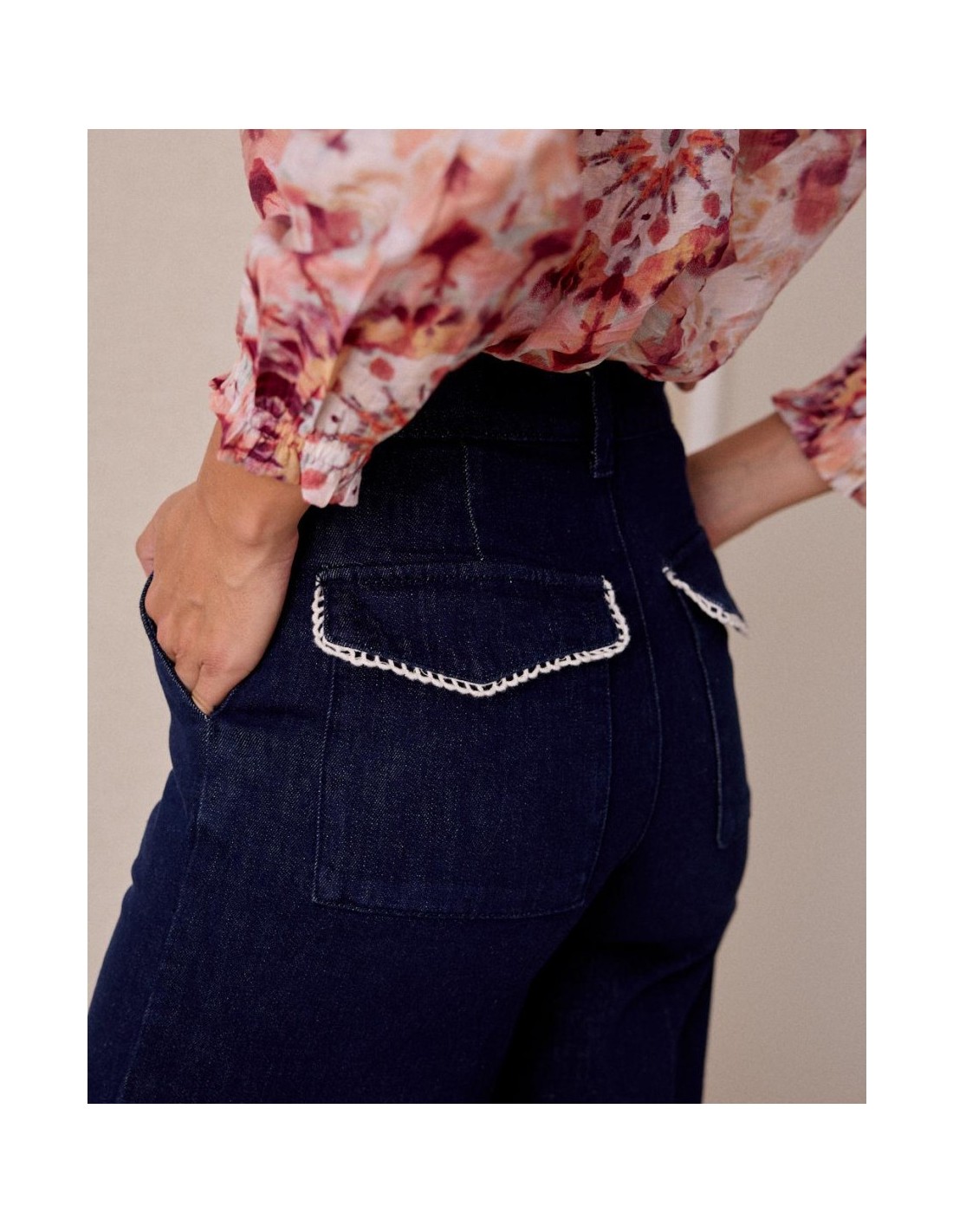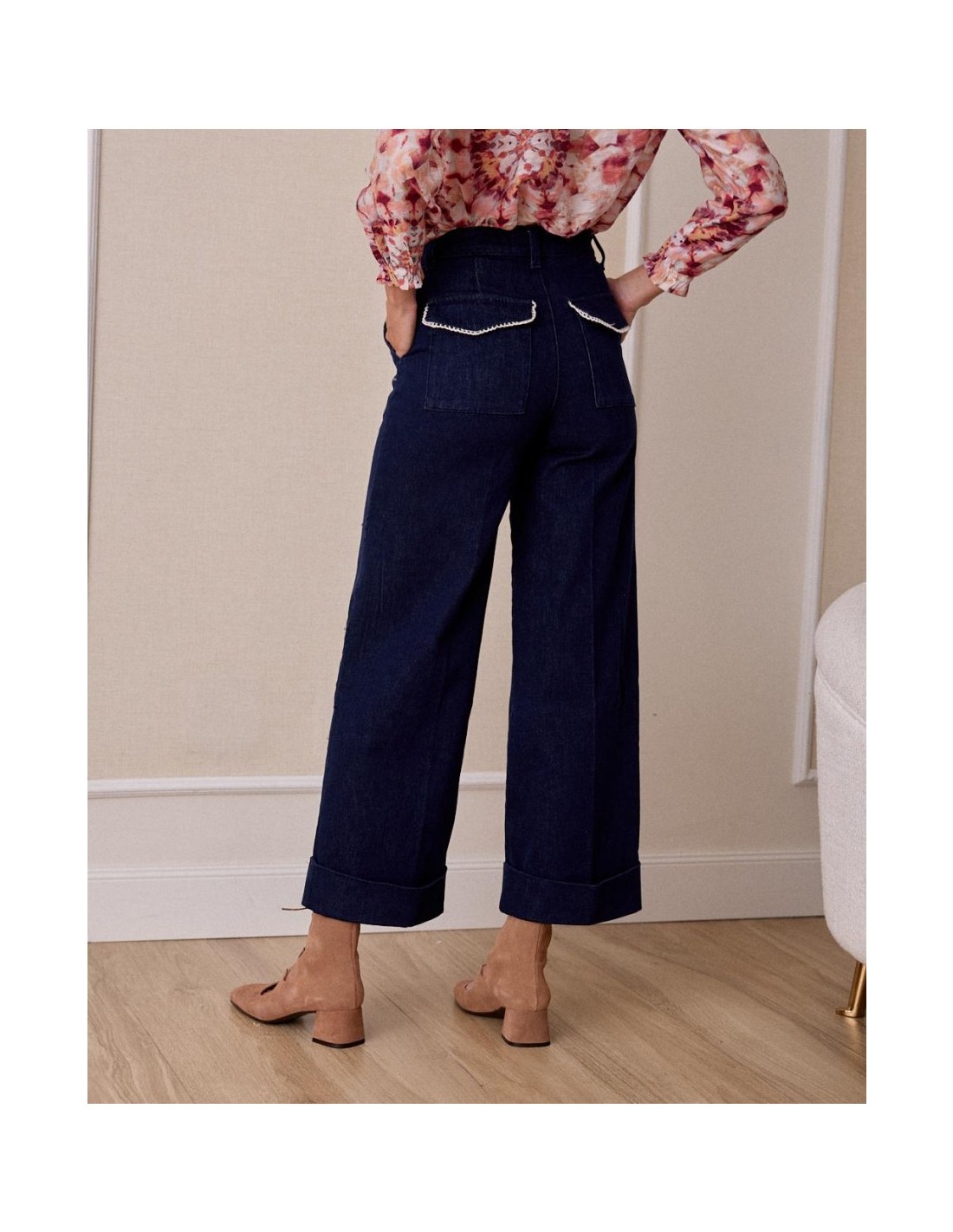 Pantalón vaquero de tiro alto en tono azul marino. Corte recto con bajo vuelto. Detalle de bolsillos traseros con solapa y ribete de crochet en contraste.