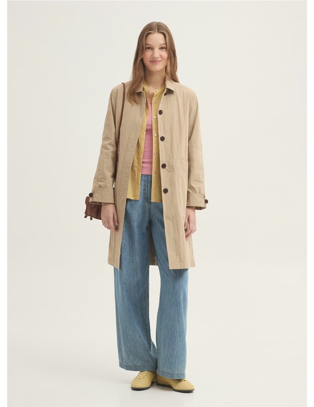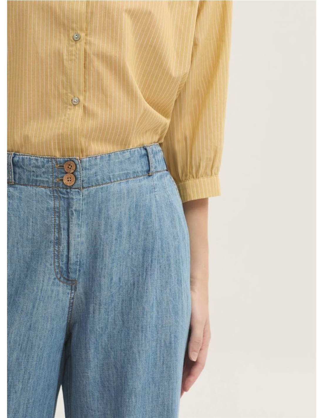 Pantalón con pinzas confeccionado en mezcla de denim Tencel y algodón sostenible de la marca Nice Things. Incluye bolsillos inclinados en la parte delantera, cierre con cremallera metálica y botones de coco. Cinturilla con trabillas y pierna ancha.