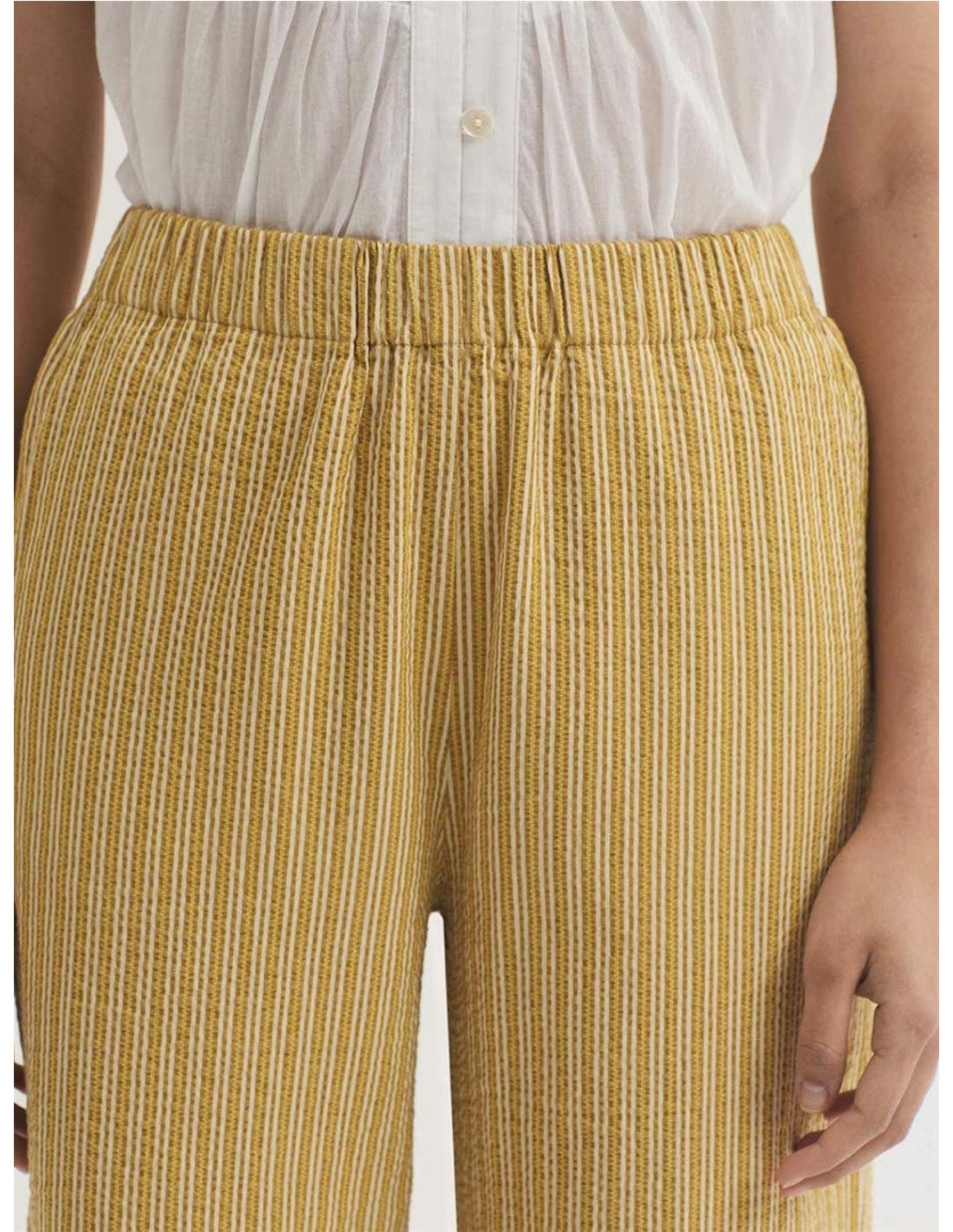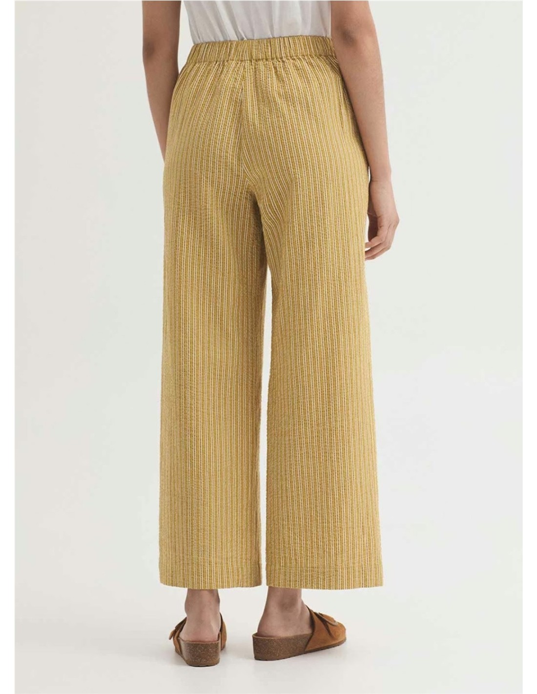 Pantalón confeccionado en tejido de raya seersucker de algodón sostenible de la marca Nice Things. Incluye goma interior en la cinturilla y bolsillos laterales.