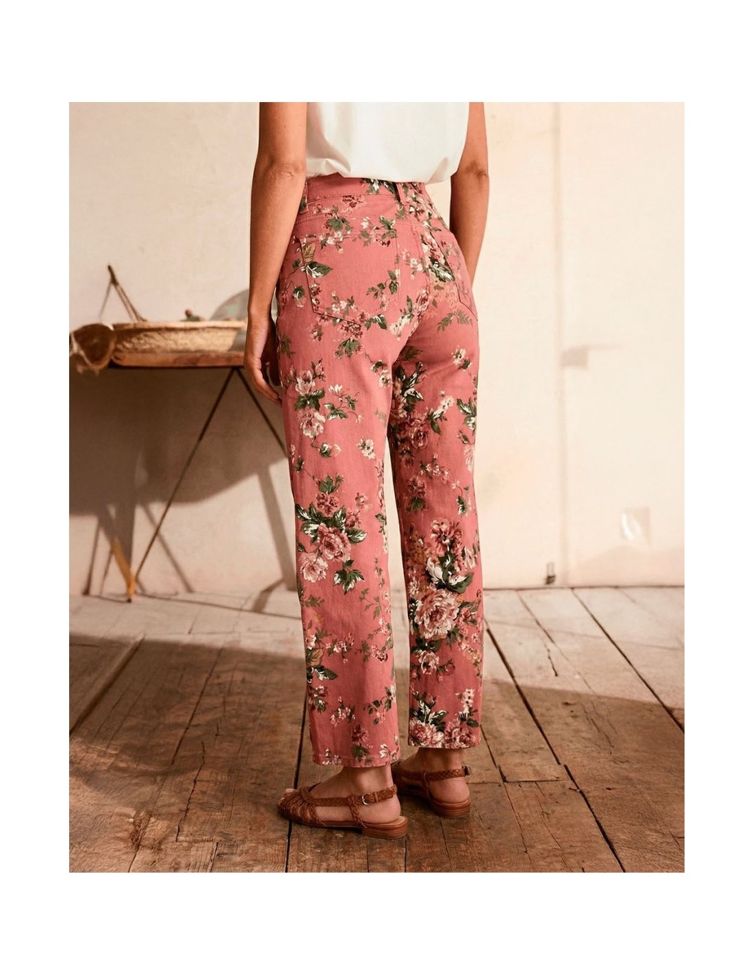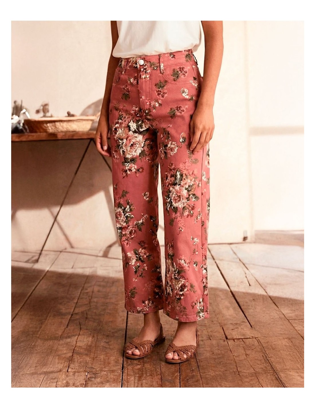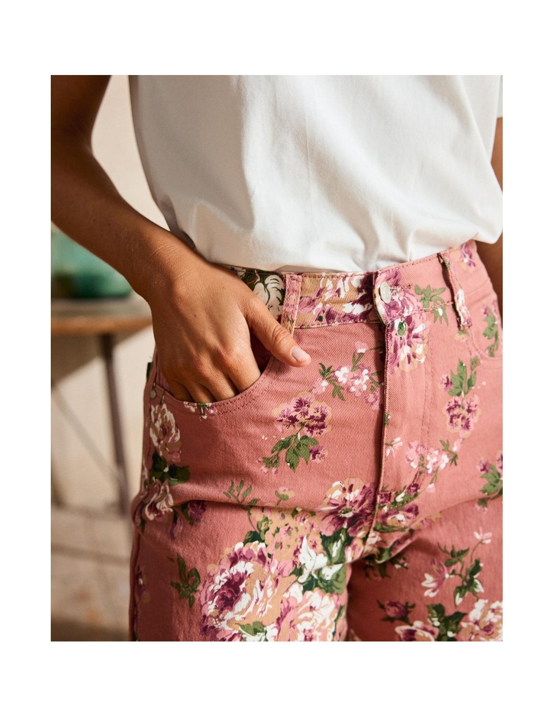 Pantalón estampado de flores en color maquillaje, con un diseño de tiro alto y bolsillos en la parte frontal. Pantalon vaquero de corte Wide Leg.