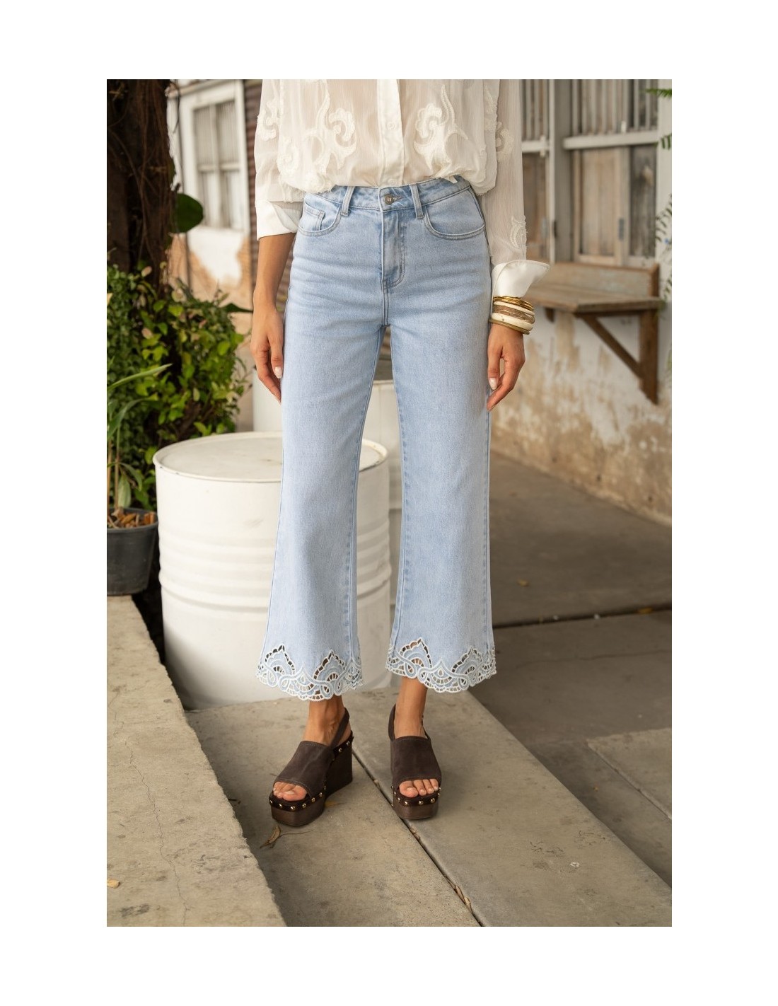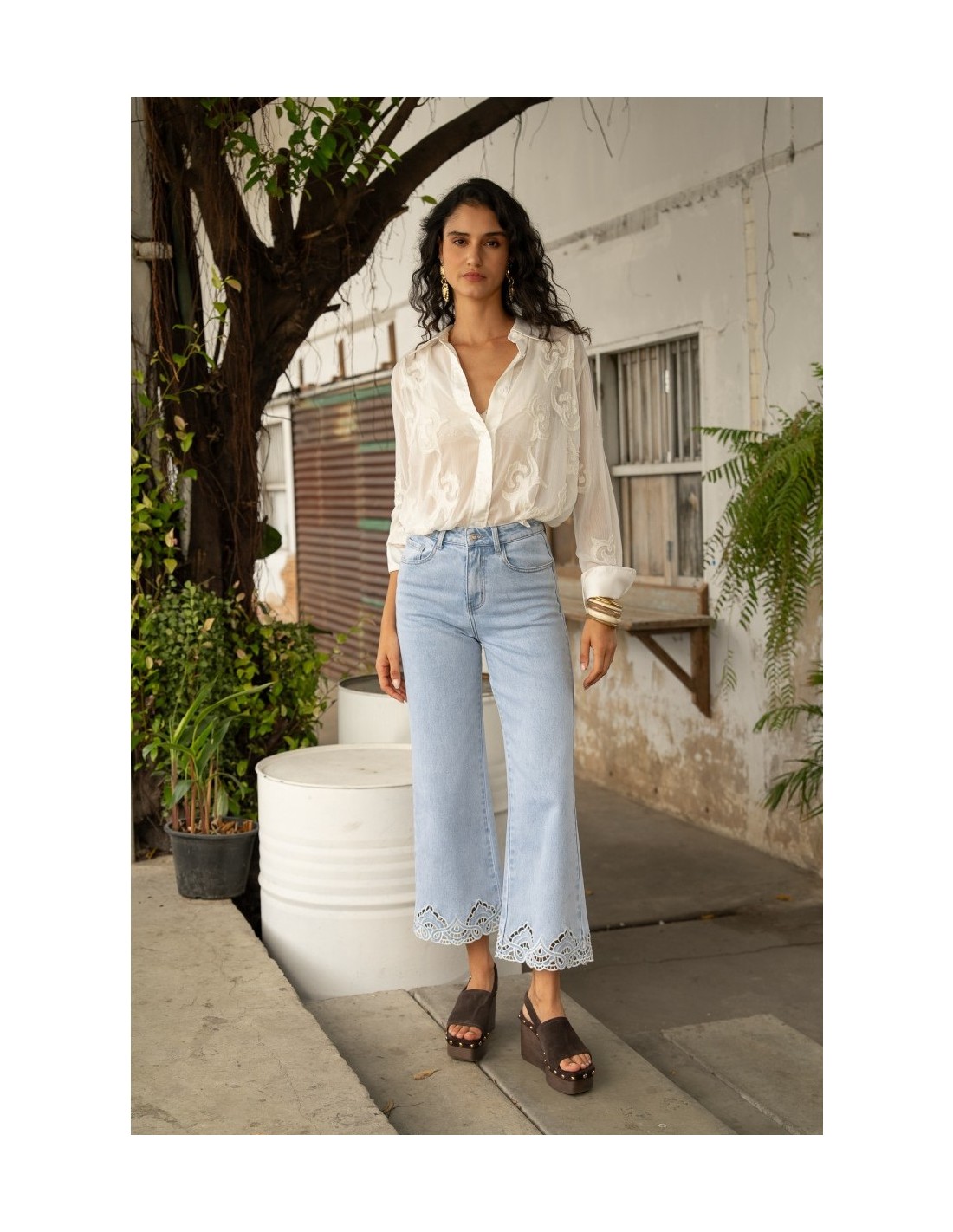 Se distingue por su bordado calado en el bajo, que le confiere un carácter único.