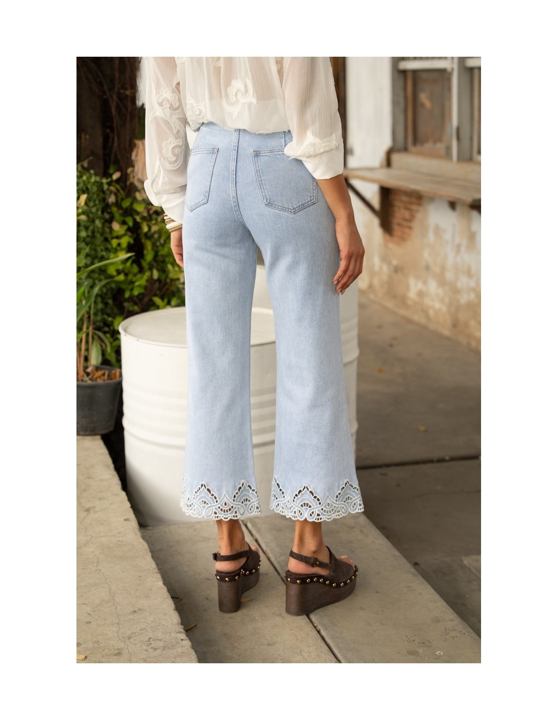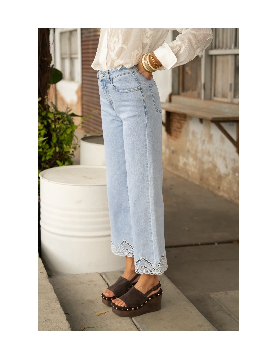 El pantalón vaquero Nola es de pierna ancha. Presenta una cinturilla ligeramente ajustada y una pernera que se ensancha con gracia desde las caderas hasta el bajo, creando una silueta fluida y elegante.