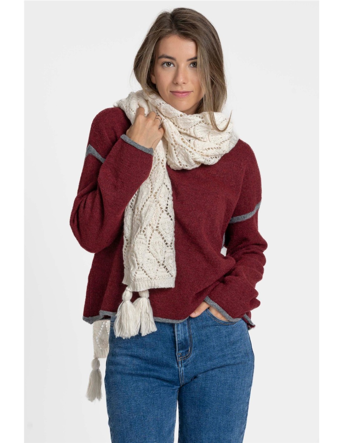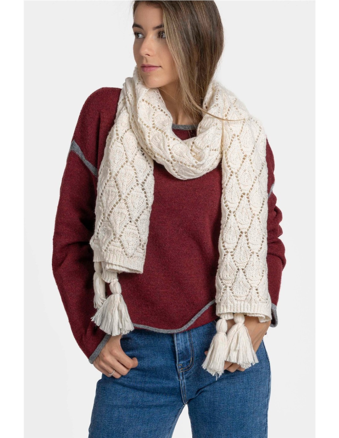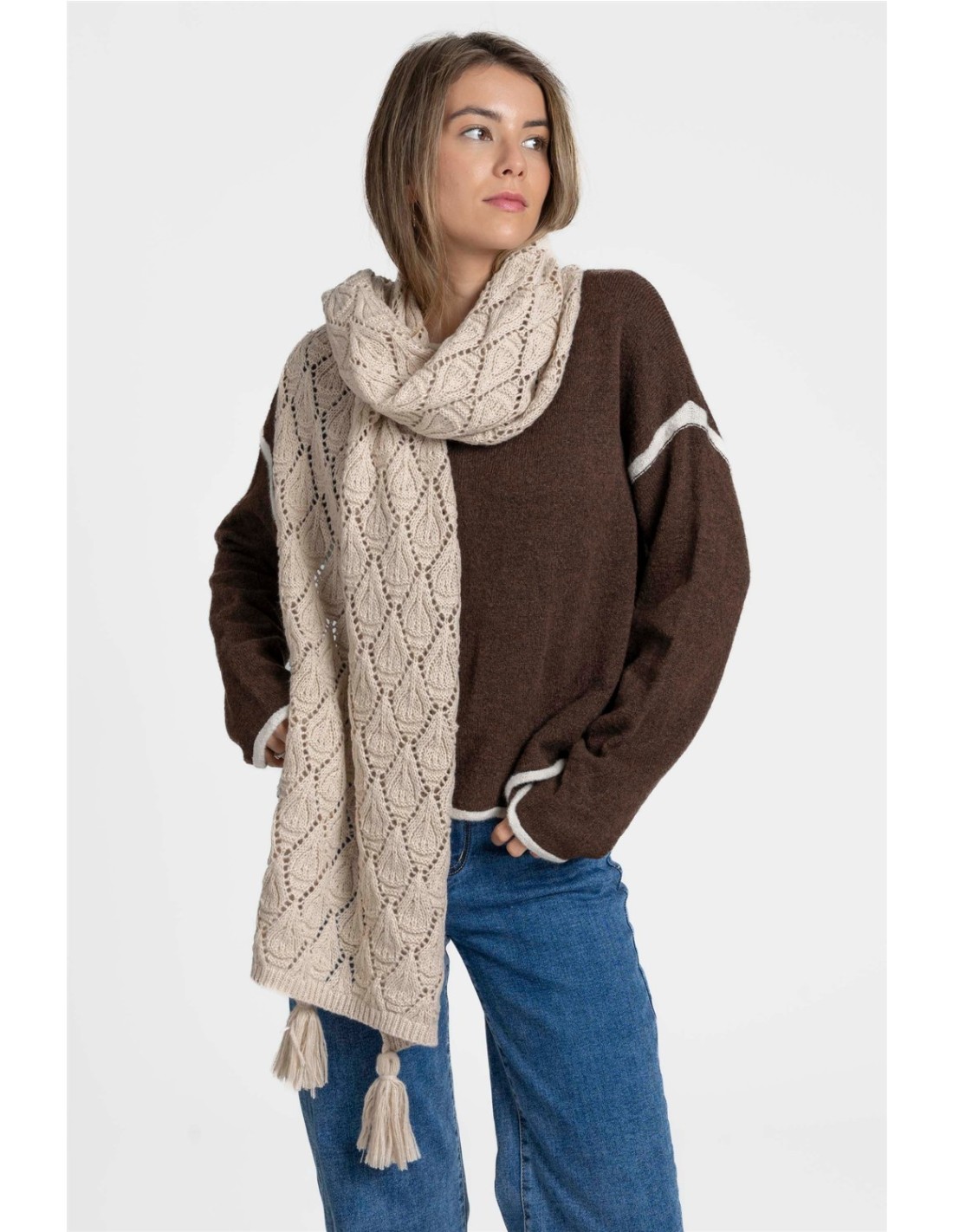 Bufanda calada en color beige con detalles de pompones en los extremos. Medidas: 45 x 180 cm.