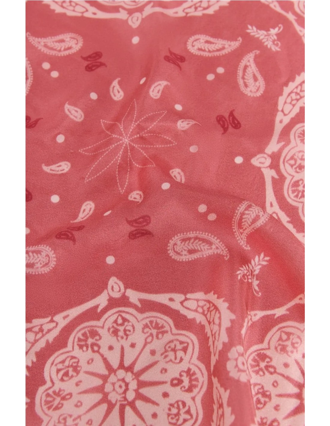 Pañuelo de 100% seda de la marca Ese o Ese. Con estampado paisley en tonos rosas. Medidas: 60 x 60 cm.