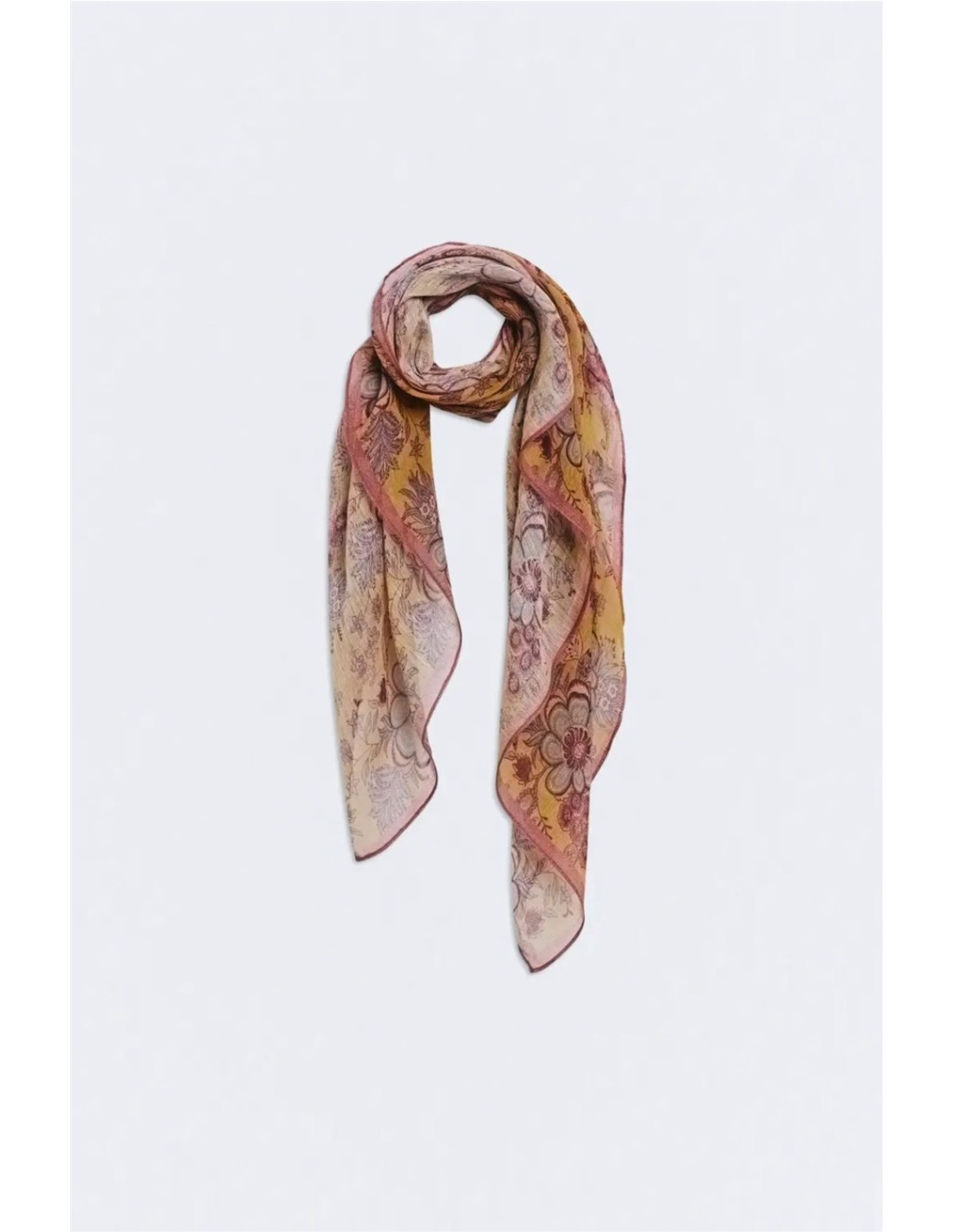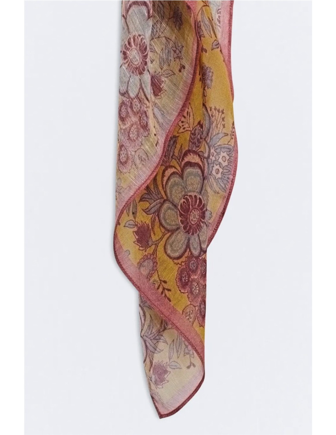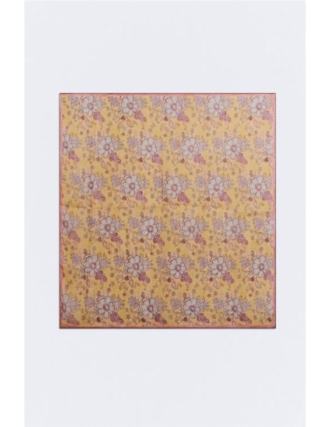 Fular de lino con mezcla de algodón de Ese O Ese. Estampado de flores sobre fondo azul. Medidas: 100 x 100 cm.