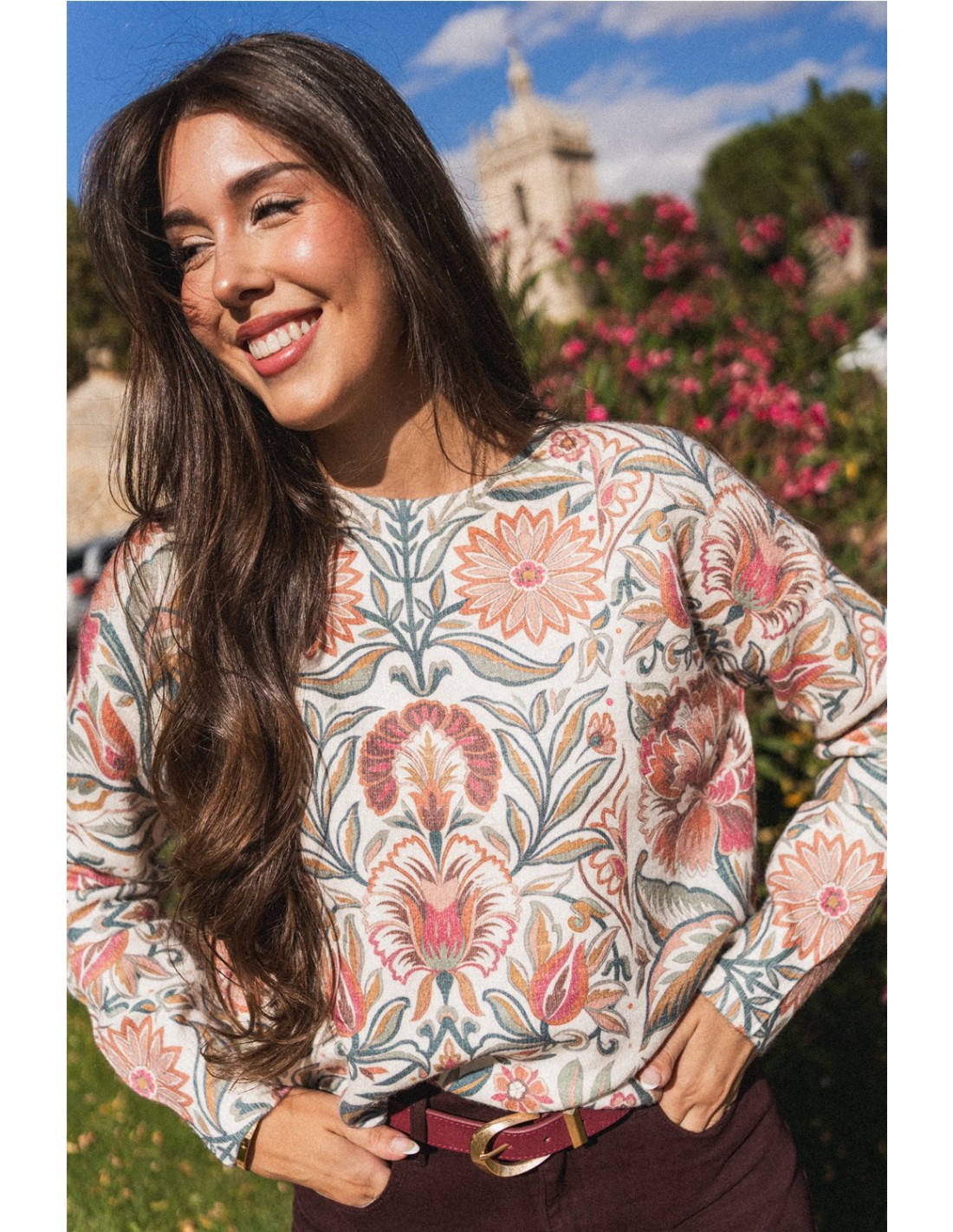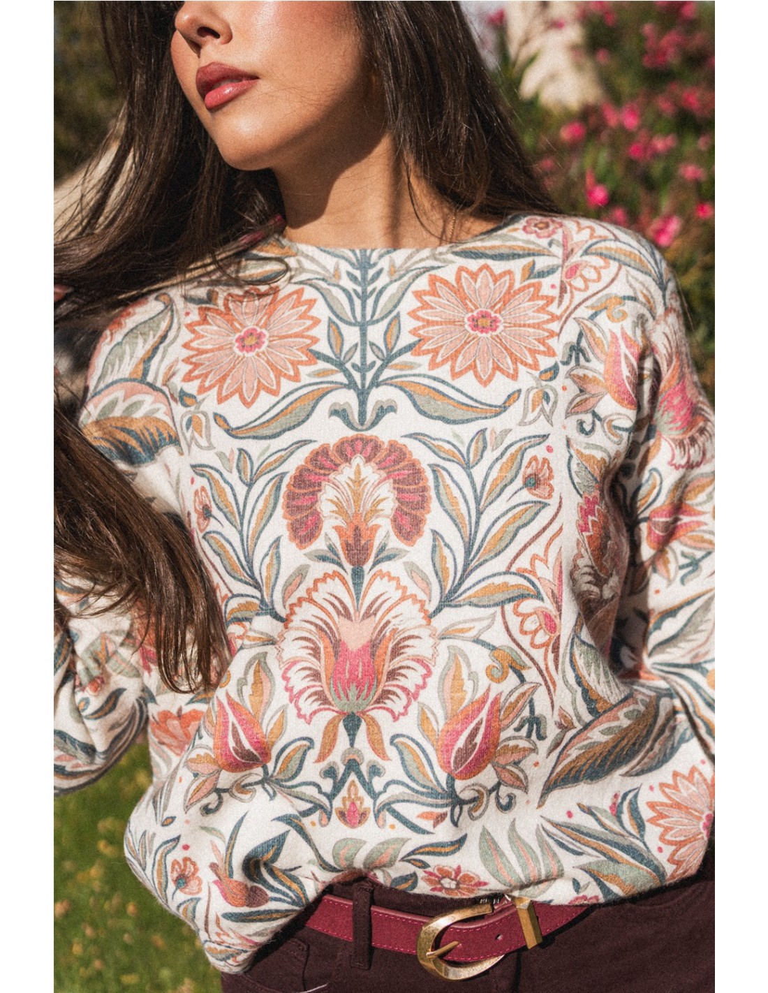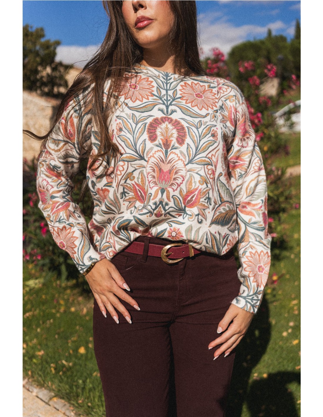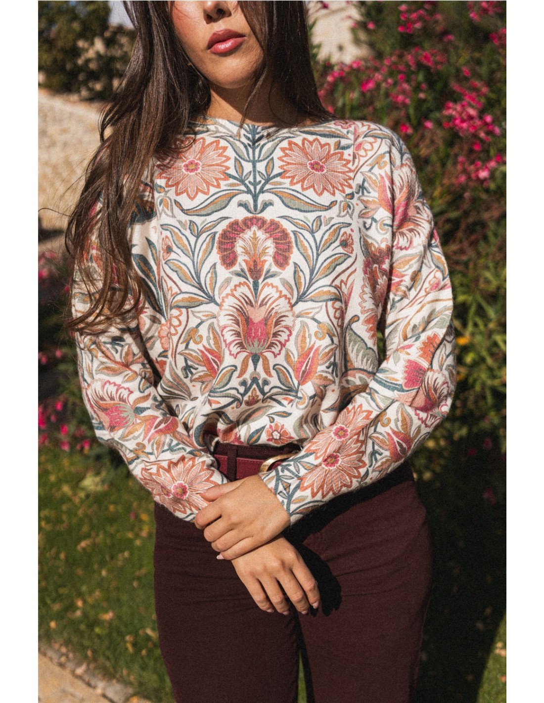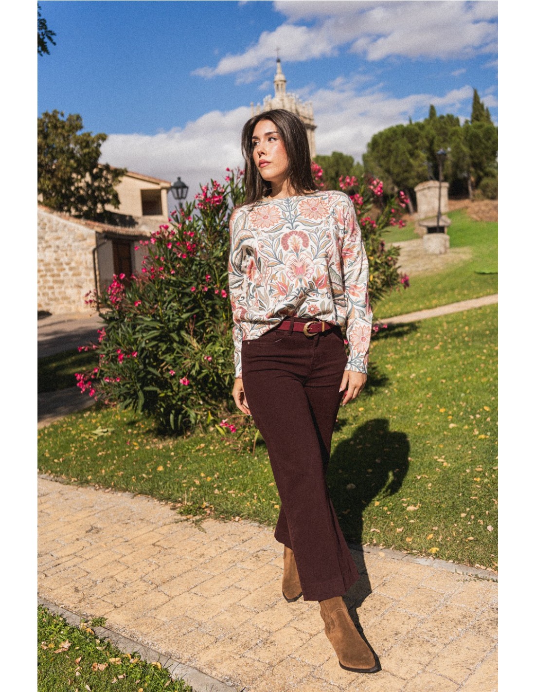 Jersey estampado en tonos verdes y marrones, cuenta con corte recto, cuello redondo y remate acanalado en bajo, puños y cuello.