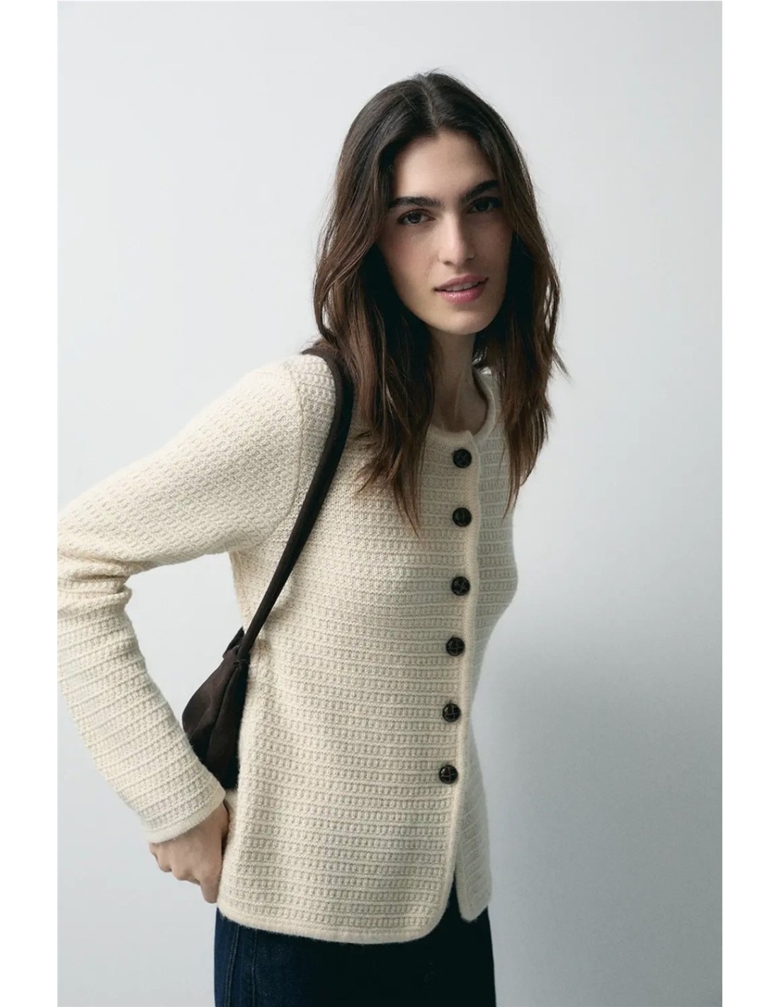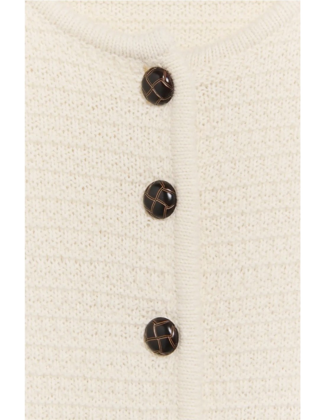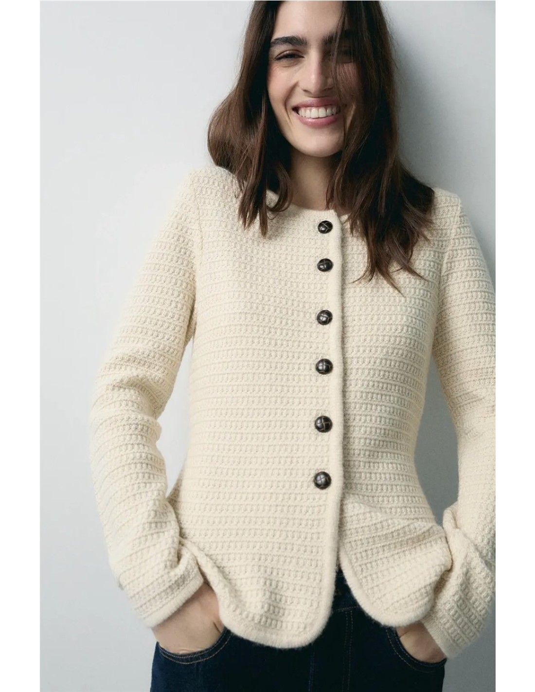 Cárdigan con estructura de punto y composición de lana de la marca Ese O Ese. En color ecru. Cuello tipo caja. Botones de piel hasta la cadera.