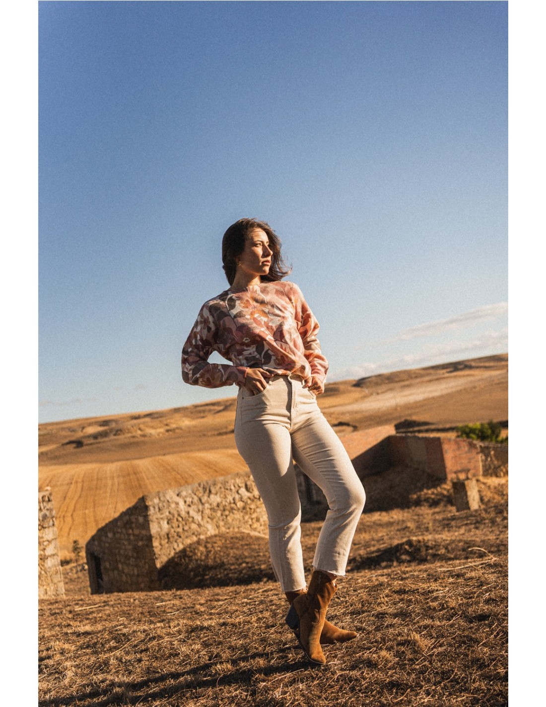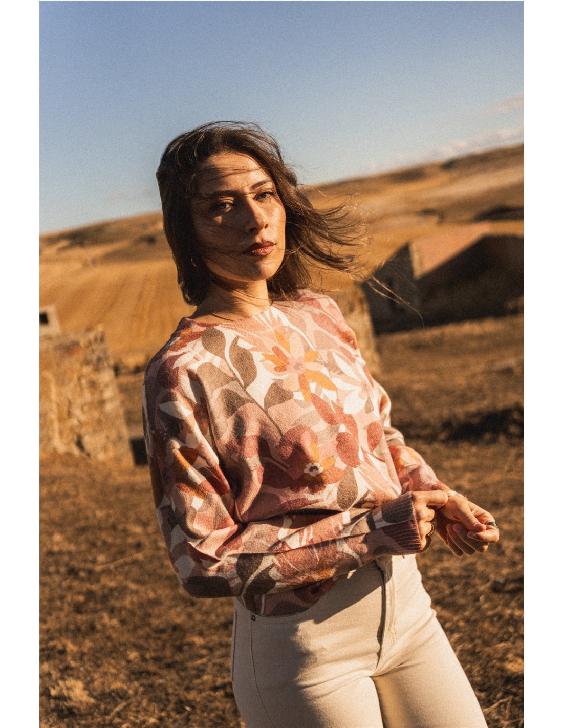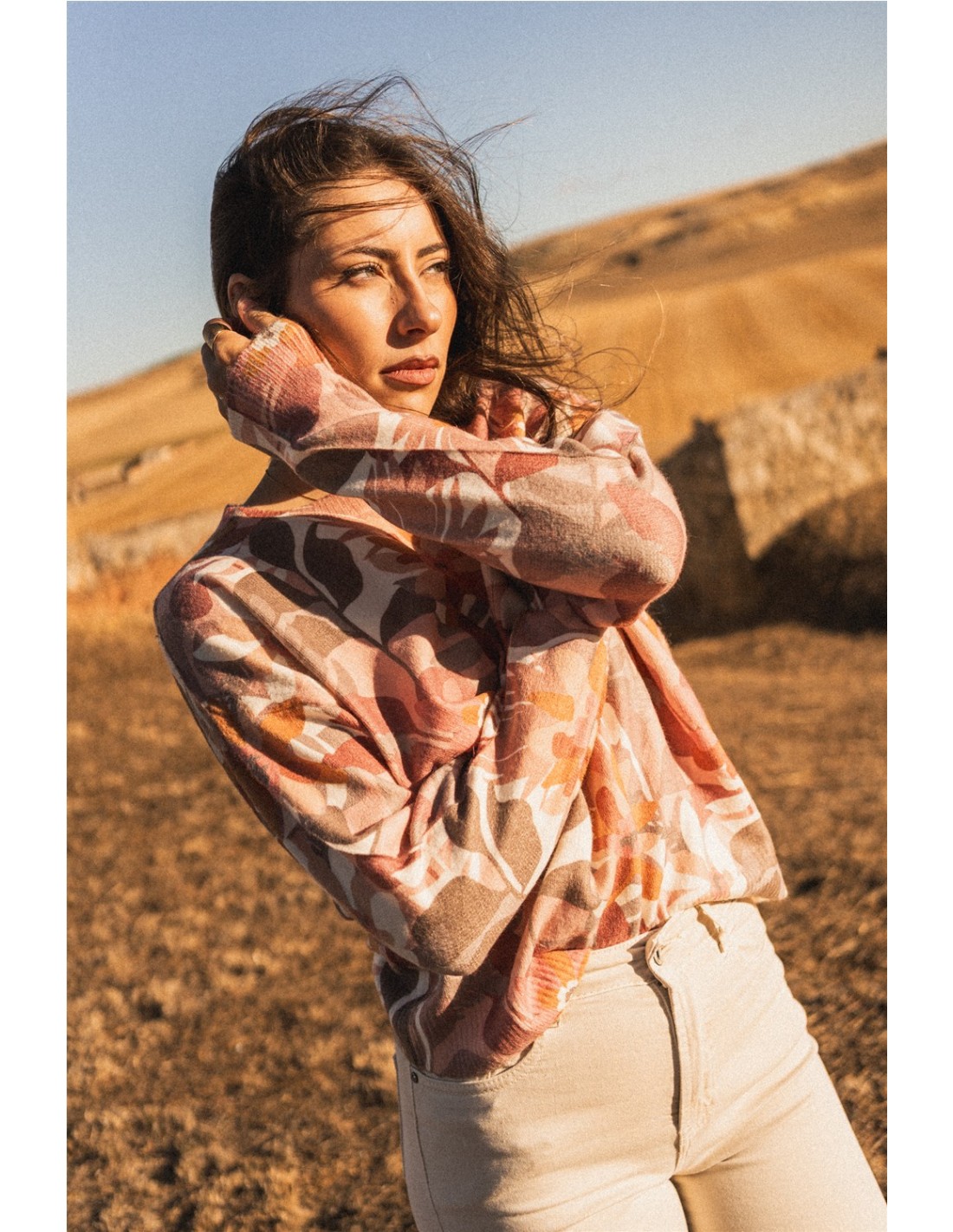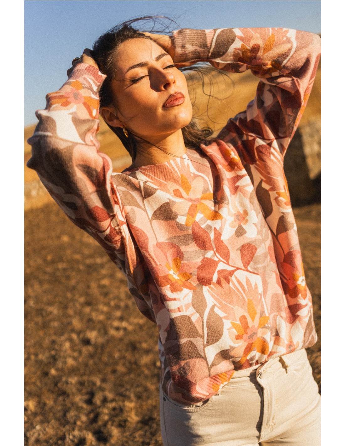 Jersey estampado vegetal en tonos tierra con cuello redondo y acabados en canalé.