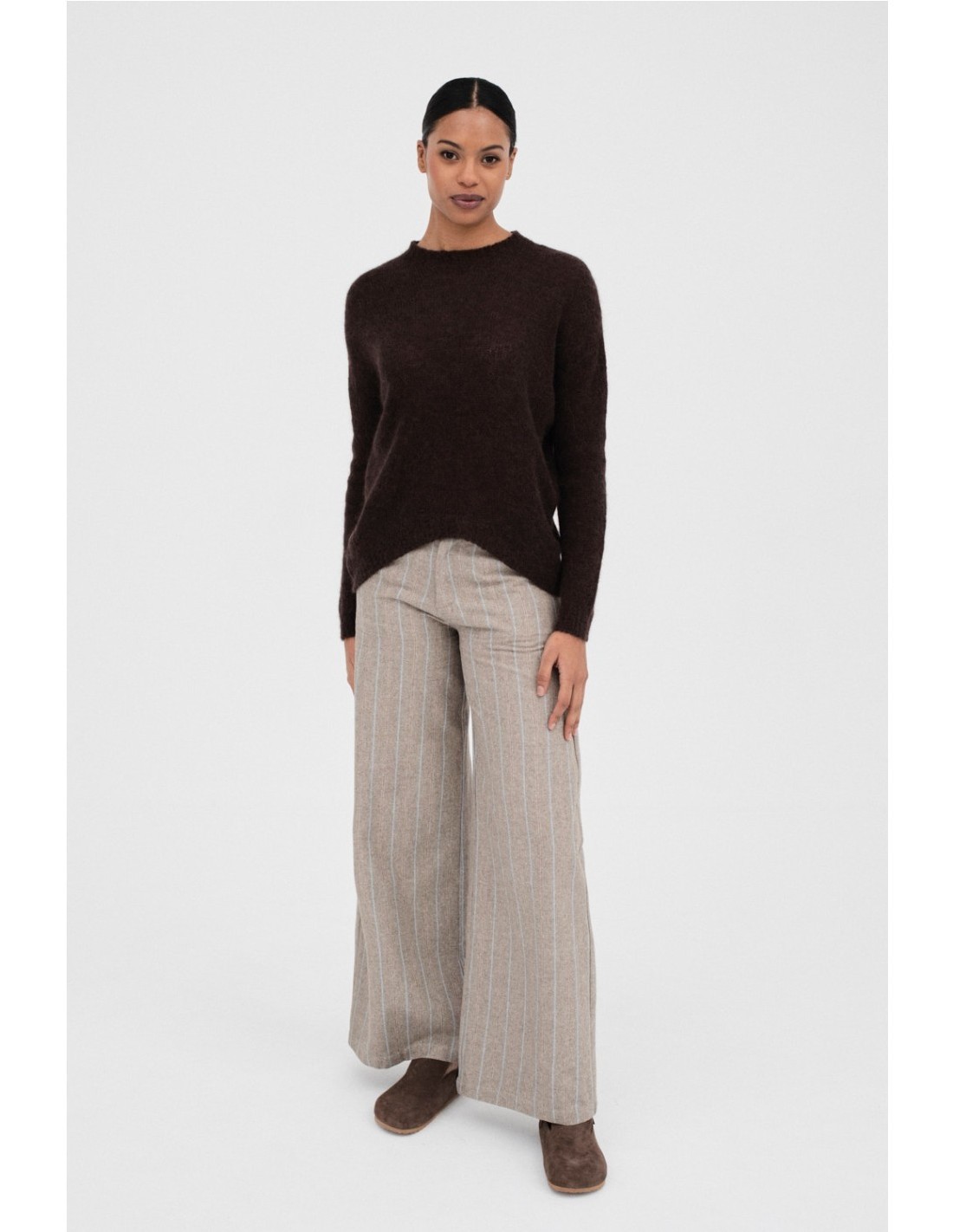 Un jersey de punto liso con cuello redondo y manga larga. Es de tricot integral y presenta acabados en canalé, bajo redondeado y un diseño ligeramente más corto en el delantero.