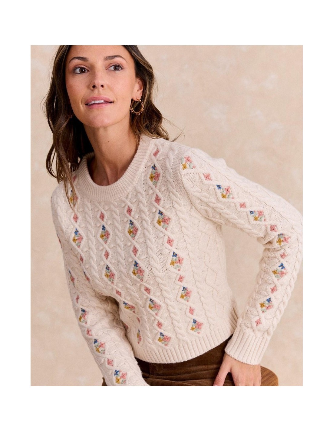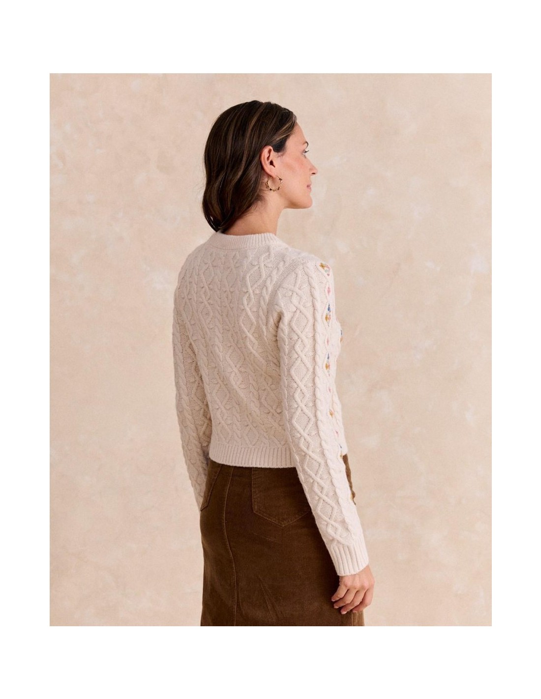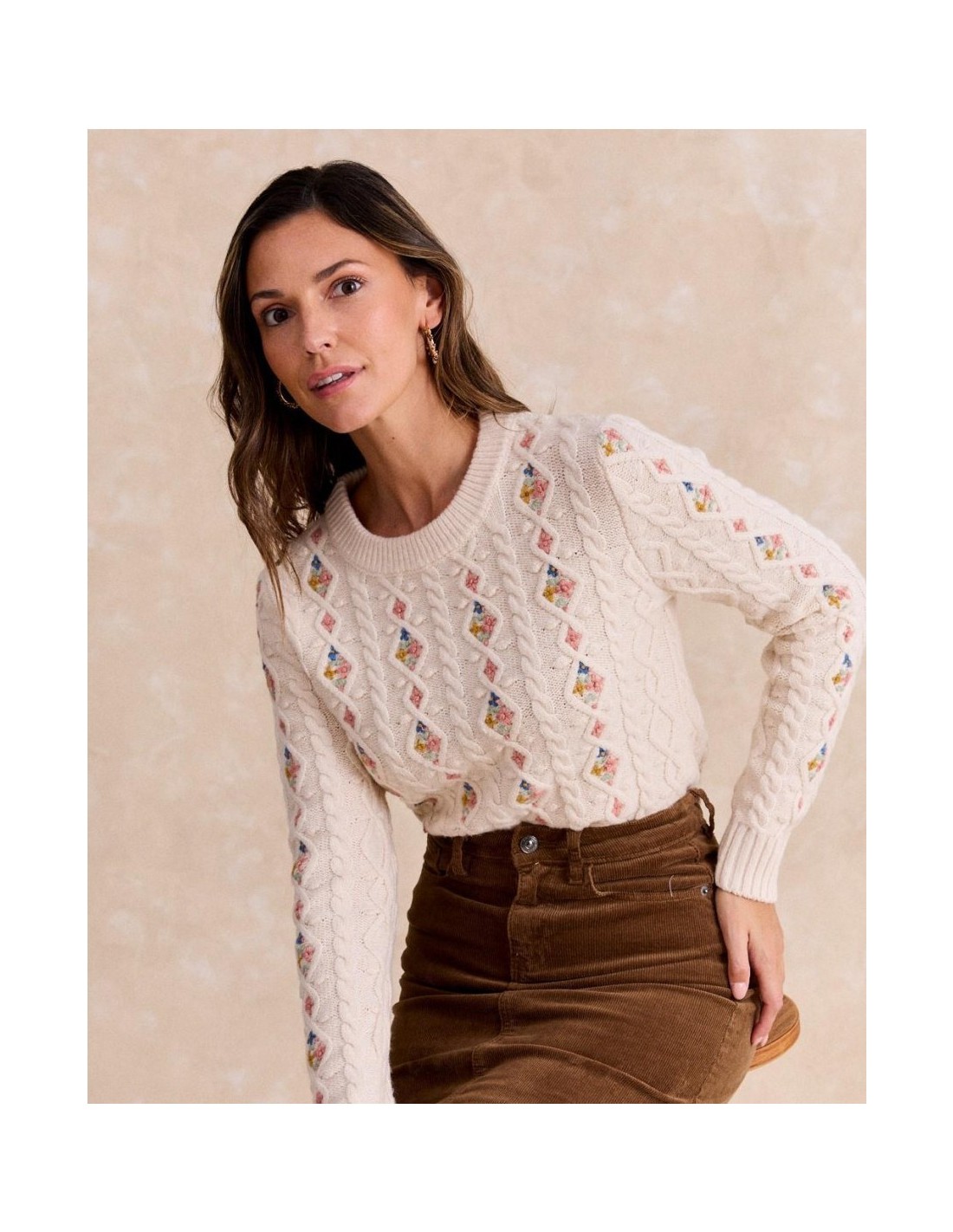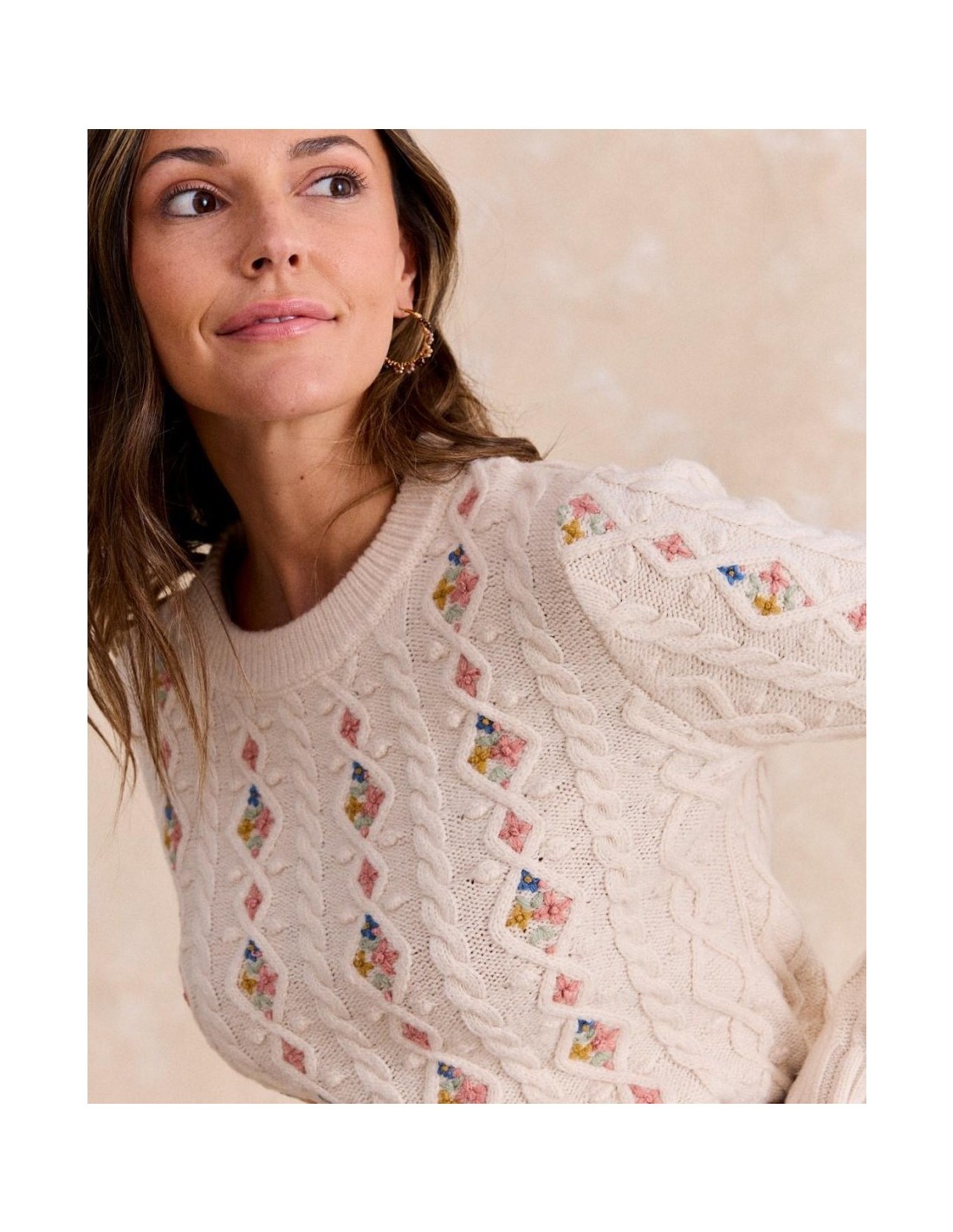 Jersey de color crudo con detalles en relieve y detalles geométricos multicolor de la marca Polín Et Moi. Un jersey espectacular para este otoño invierno.