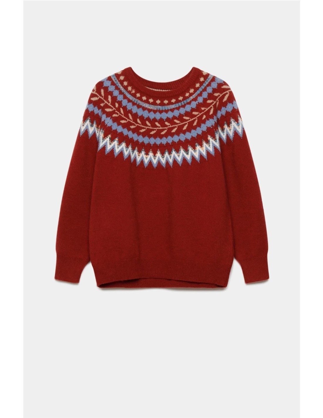 Jersey de punto con detalle de grecas en la parte superior, cuello redondo y terminaciones acanaladas. Disponible en cuatro colores