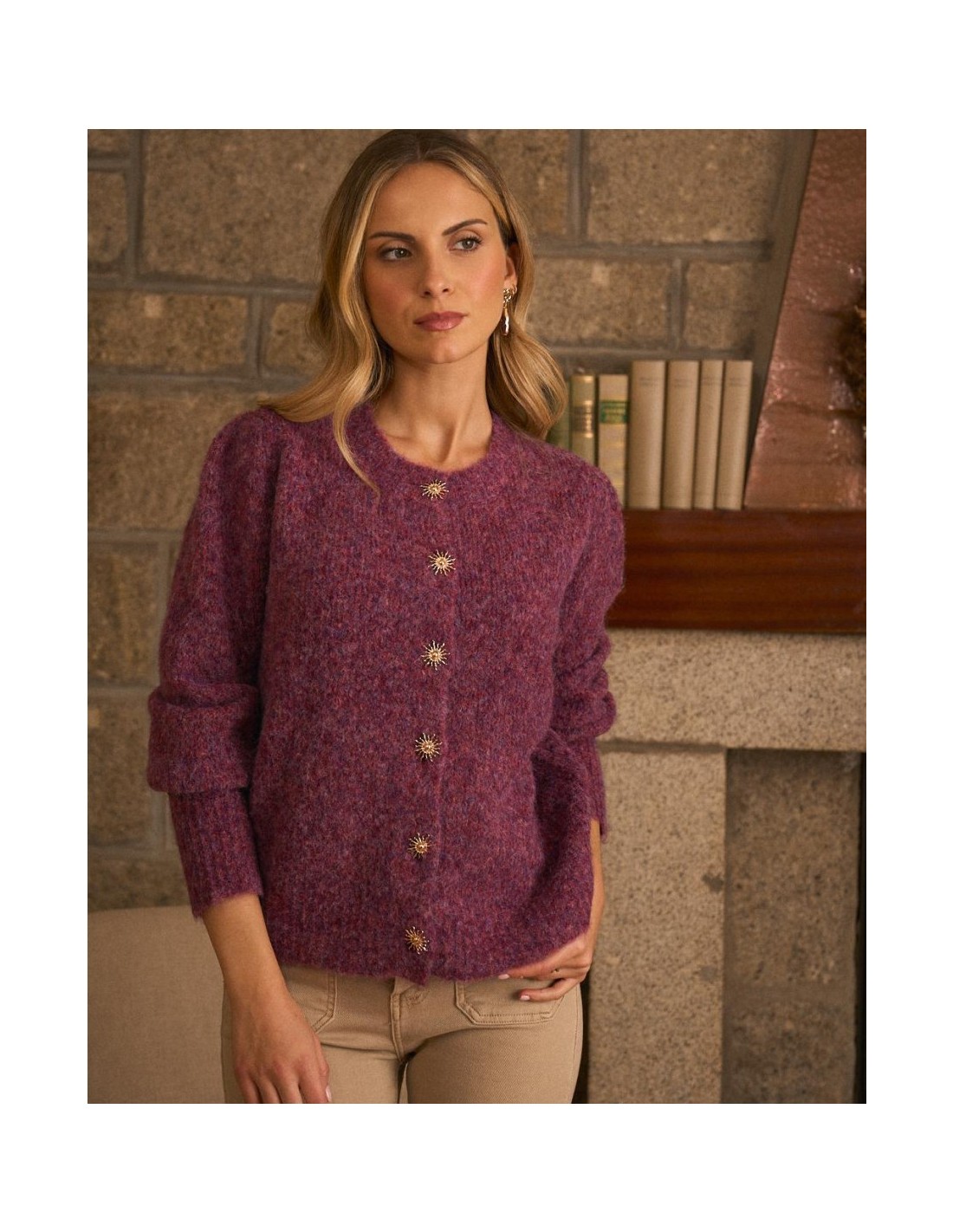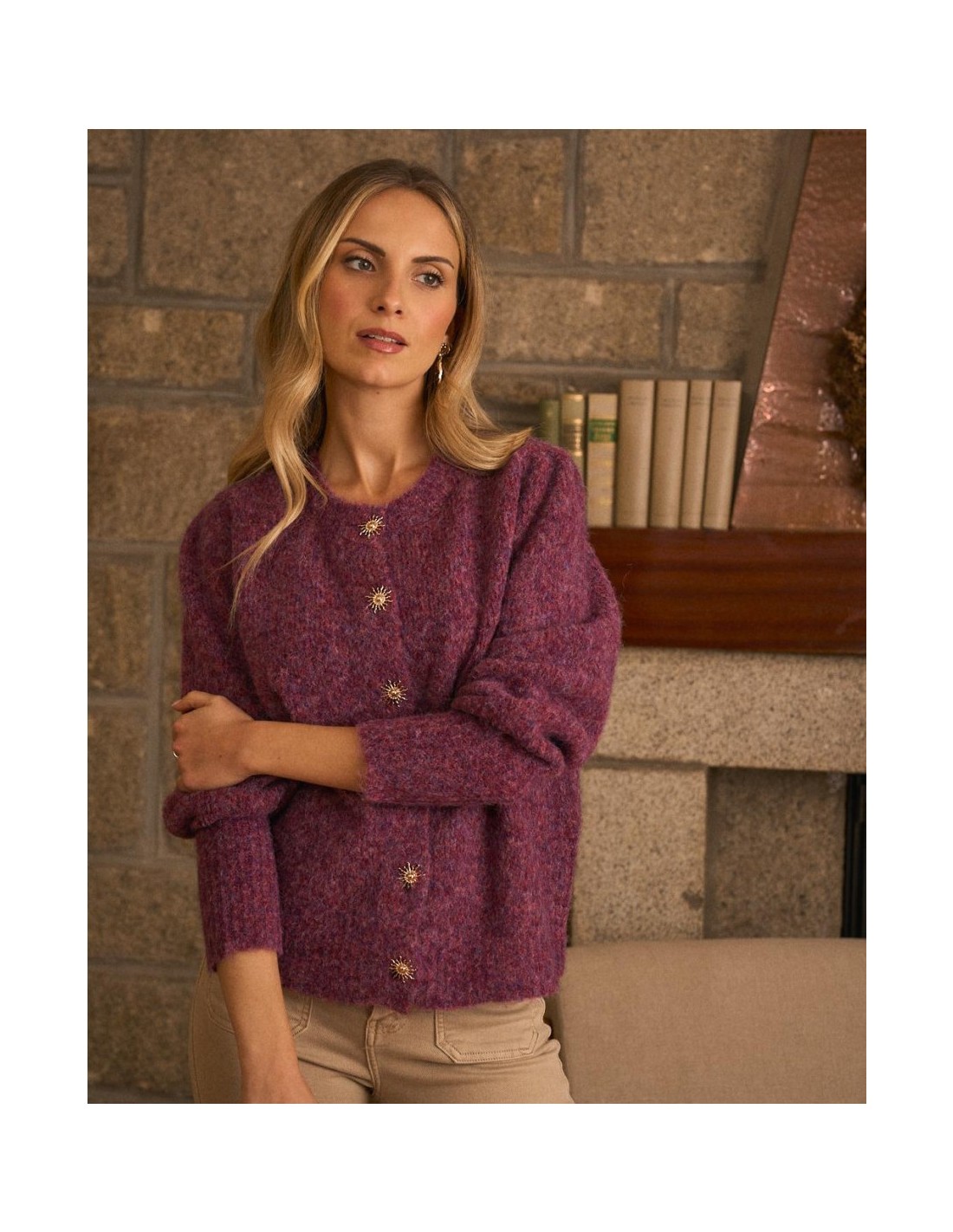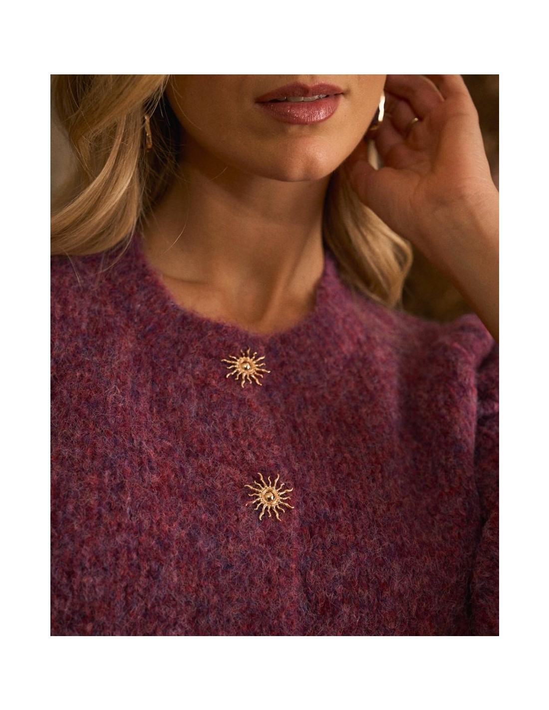 Rebeca de punto abotonada, en colores burdeos de la marca Polín Et Moi. Cuenta con un cuello redondo y textura suave, y detalle de soles dorados en los botones, que aporta un toque femenino y sofisticado.