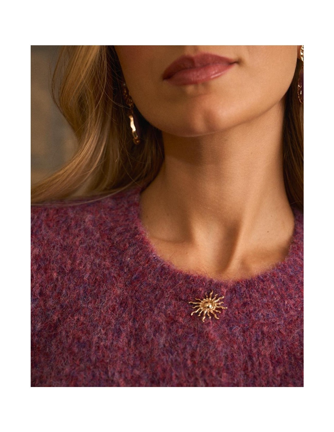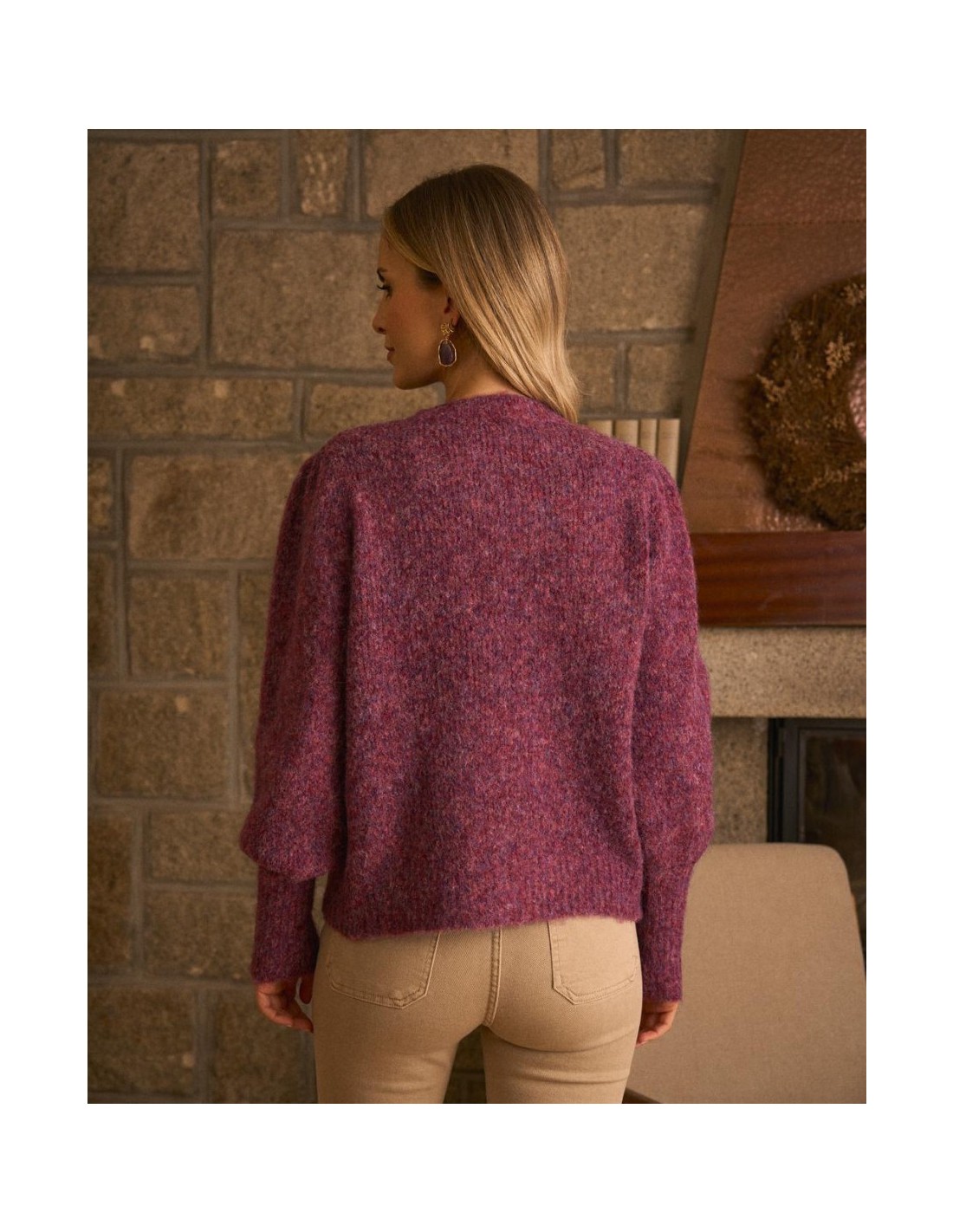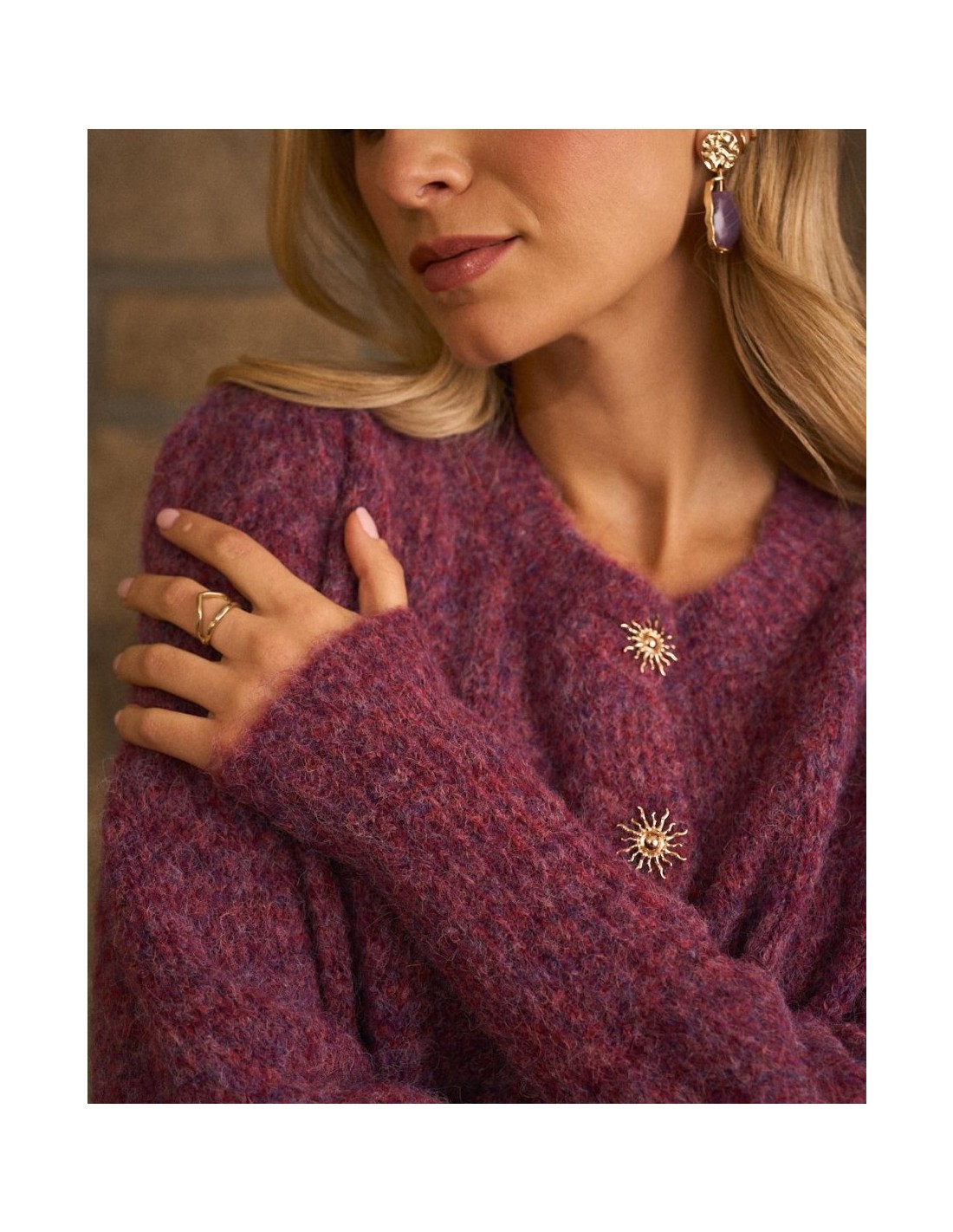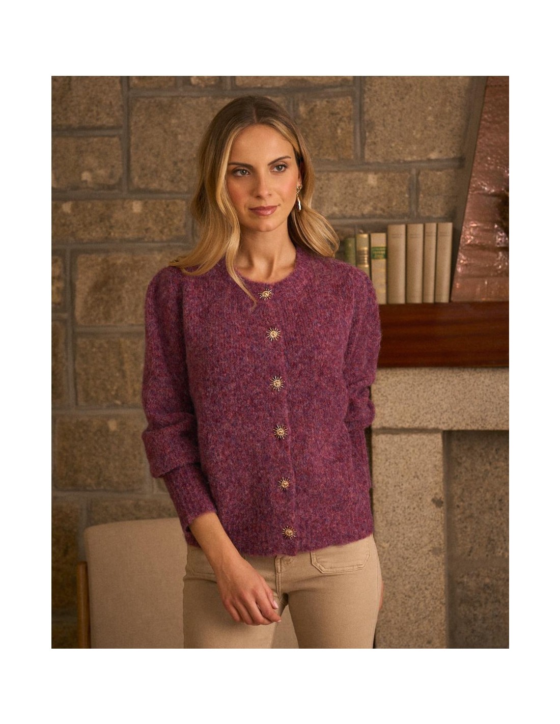 Rebeca de punto abotonada, en colores burdeos de la marca Polín Et Moi. Cuenta con un cuello redondo y textura suave, y detalle de soles dorados en los botones, que aporta un toque femenino y sofisticado.