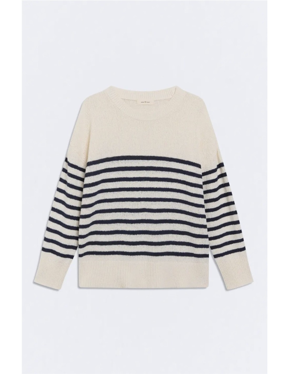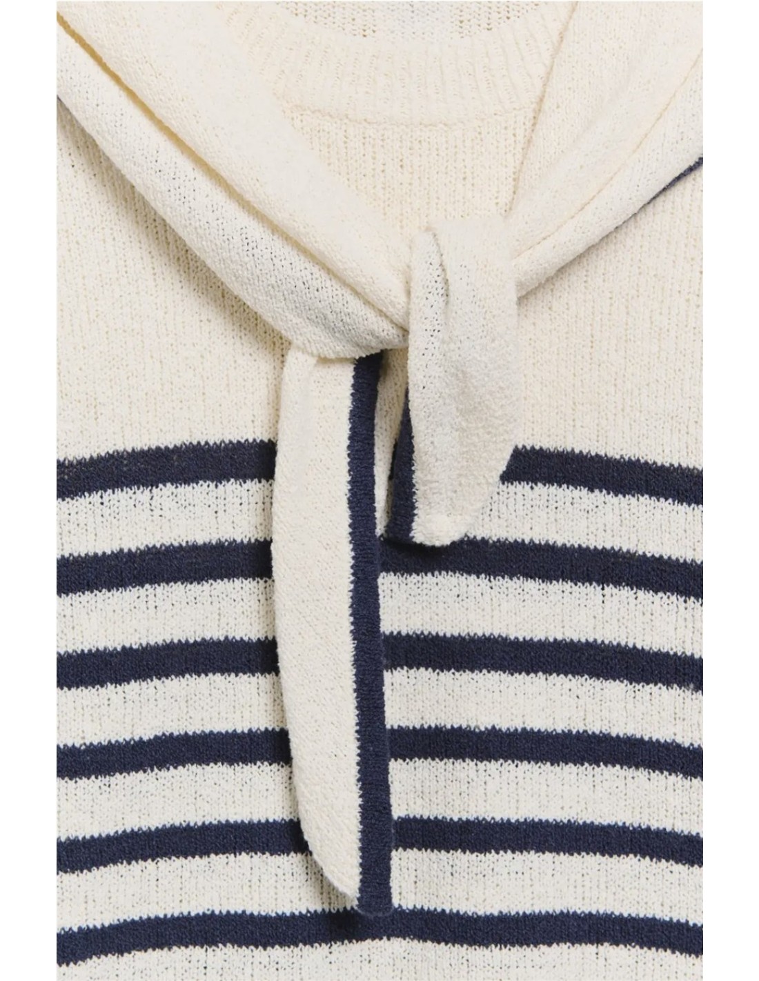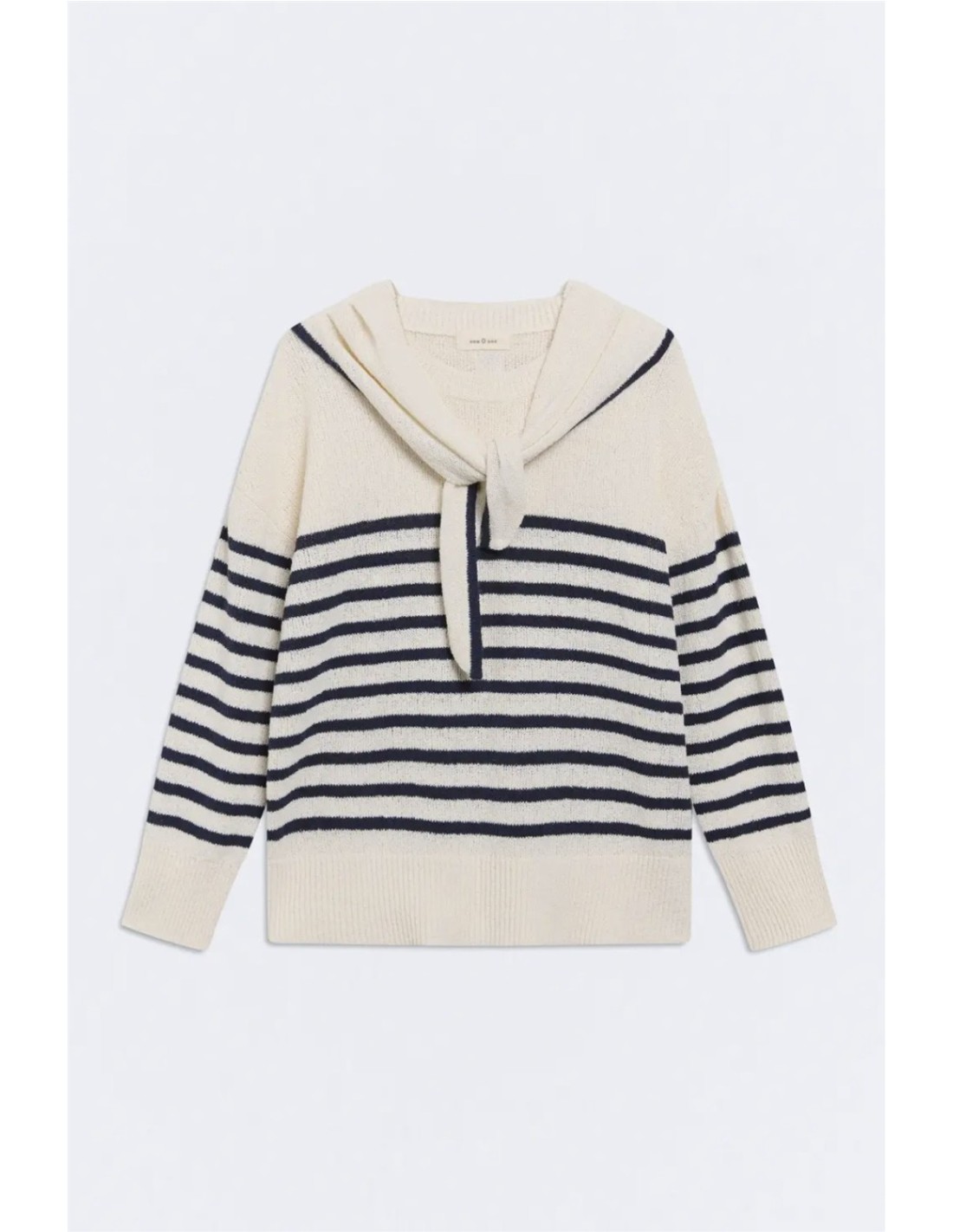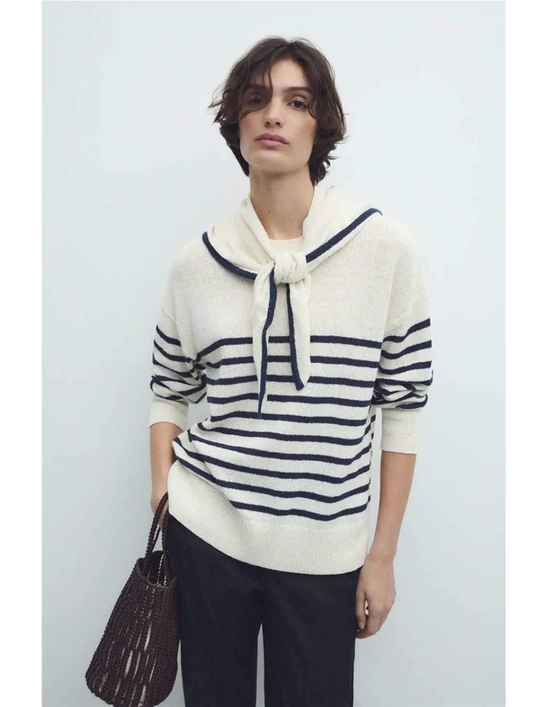 Jersey y toquilla de estilo náutico blanco con rayas azul marino de la marca Ese O ese.  Tejido de grosor medio con composición de lino y algodón. El cuello es tipo caja.