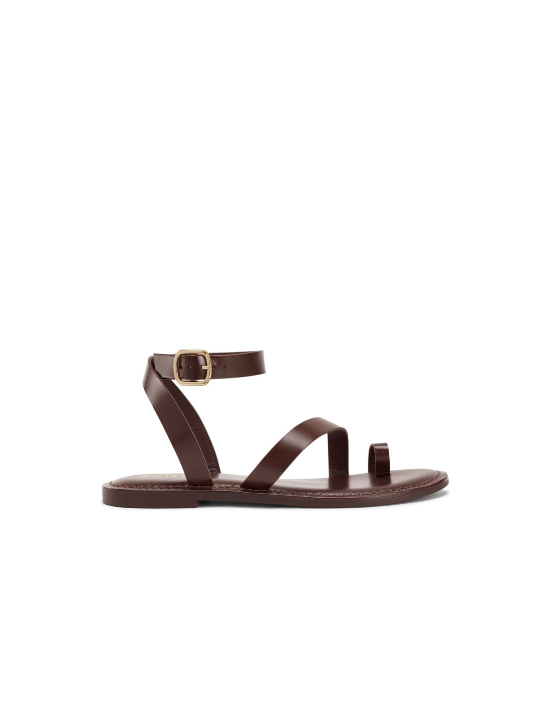 Sandalia plana en color marrón chocolate con hebilla regulable al tobillo.
