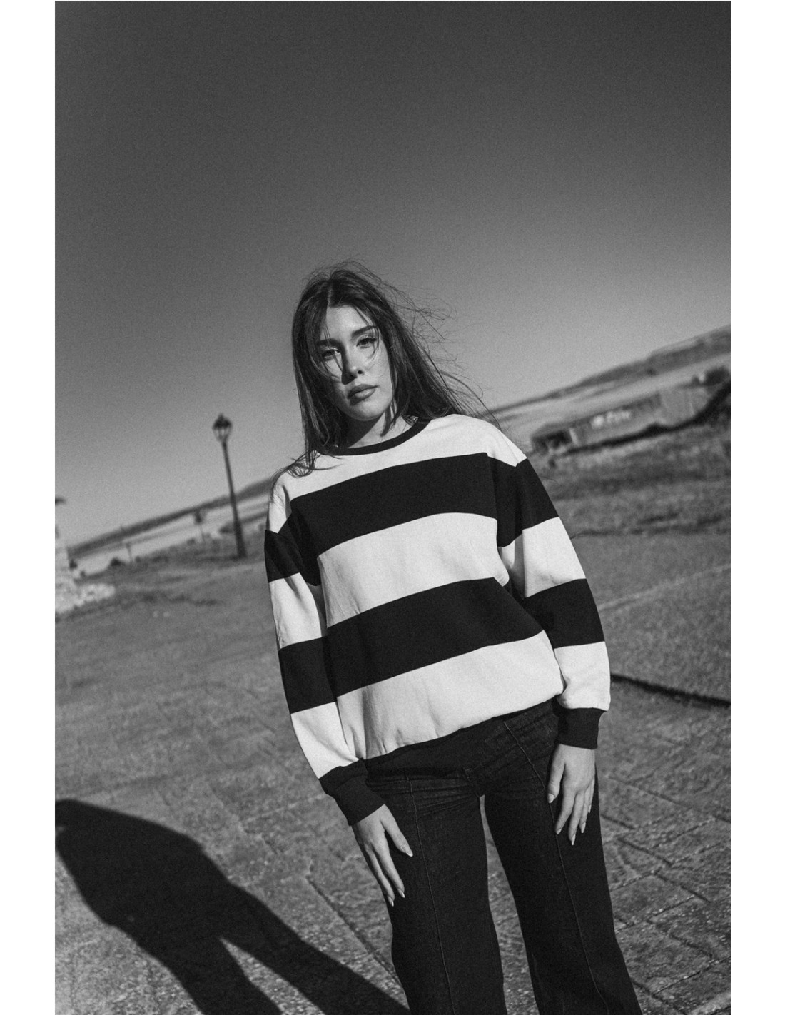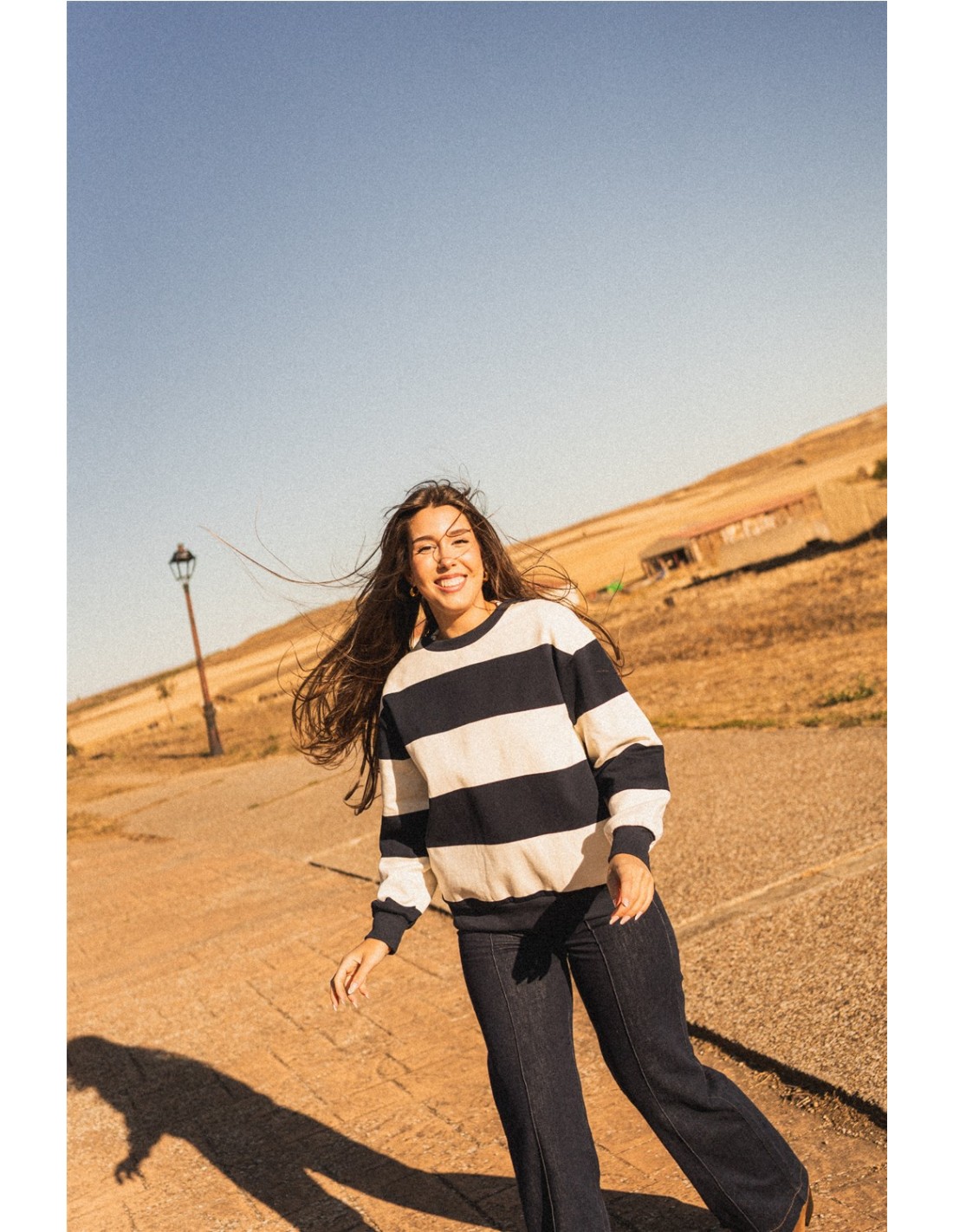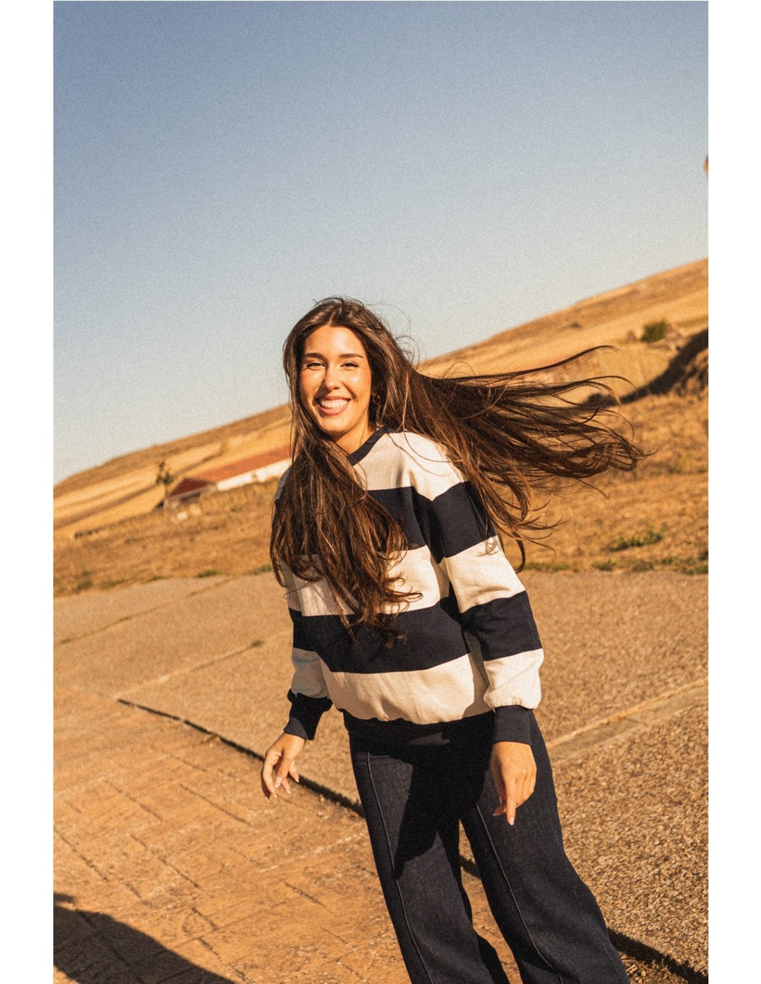 Sudadera oversieze en rayas disponible en verde y azul marino. Cuenta con bolsillos laterales, cuello redondo y terminaciones en ribete.