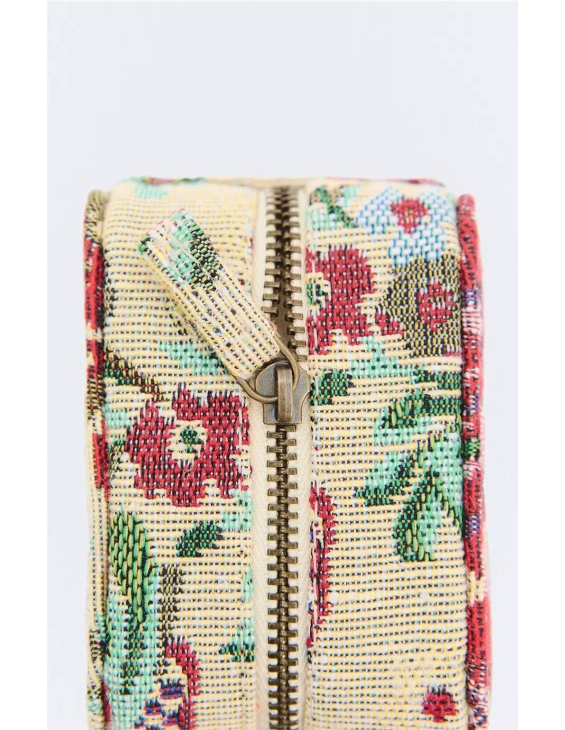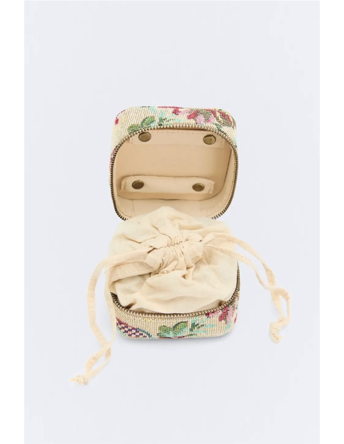 Joyero de viaje con tejido jacquard de la marca Ese O Ese. Estampado de flores. Forro de algodón. Cierre con cremallera
