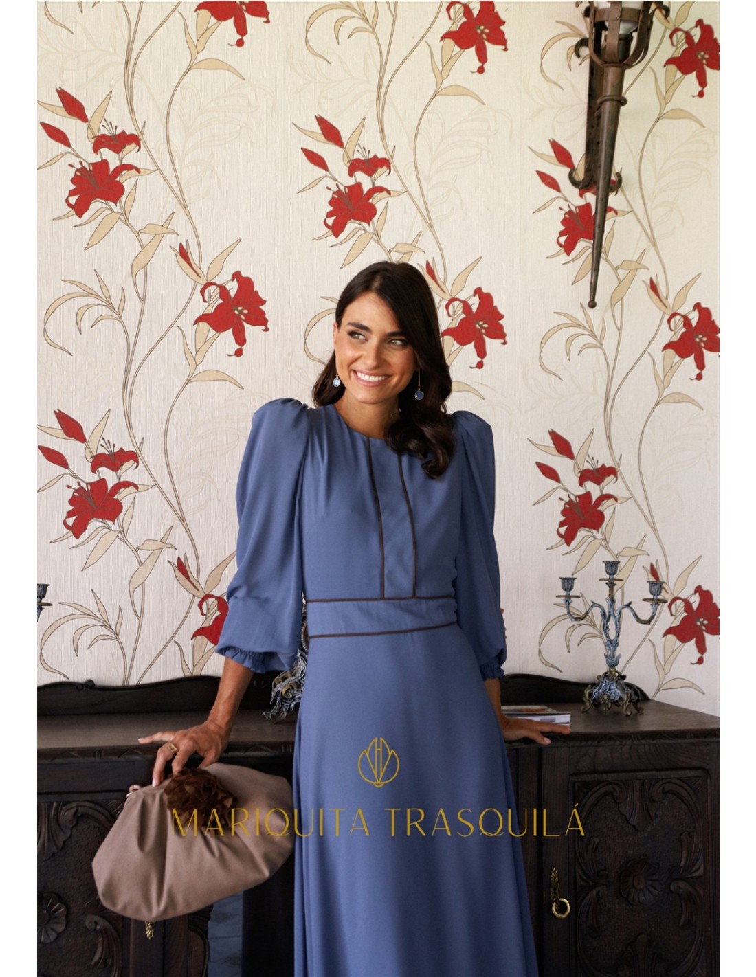 La cintura entallada con detalle de vivos en contraste estiliza la silueta, mientras que la falda larga y vuelo. Su tono azul lo convierte en una opción muy favorecedora y versátil para lucir en bodas de día.