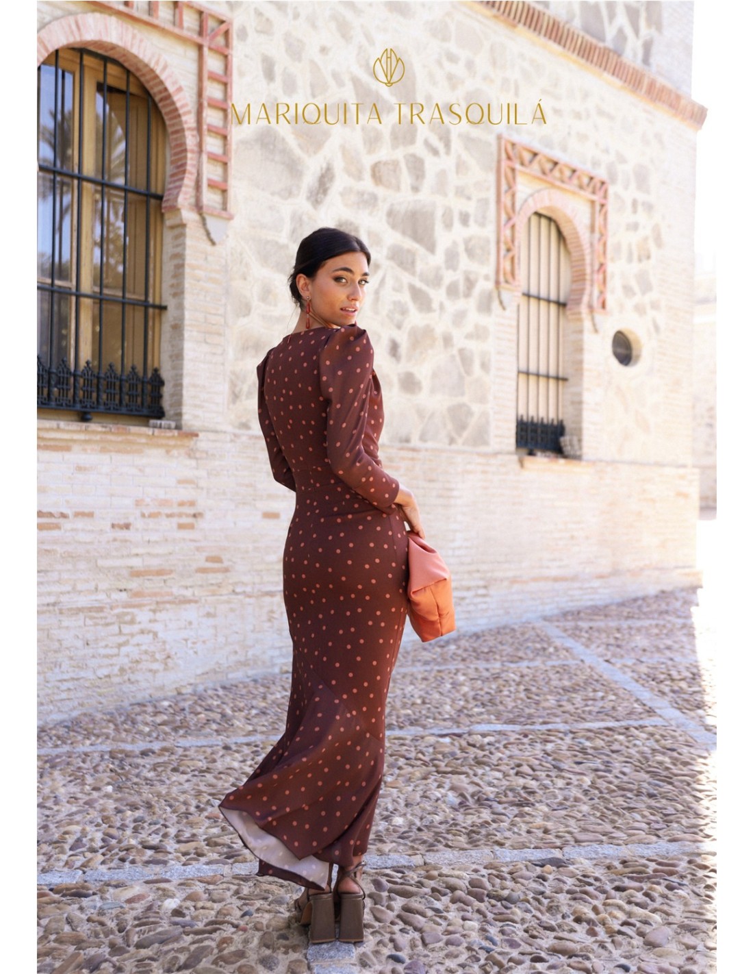 El Vestido de Lunares Brida de Mariquita Trasquilá es ese diseño que lo tiene todo. Tiene un escote cruzado en V, mangas largas con hombro abullonado y estructura en la parte superior que estiliza muchísimo. Su tejido con lunares en tono coral sobre base chocolate lo convierte en un vestido lleno de encanto y tendencia.