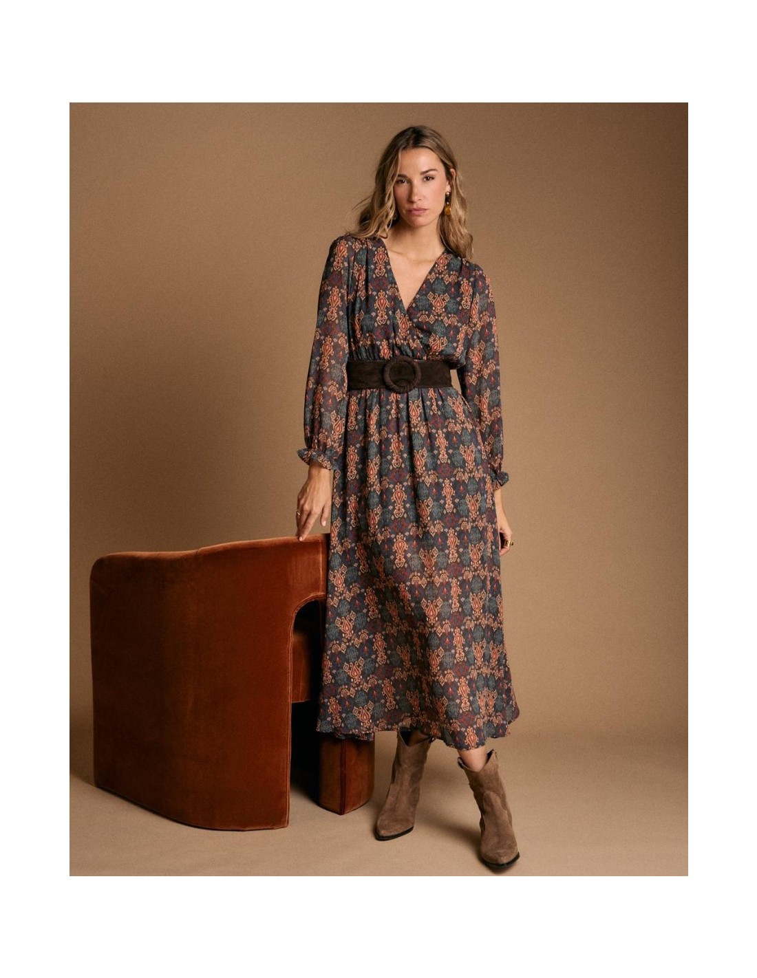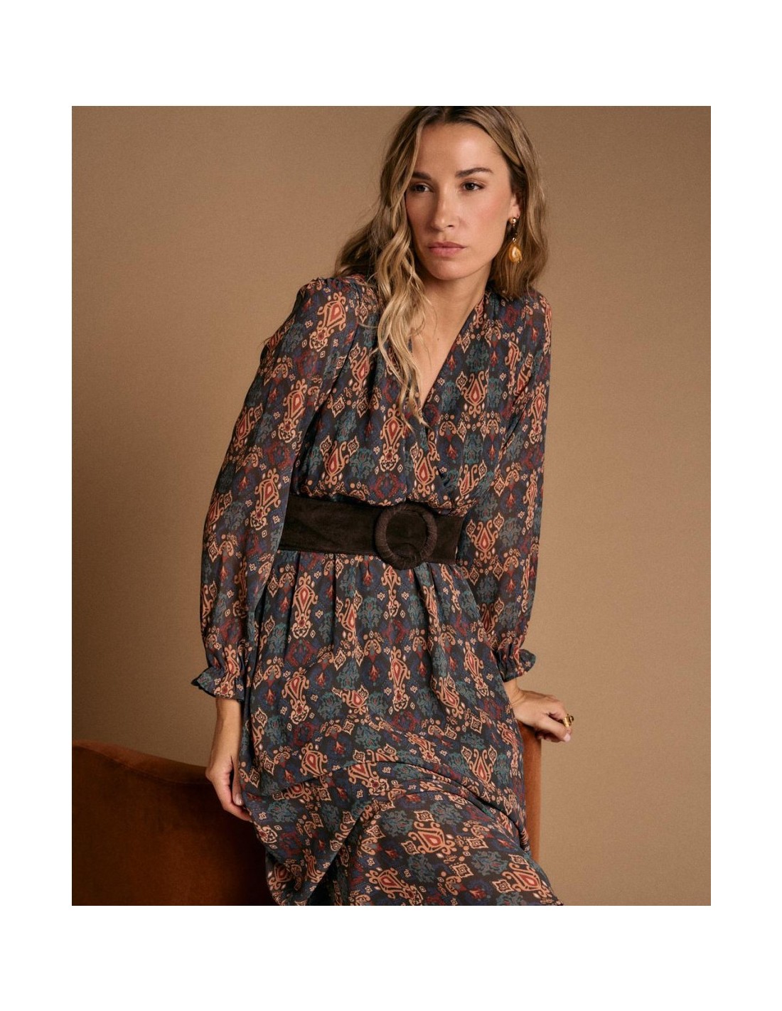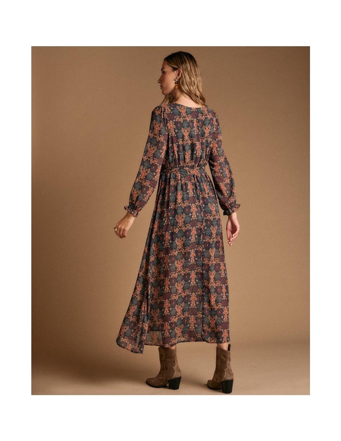 Vestido largo con estampado paisley en tonos azules y cálidos de la marca Polín Et Moi. Diseño de manga larga, escote en pico y corte elástico en la cintura para un ajuste femenino.