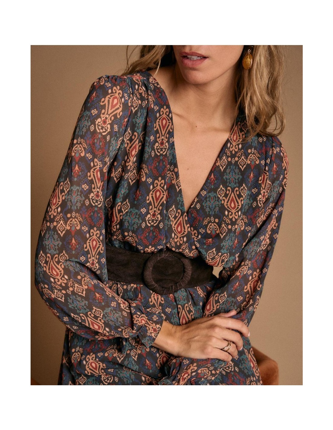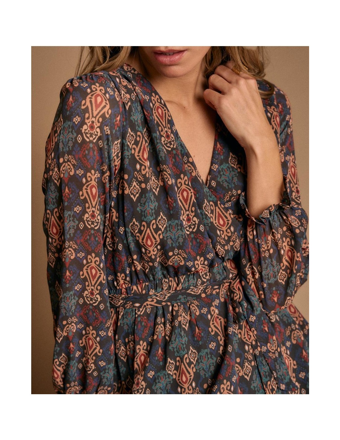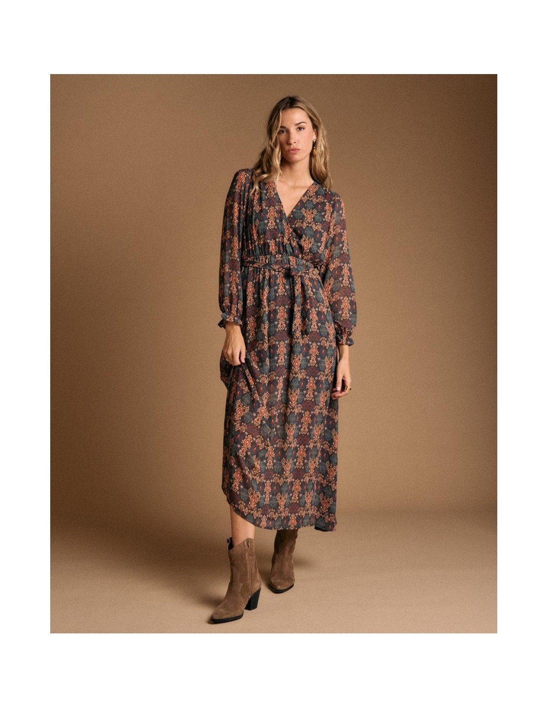 Vestido largo con estampado paisley en tonos azules y cálidos de la marca Polín Et Moi. Diseño de manga larga, escote en pico y corte elástico en la cintura para un ajuste femenino.