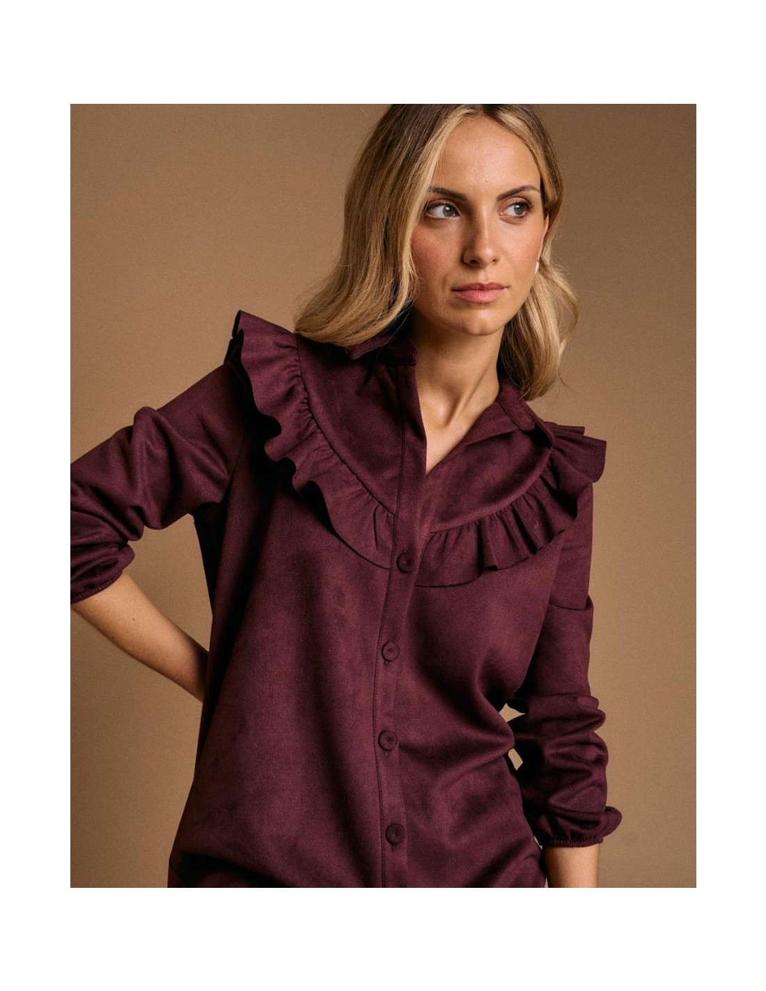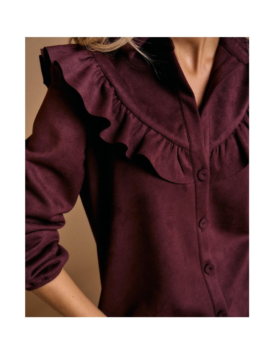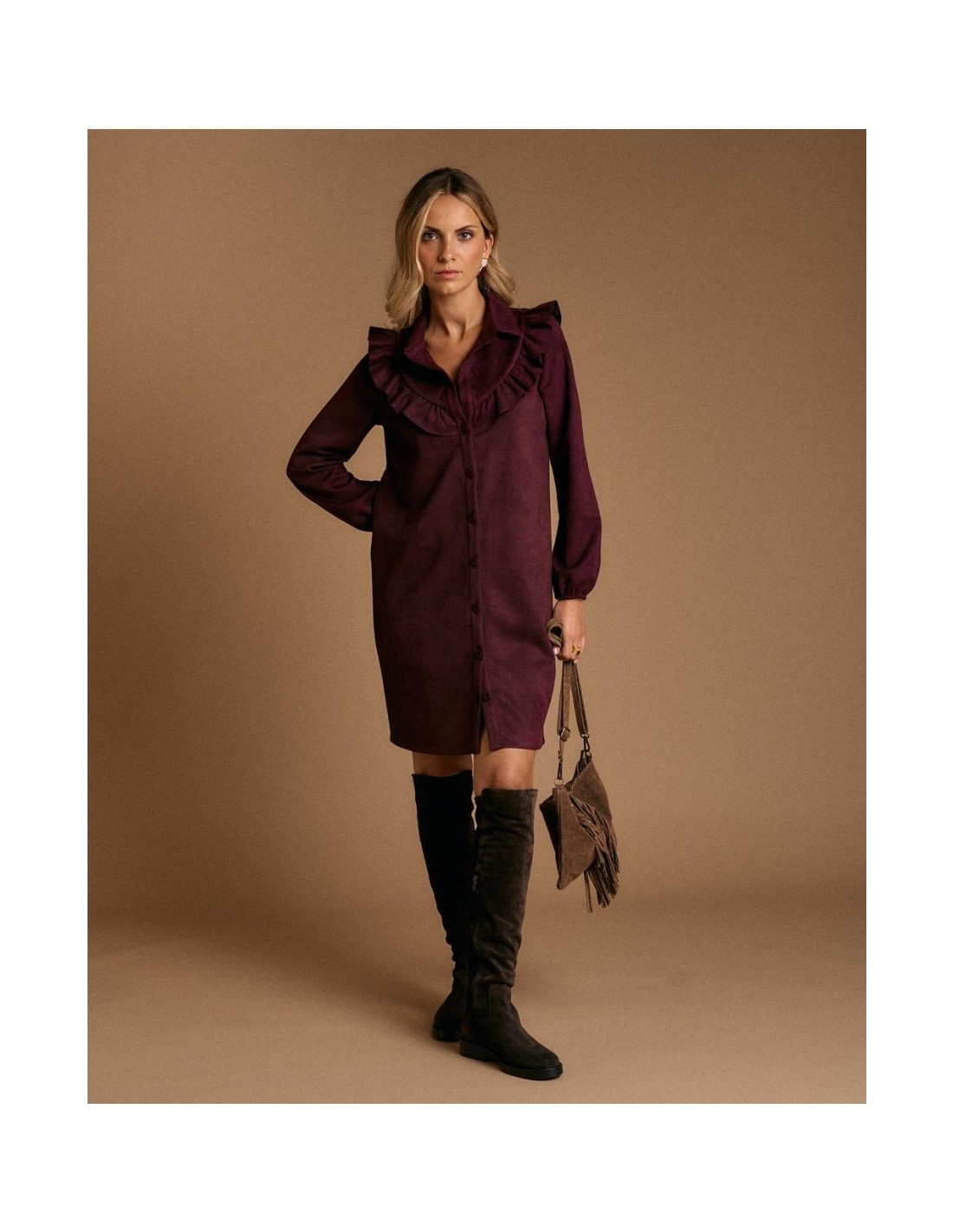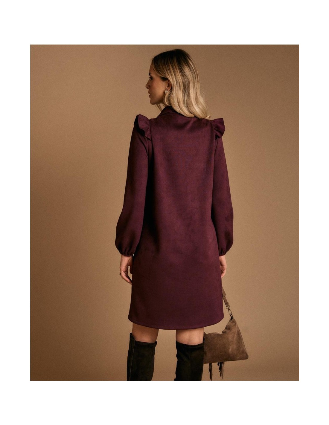 Vestido de efecto ante en color berenjena. Diseño con detalle de volante en el cuello y parte delantera, cierre con botones y manga larga con puño ajustado.