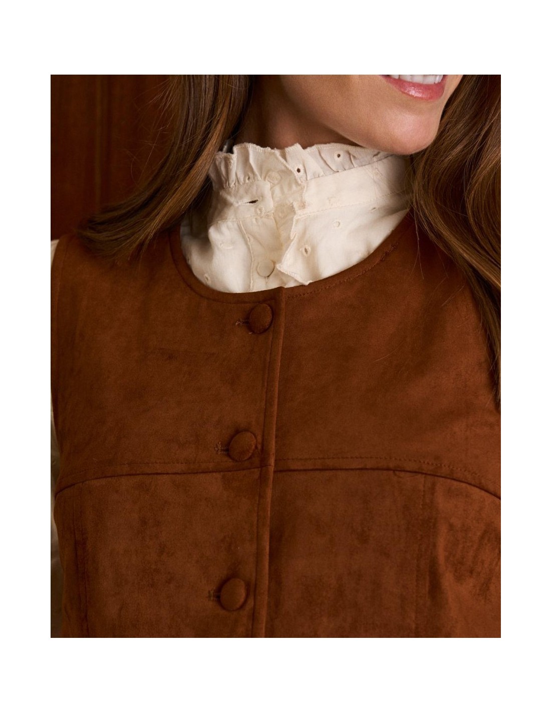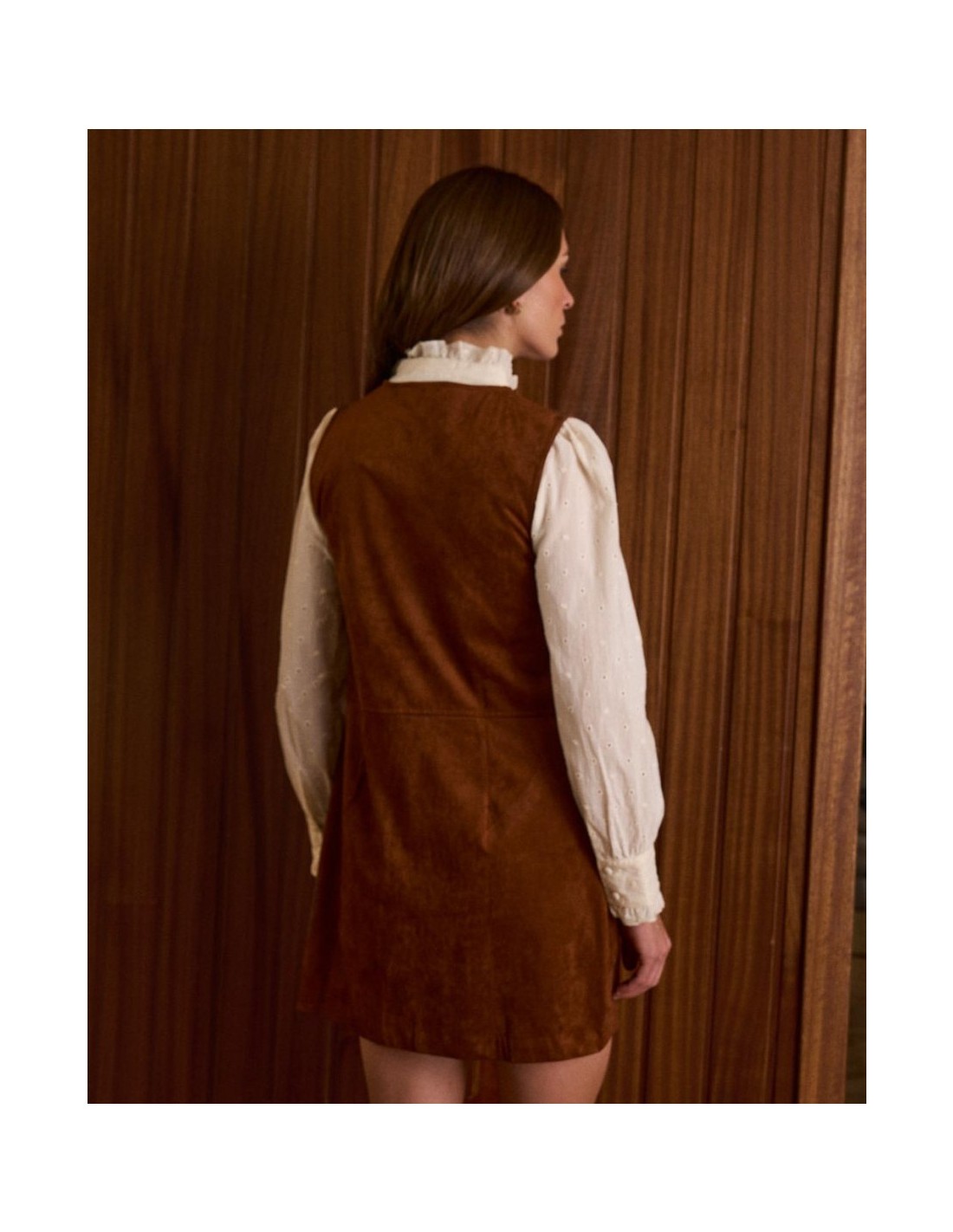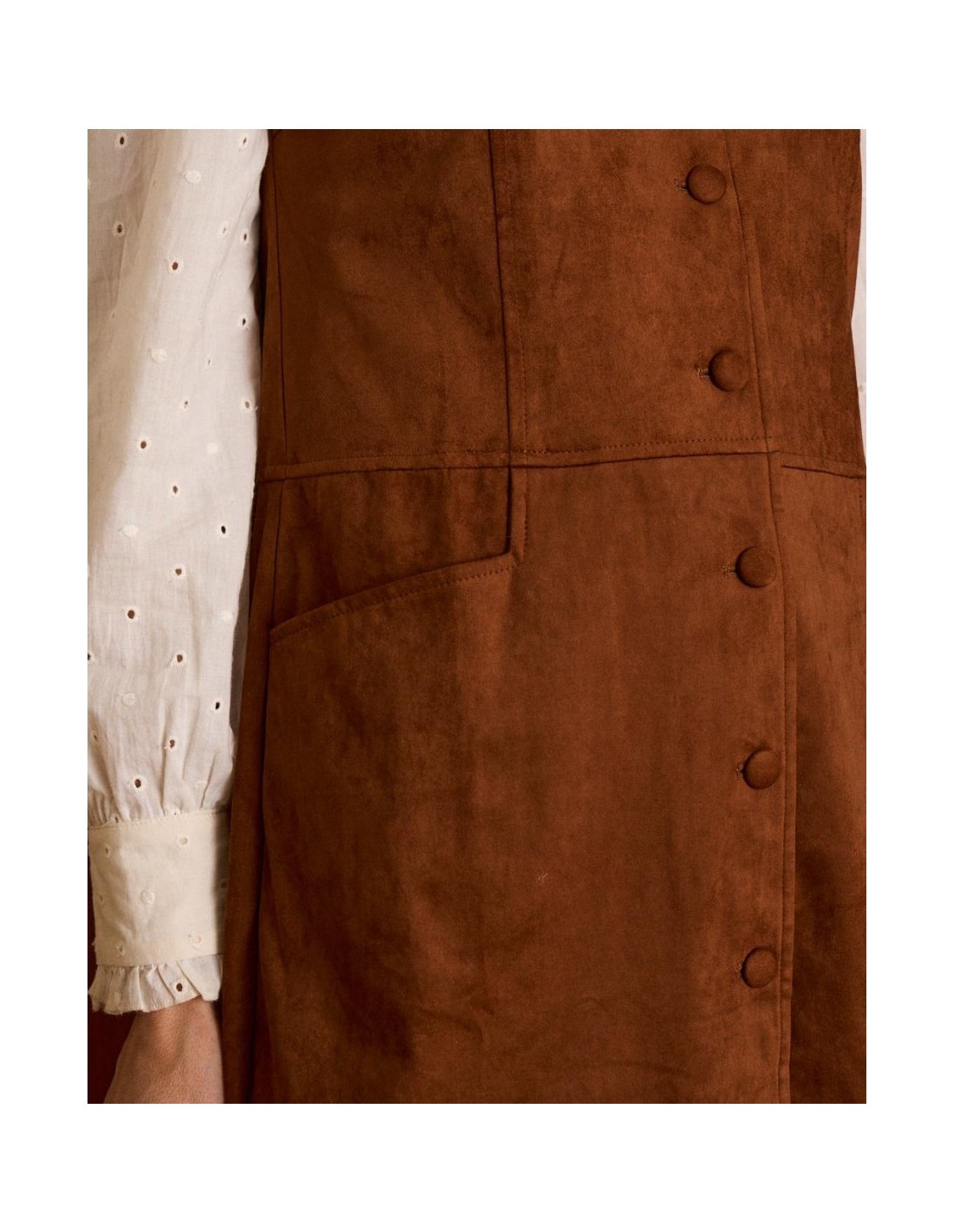 Pichi de antilina abotonado en color camel de la marca Polín et Moi. Cuenta con tirantes anchos, bolsillos y botones en la parte frontal para un ajuste cómodo.